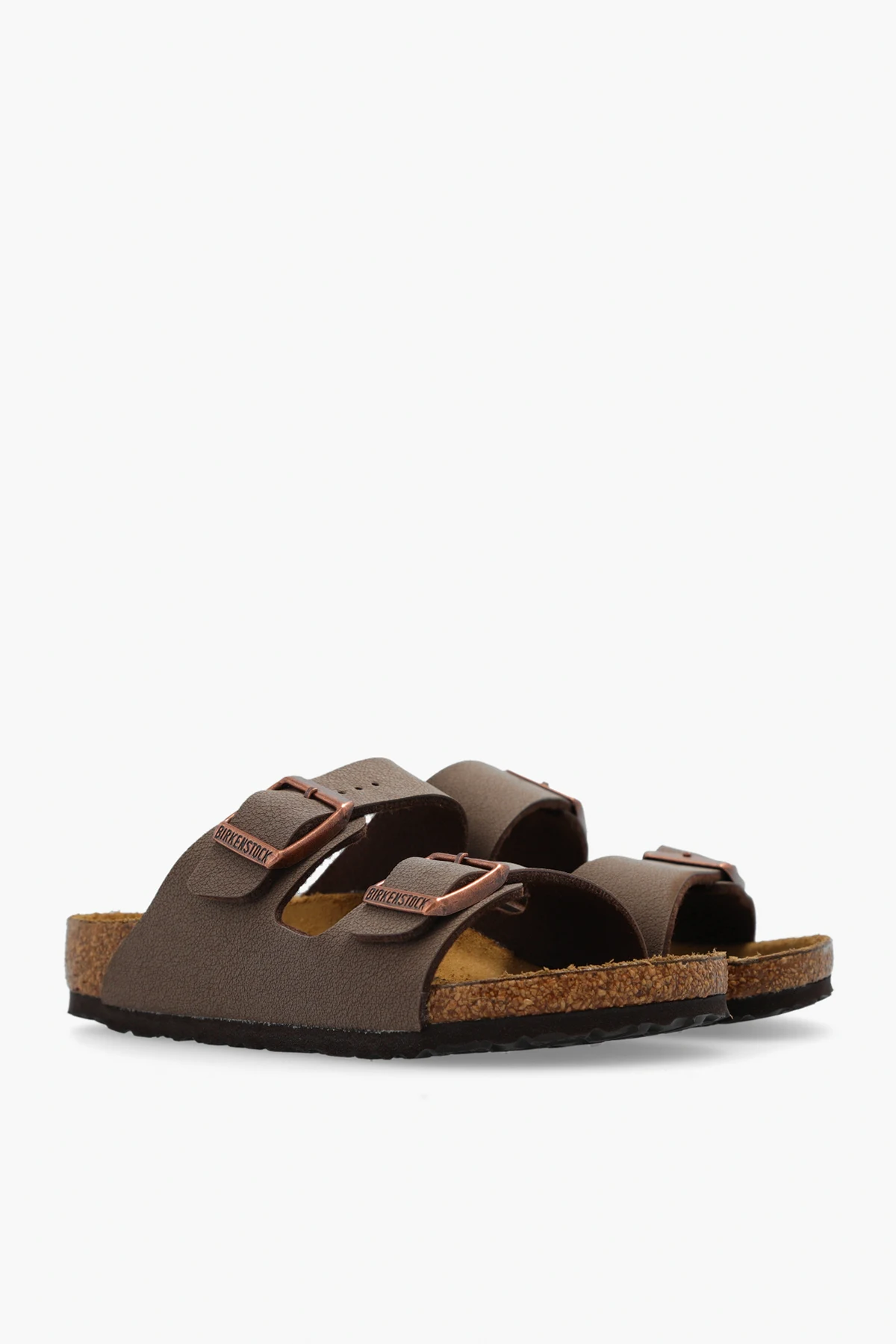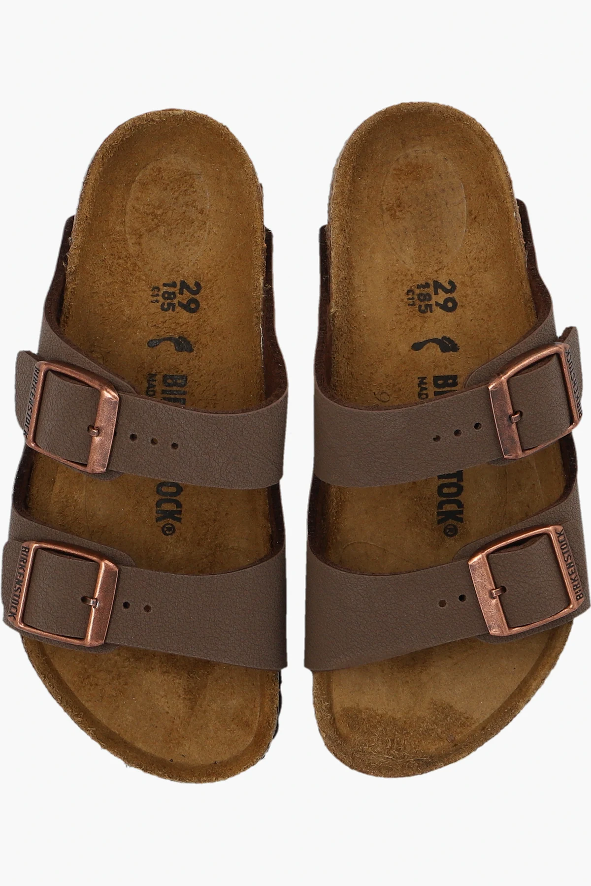 Brązowe klapki, model ‘Arizona’ Birkenstock Kids. Cholewka o zwężanej szerokości. Materiał wierzchni stanowi przyjazne dla skóry i wytrzymałe tworzywo Birko-Flor® o wyglądzie skóry nubukowej. Regulowane paski z klamrą z wytłoczonym logo. Z boku wytłoczone logo w kolorze czarnym. Anatomicznie ukształtowana wkładka wykończona skórą welurową. Ciemnobrązowa podeszwa z pianki EVA.