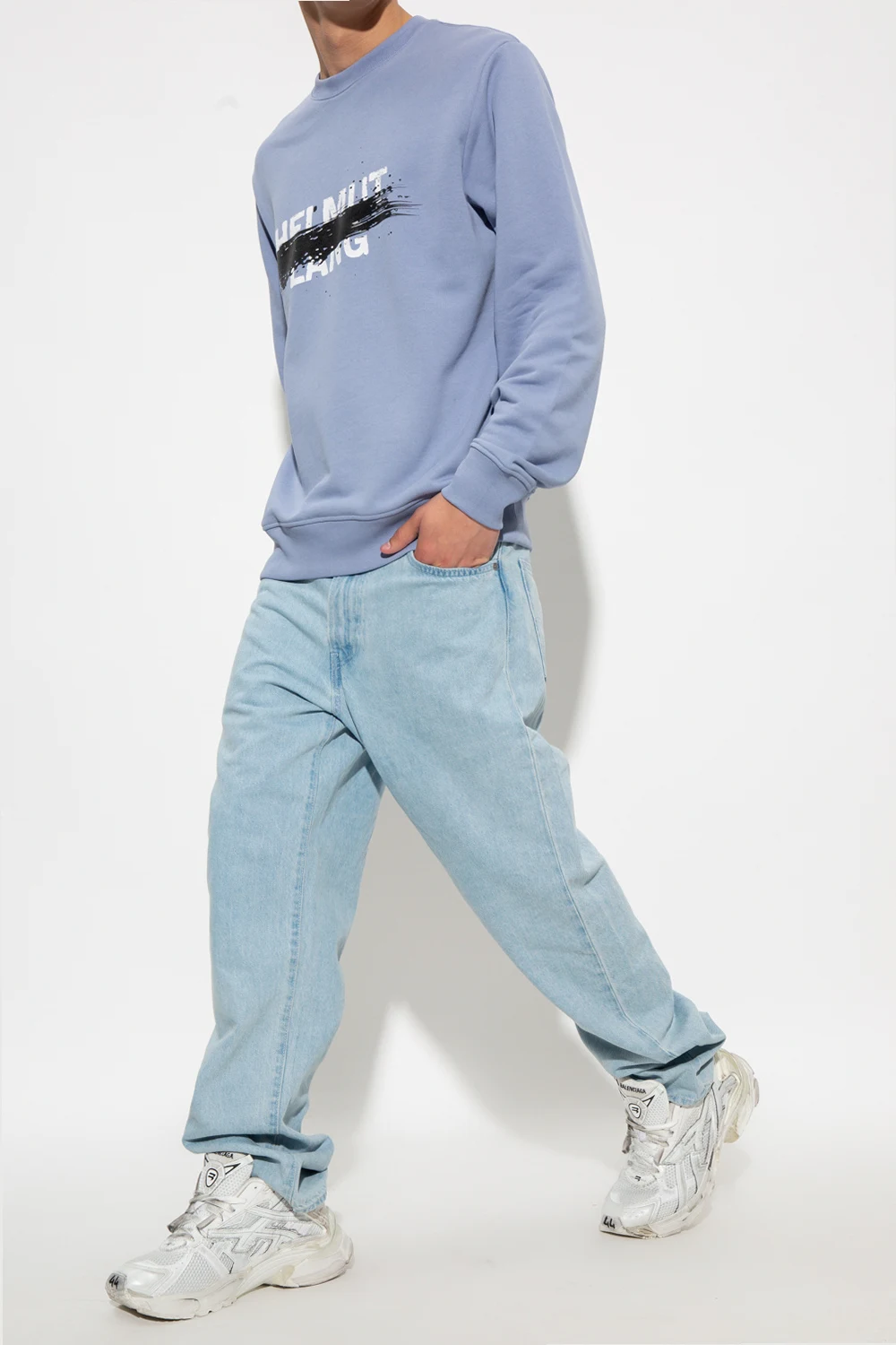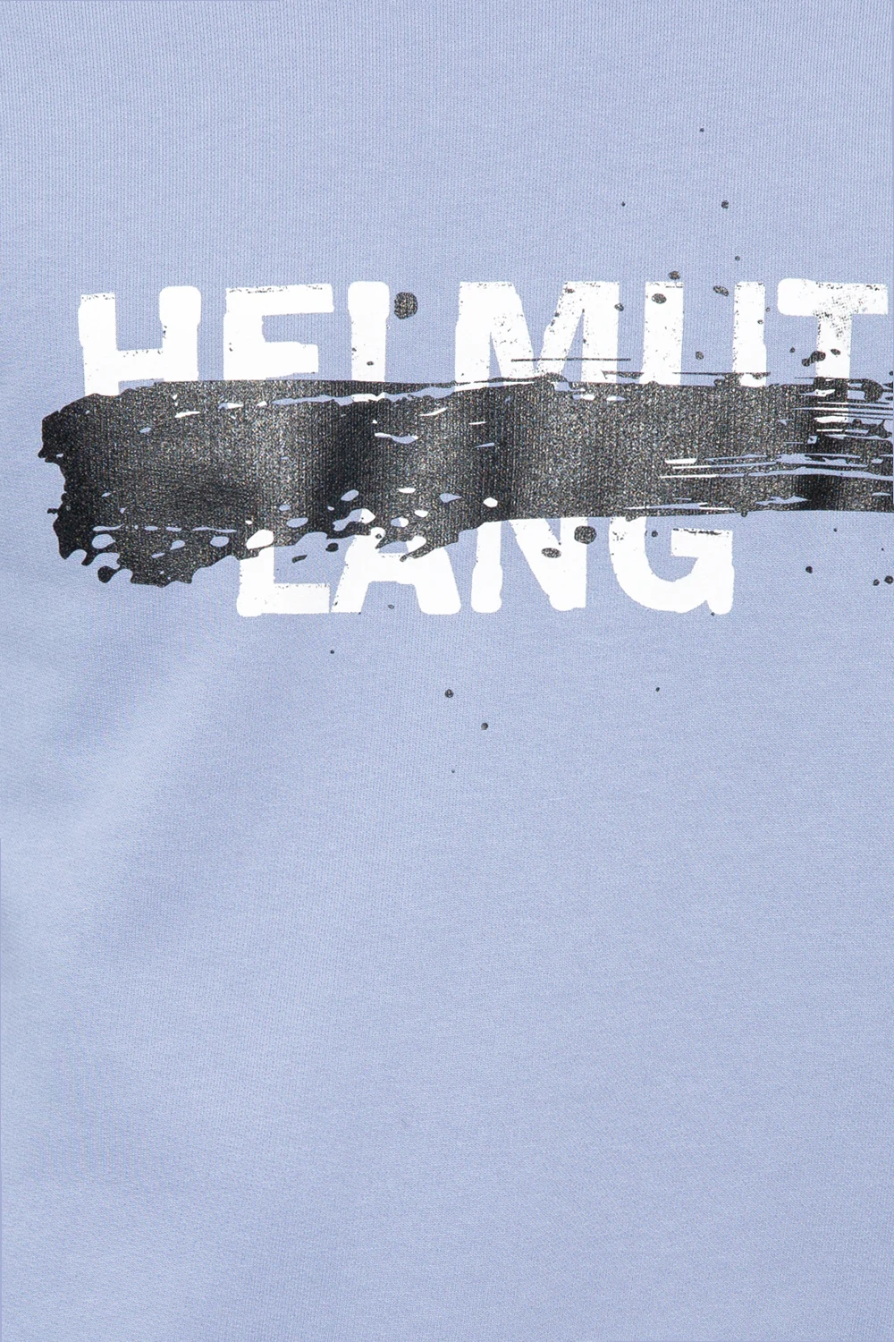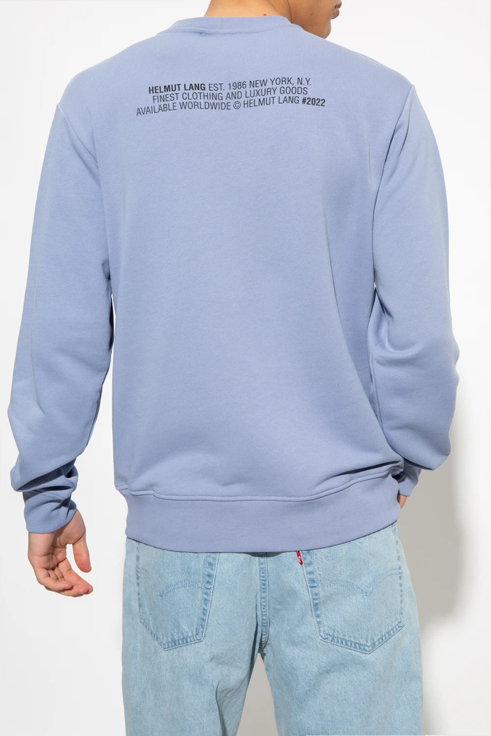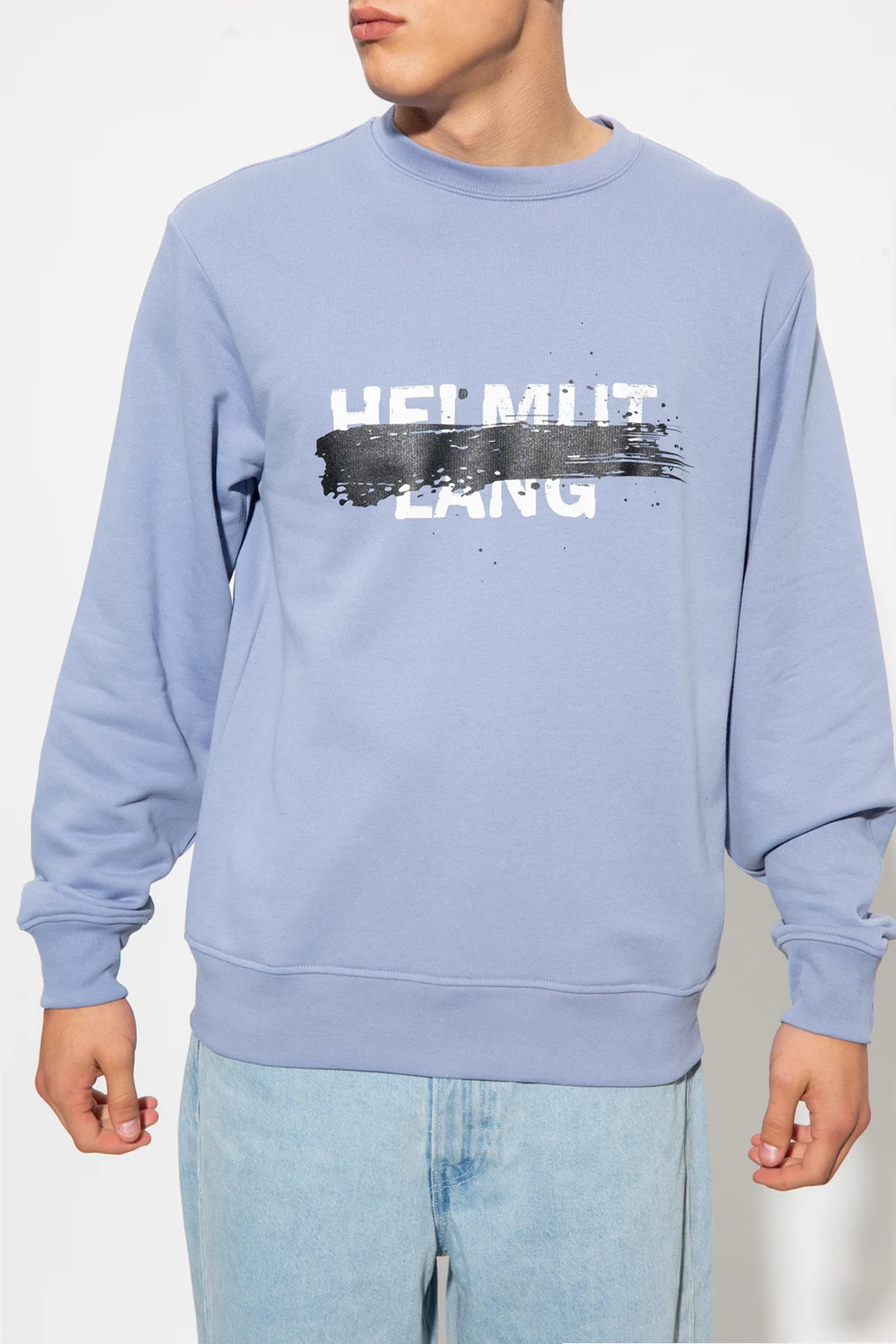 Niebieska bluza o luźnym kroju Helmut Lang. Wykonana z bawełny. Ozdobiona biało-czarnym nadrukiem z logo. Okrągły dekolt, długie rękawy i dół zakończone ściągaczem.