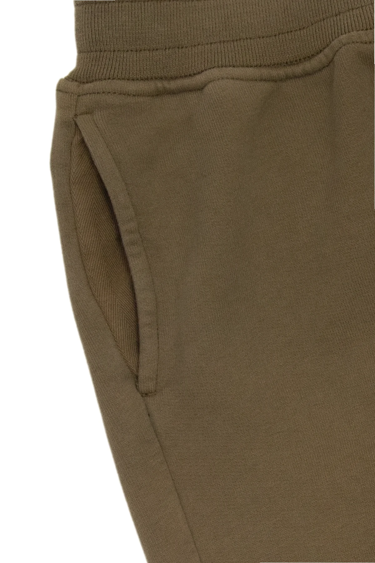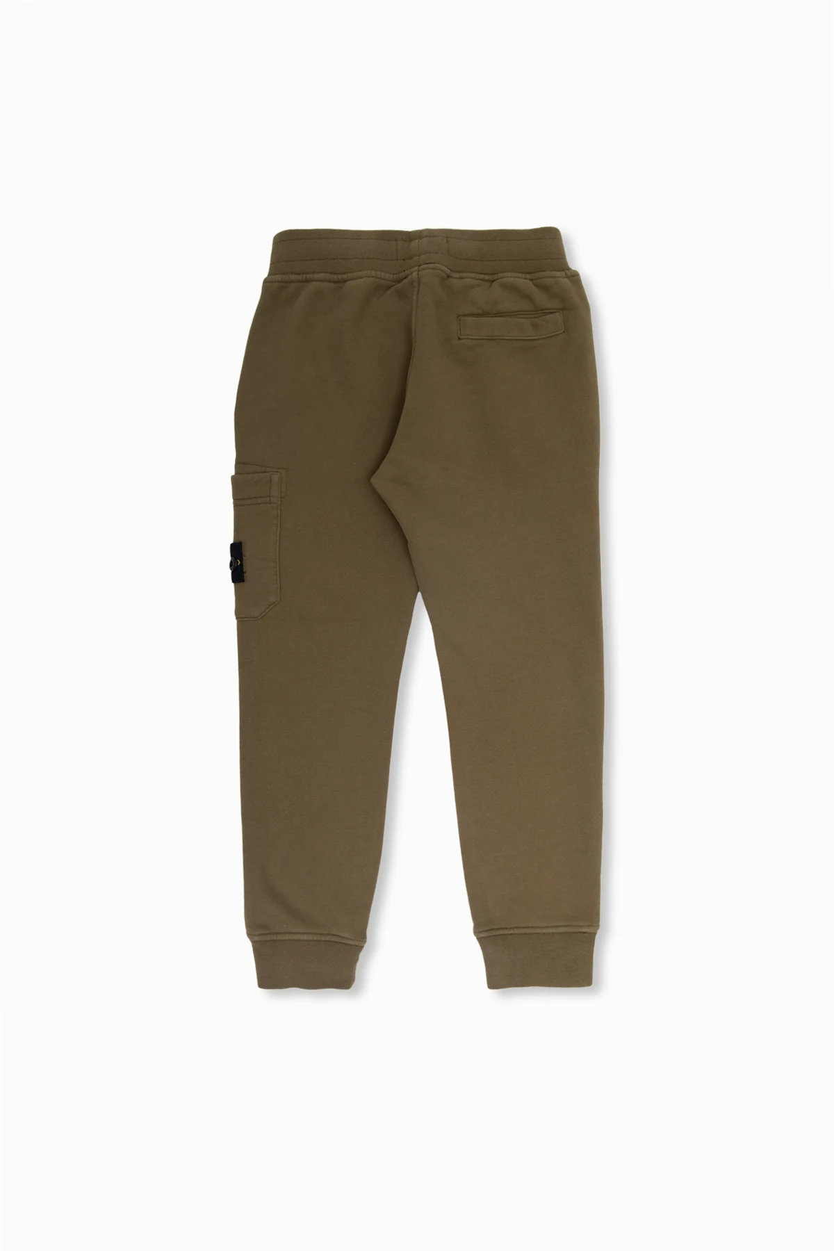Zielone spodnie Stone Island Kids. Wykonane z bawełny. W pasie wszyta guma ściągana trokami. Ozdobione naszywką z logo. Cztery kieszenie. Nogawki zakończone ściągaczem.