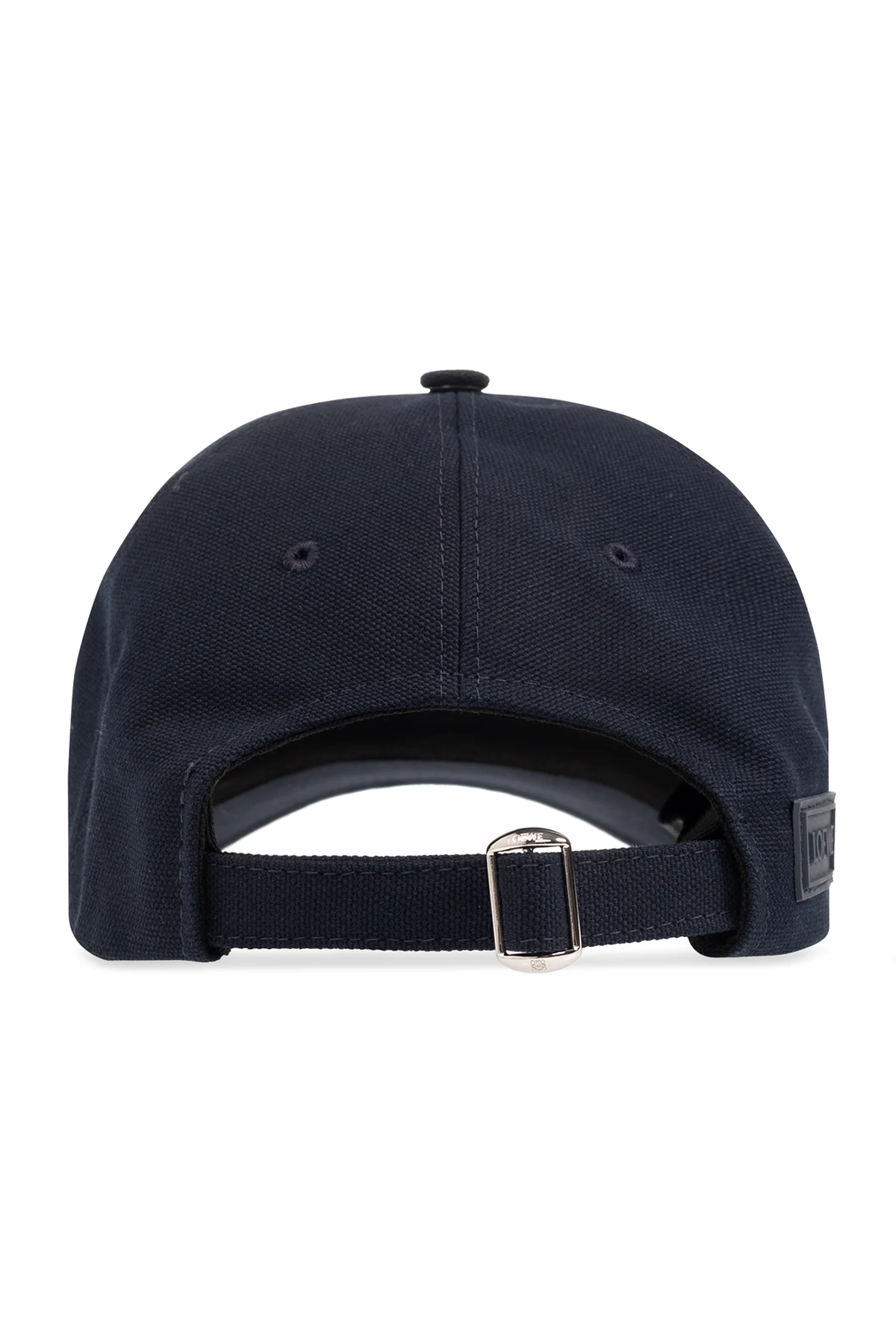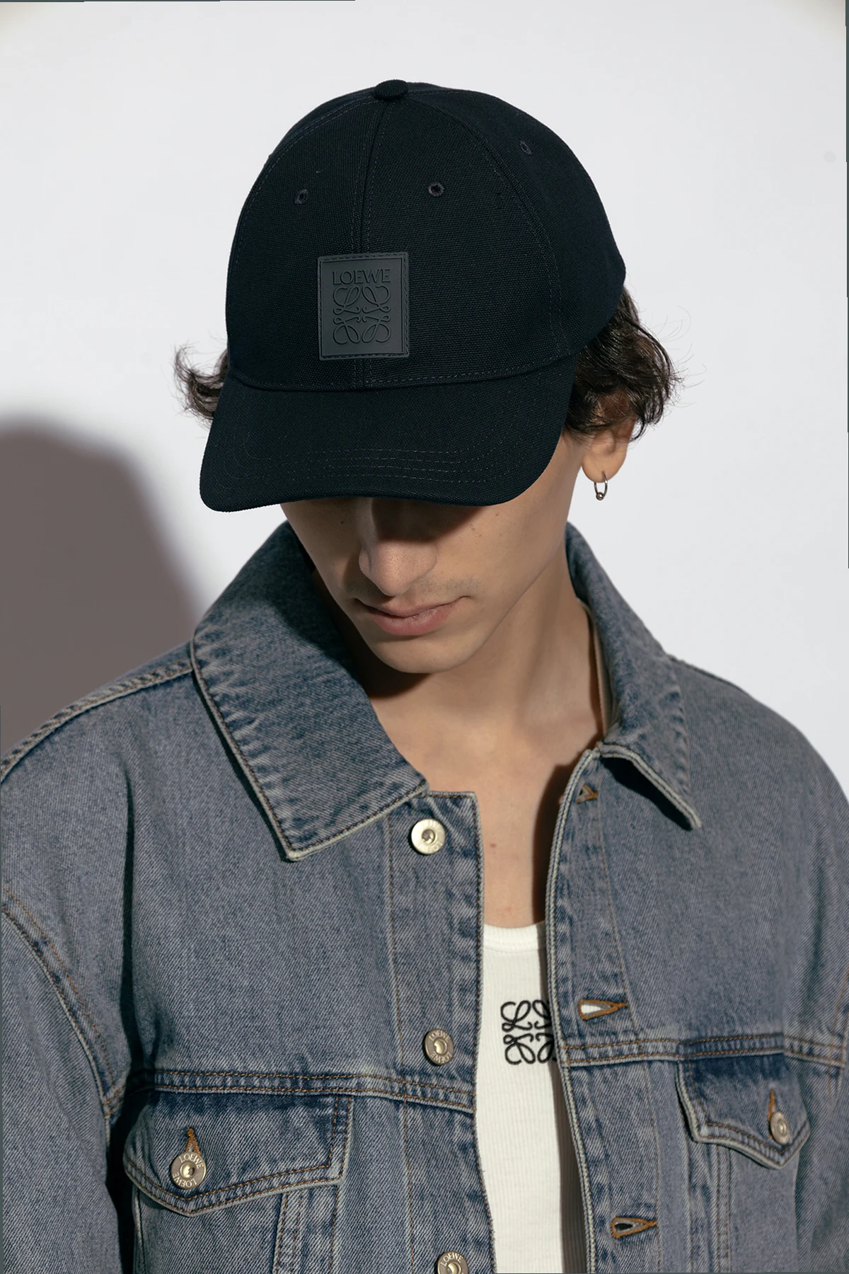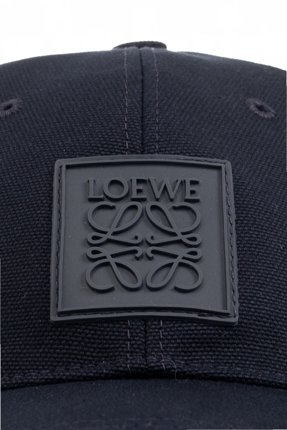 Granatowa czapka z daszkiem Loewe. Wykonana z bawełny. Ozdobiona naszywką z logo. Z tyłu regulowana na pas z klamrą.