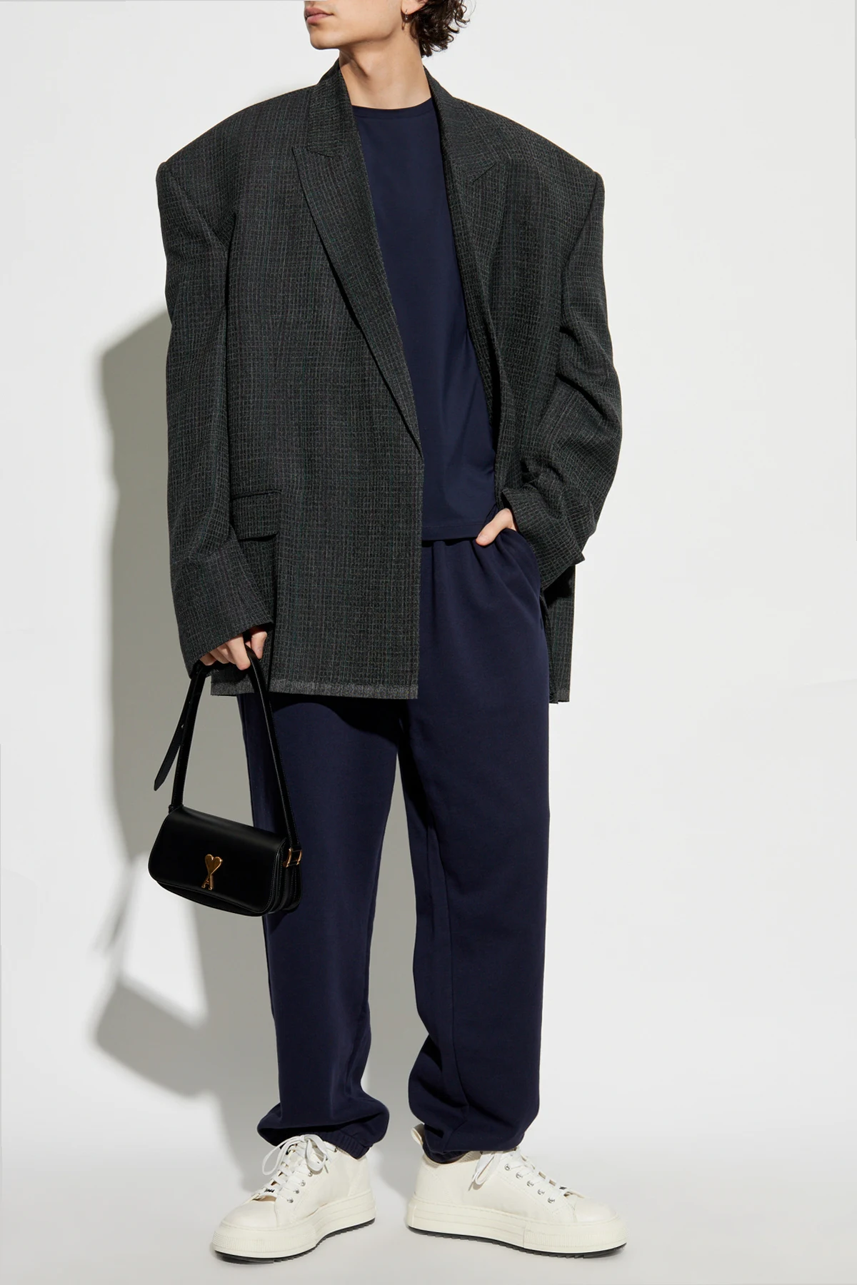 Granatowy kolor nadaje im uniwersalnego charakteru, co w połączeniu z klasycznym krojem oraz elastycznym pasem i ściągaczami na dole nogawek, czyni je idealnym wyborem dla miłośników komfortu i stylu. Dyskretna naszywka z logo projektanta subtelnie podkreśla ich ekskluzywność.