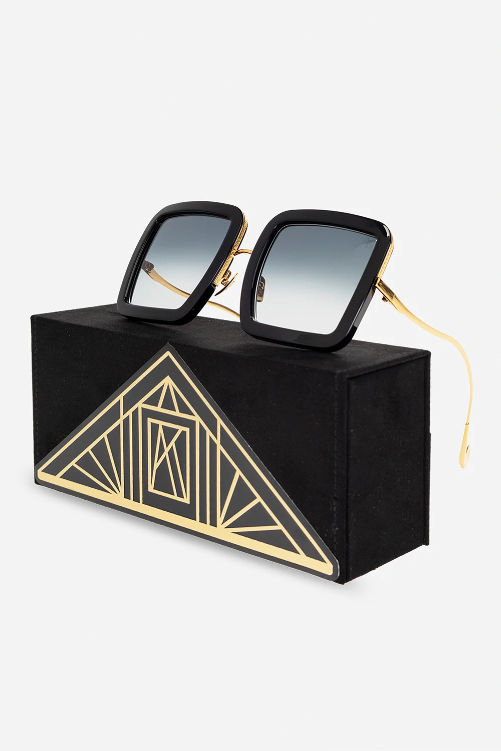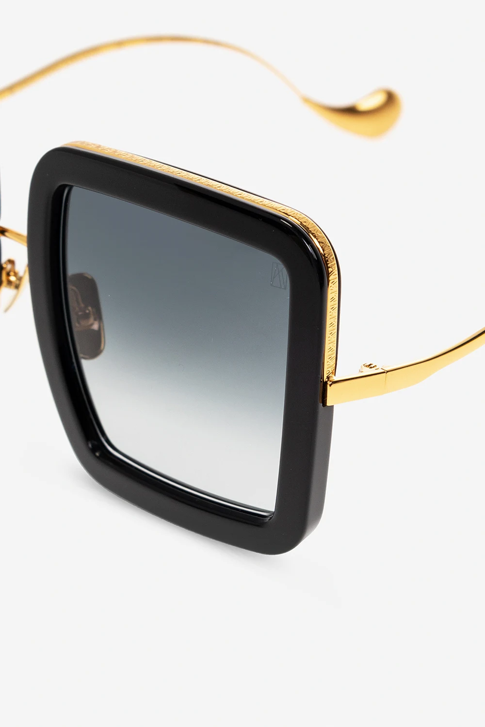 Okulary przeciwsłoneczne w kolorze czarno-złotym, model ‘Beaming Sty’ Anna Karin Karlsson. Kwadratowe oprawki. Dekoracyjne, faliste zauszniki i o geometrycznym kształcie. Ozdobione czarnymi kryształami Swarovskiego. Szare, gradientowe szkła w technologii ZEISS. Dołączone etui.