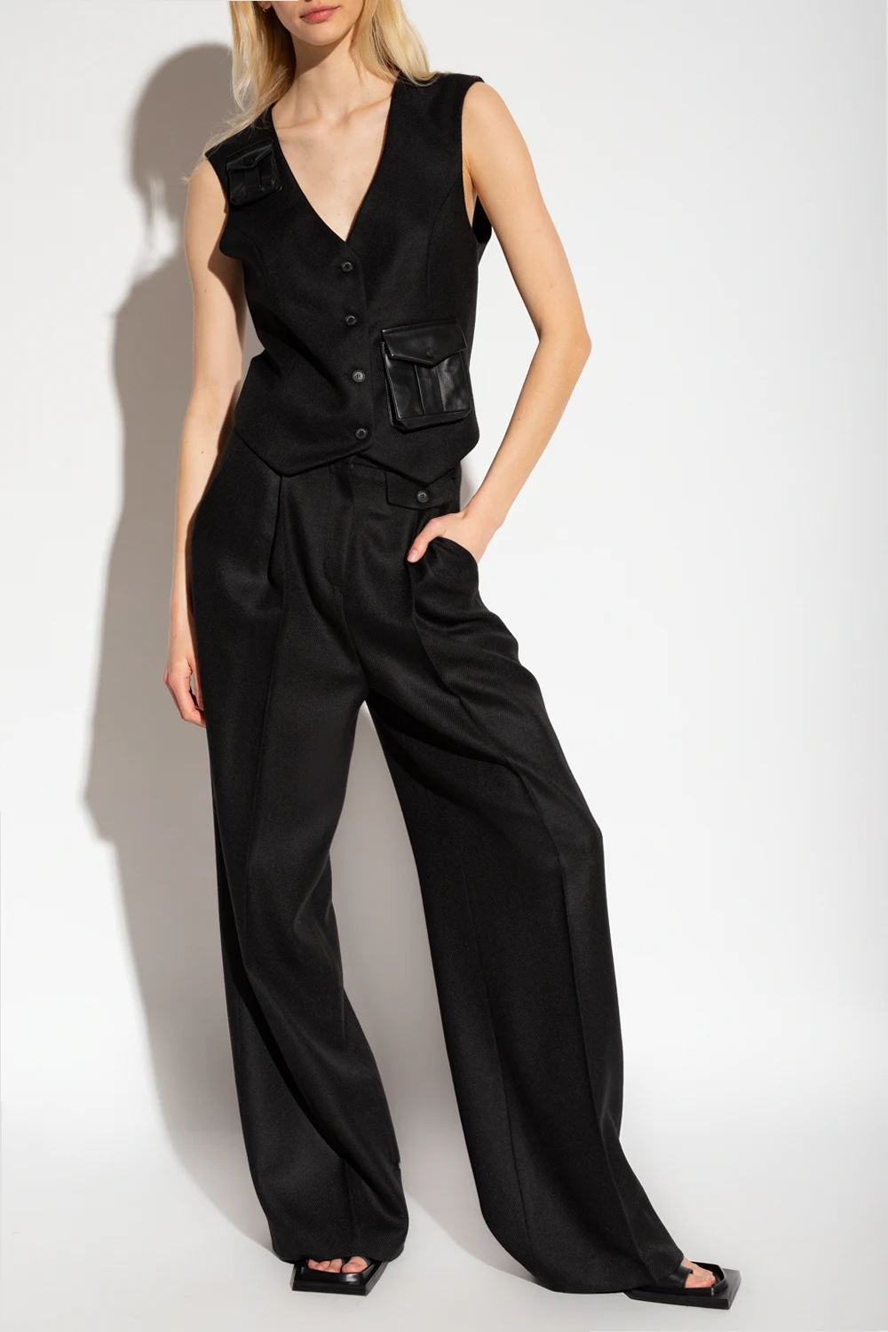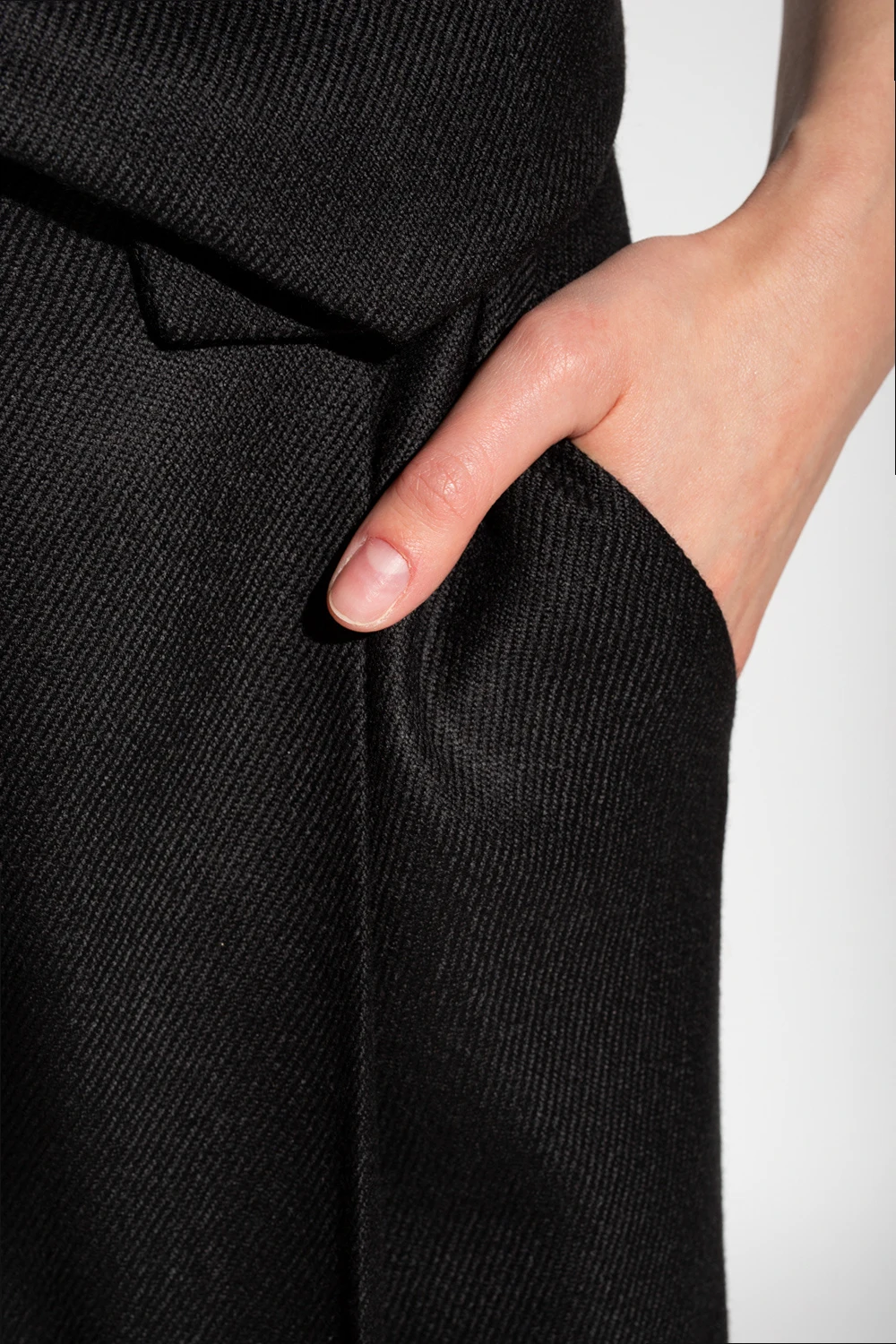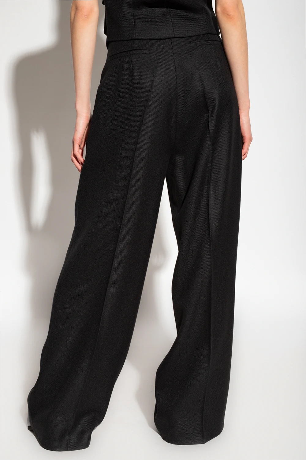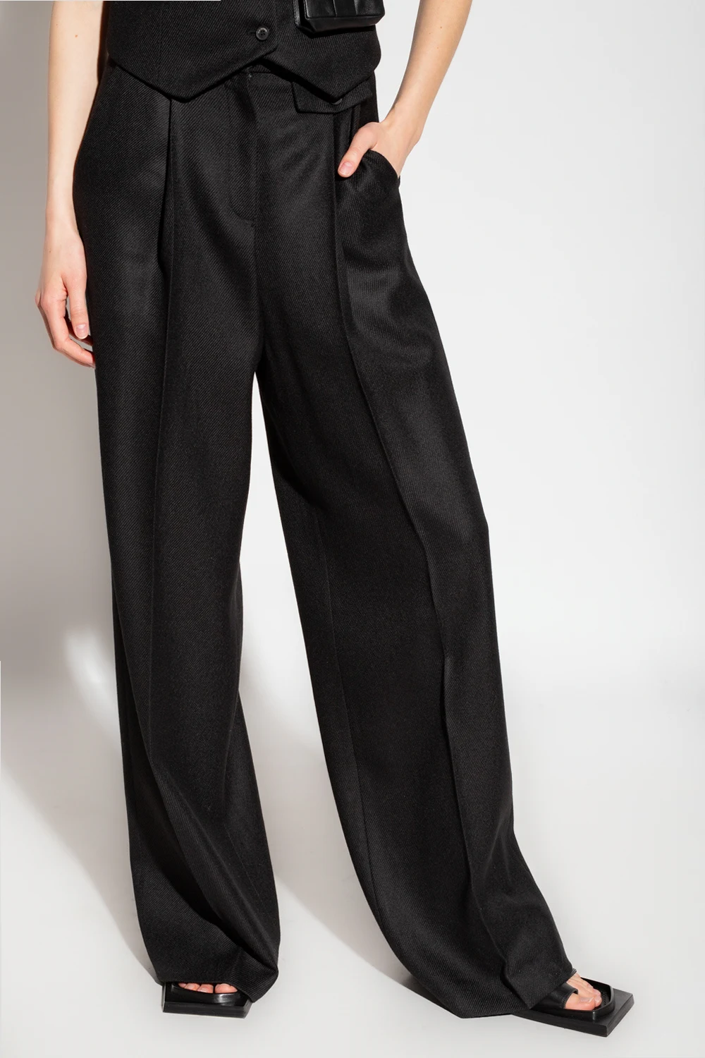 Czarne, wełniane spodnie z wysokim stanem, model ‘Jafr’ The Mannei. Zapinane na guzik oraz zamek. Z przodu ozdobione patką z guzikiem. Cztery wsuwane kieszenie. Długie, szerokie nogawki w kant.