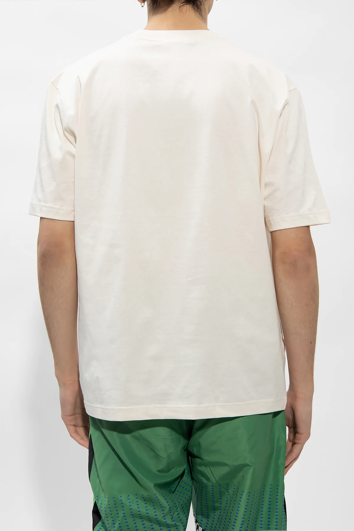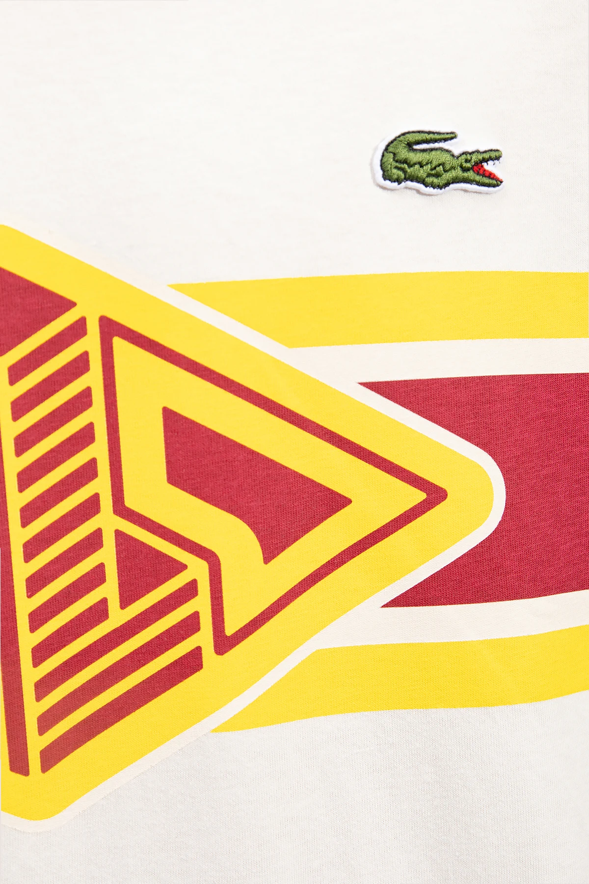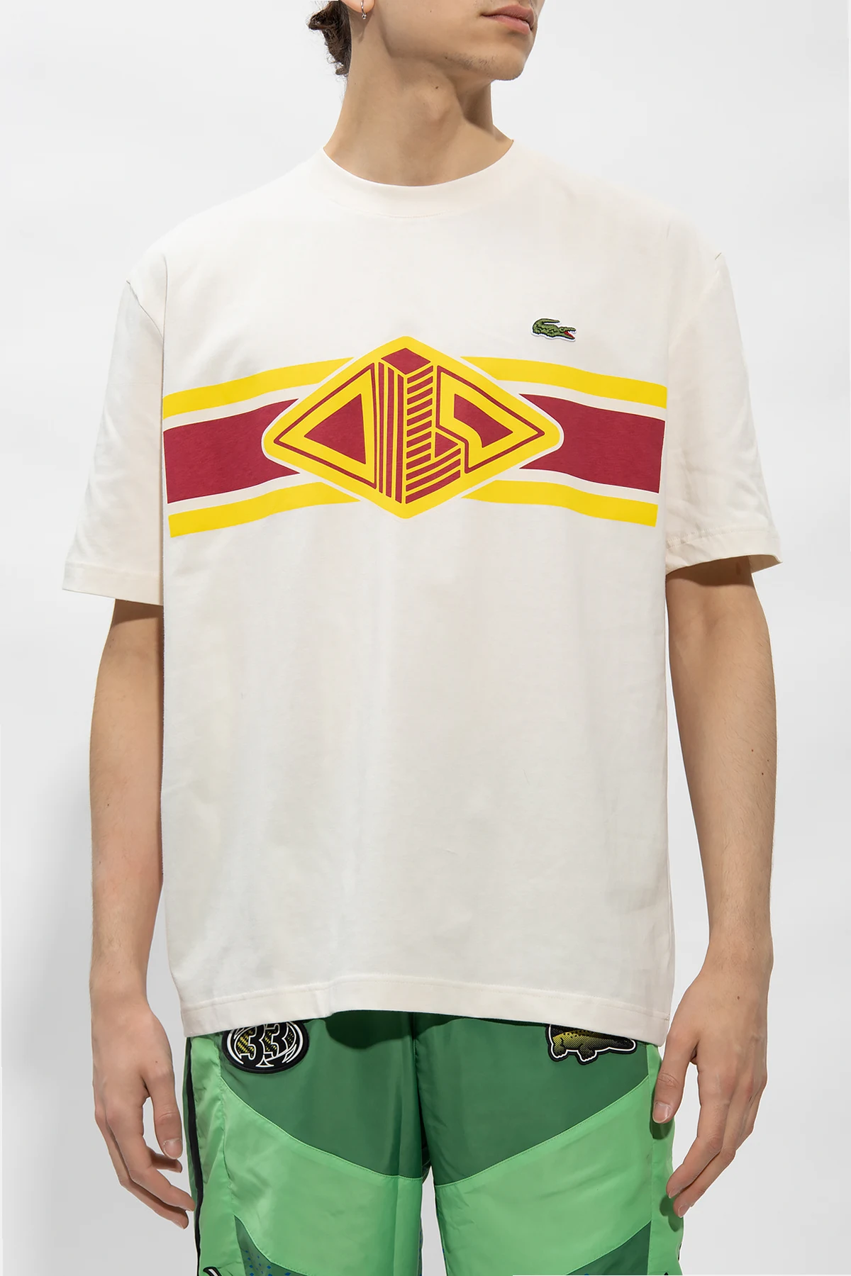 Kremowy t-shirt Lacoste. Wykonany z bawełny. Ozdobiony żółto-bordowym nadrukiem z logo. Okrągły dekolt wykończony ściągaczem. Krótkie rękawy.
