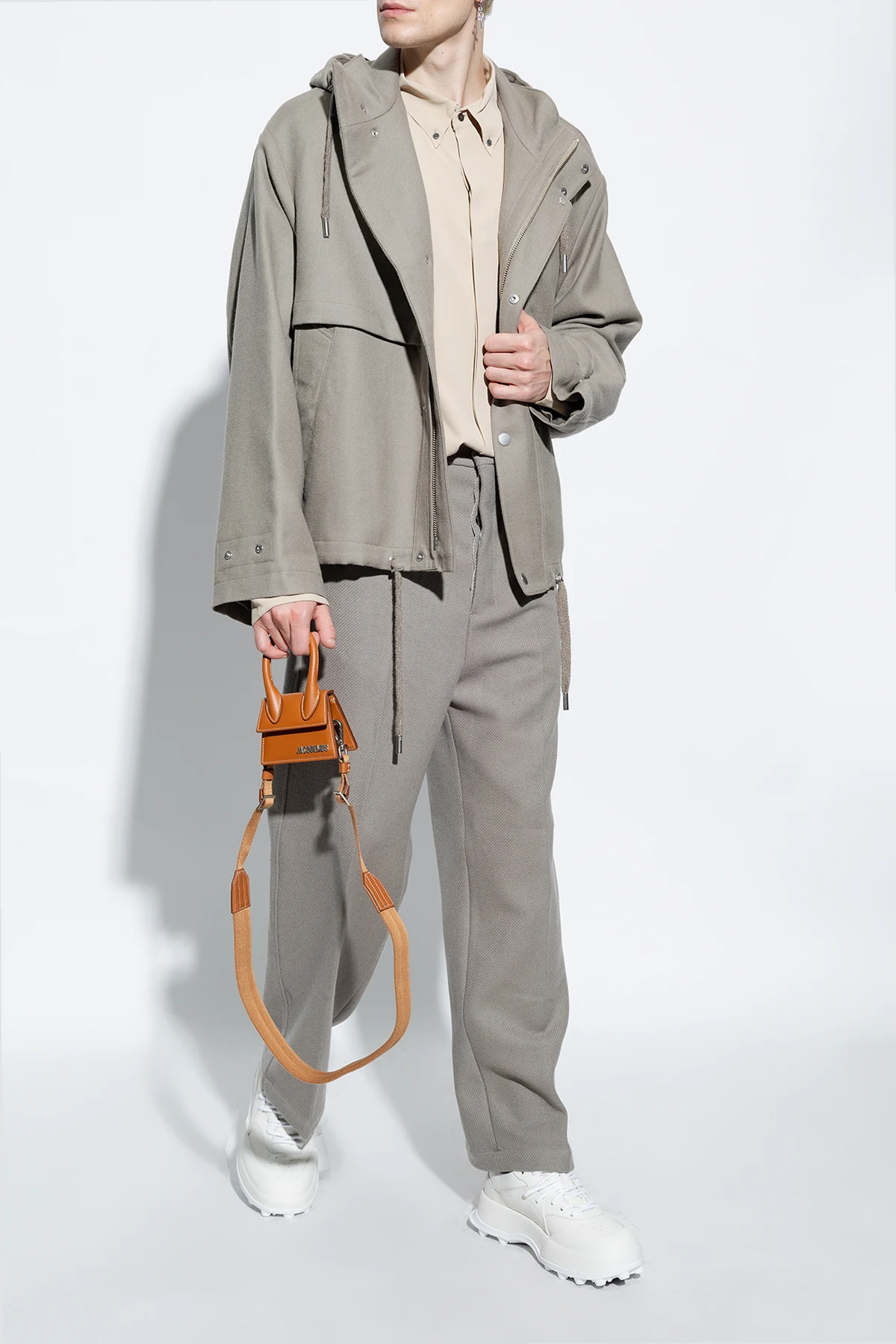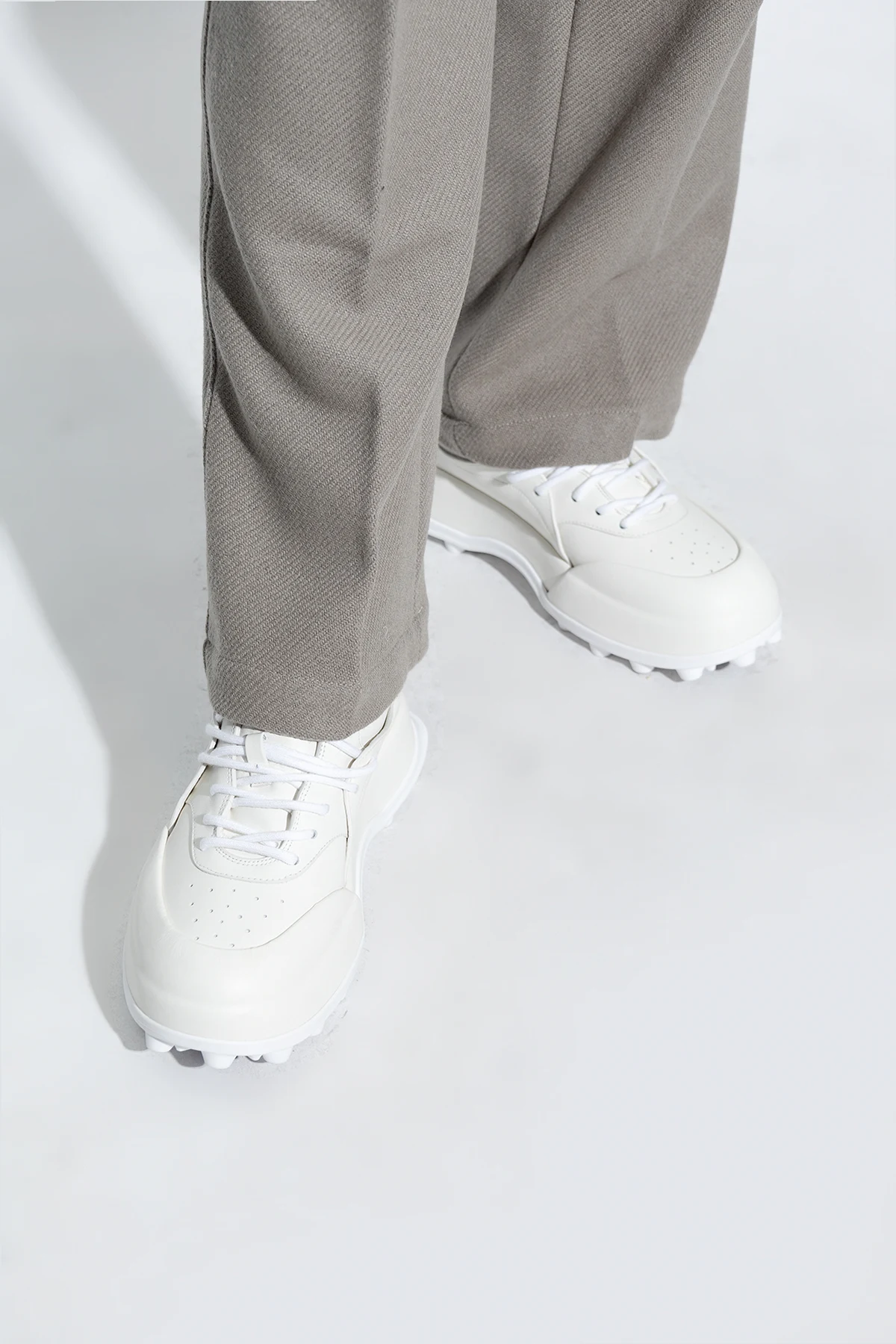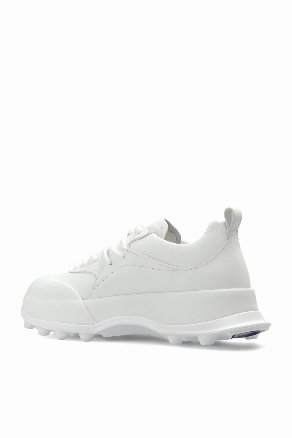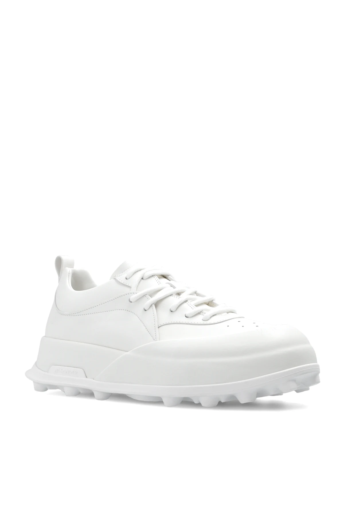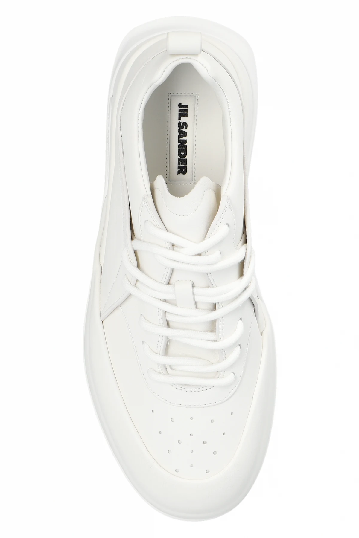 Białe, sznurowane buty sportowe JIL SANDER. Wykonane ze skóry. Z boku wypukłe logo. Perforowany przód. Biało-fioletowa, gumowa podeszwa.