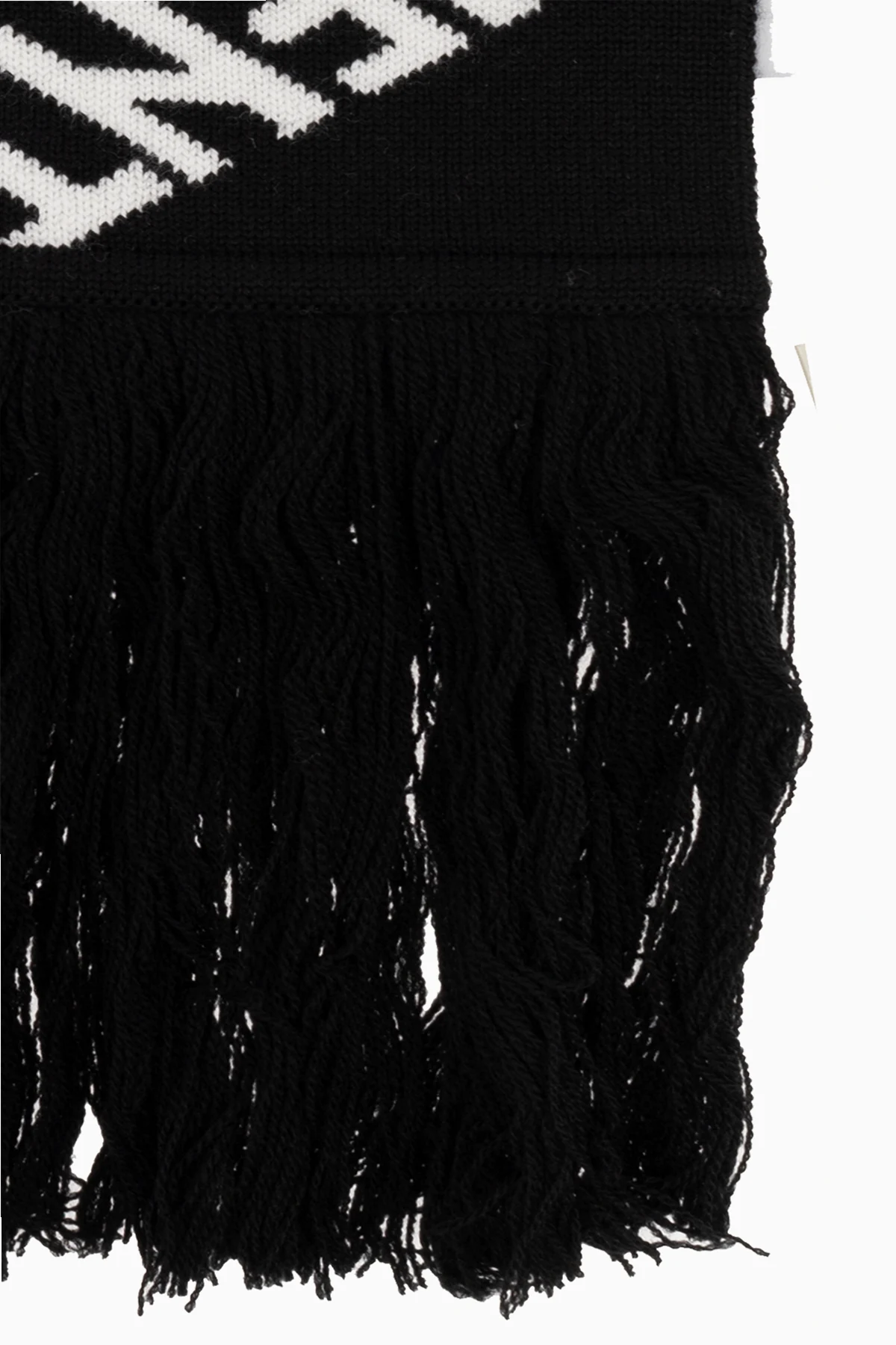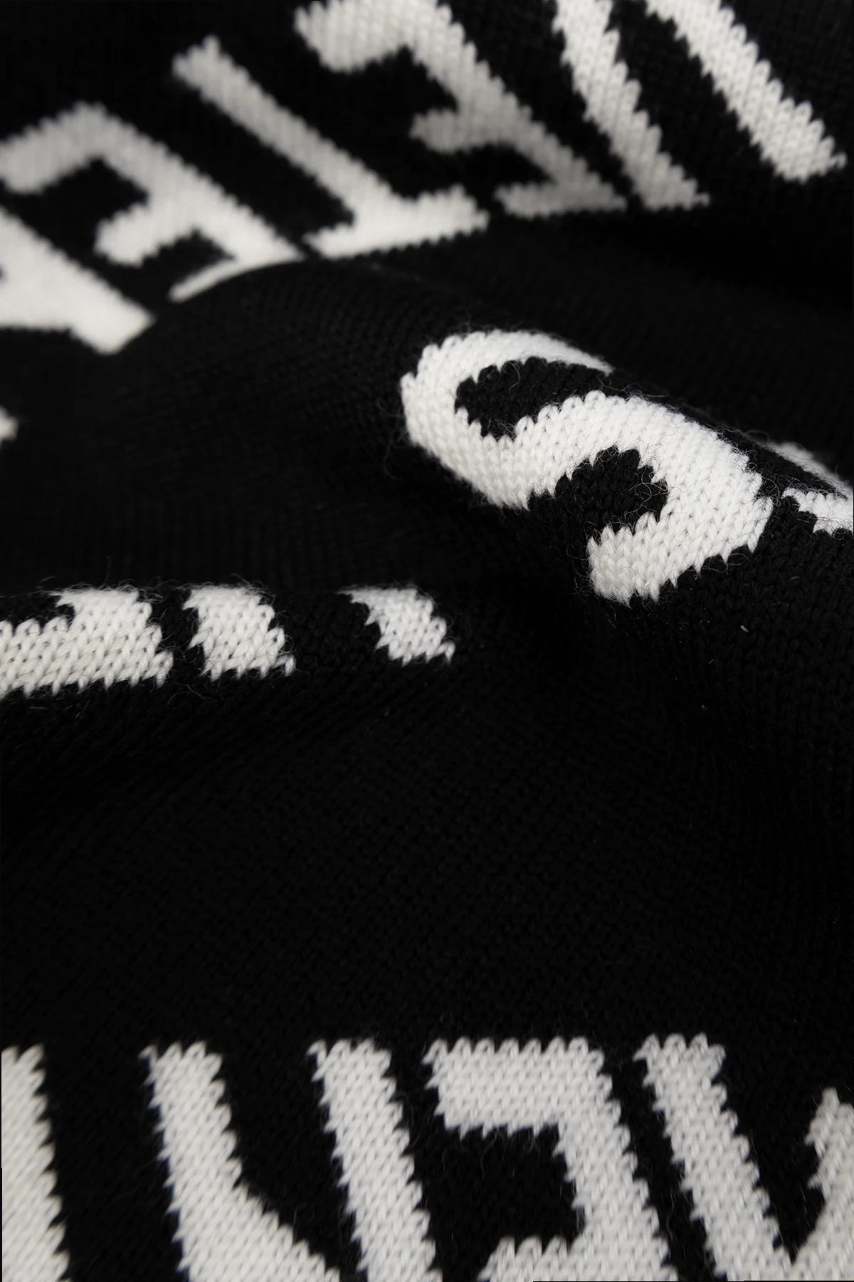 Czarno-biały szal VETEMENTS. Wykonany z wełny. Ozdobiony wzorem z logo. Wykończony frędzlami.