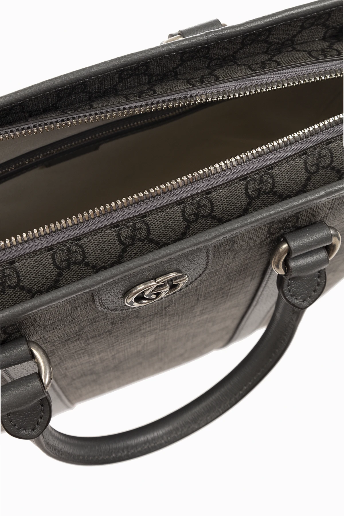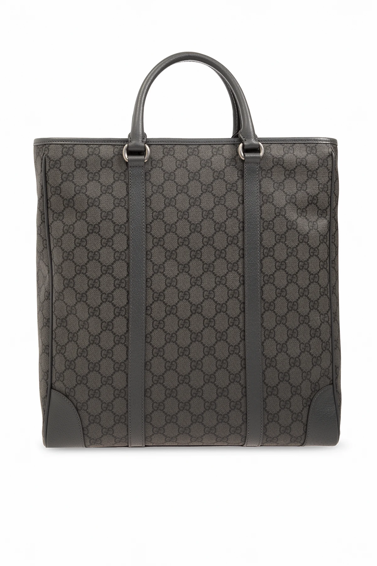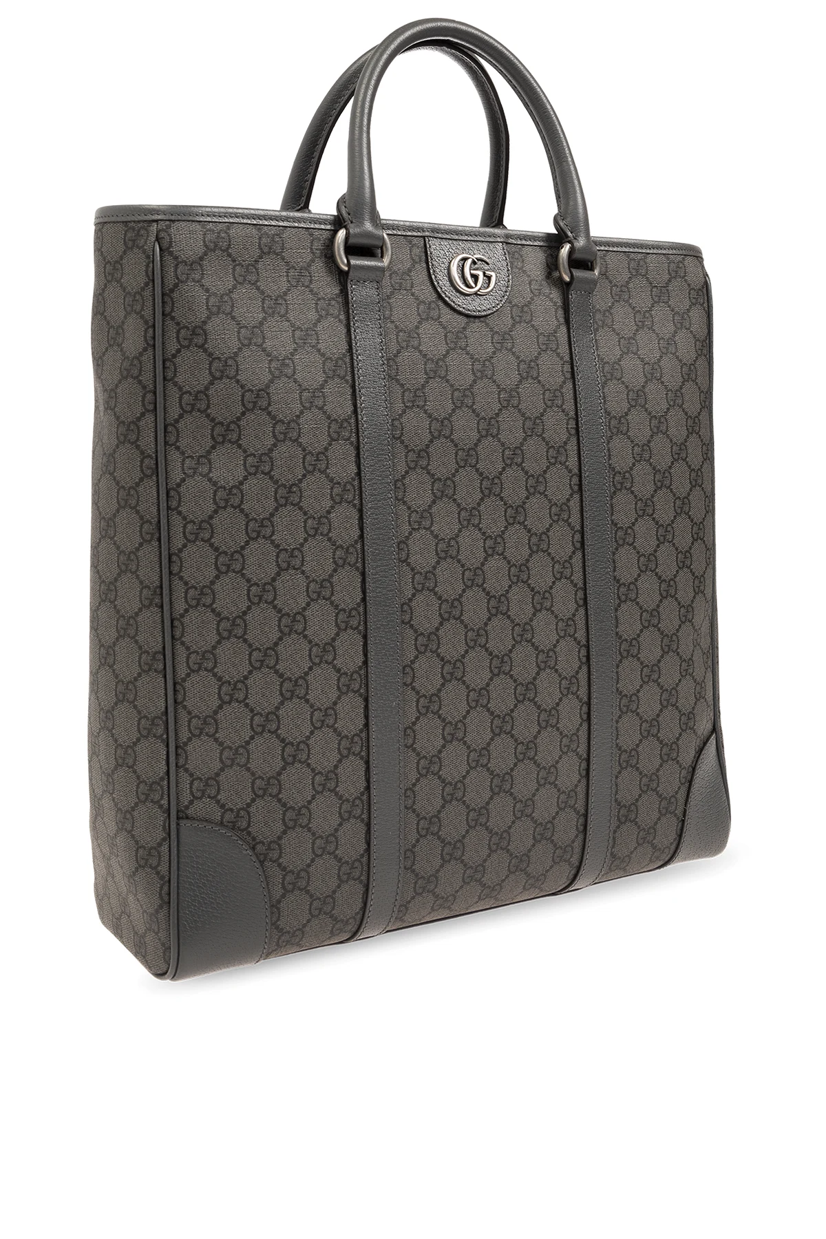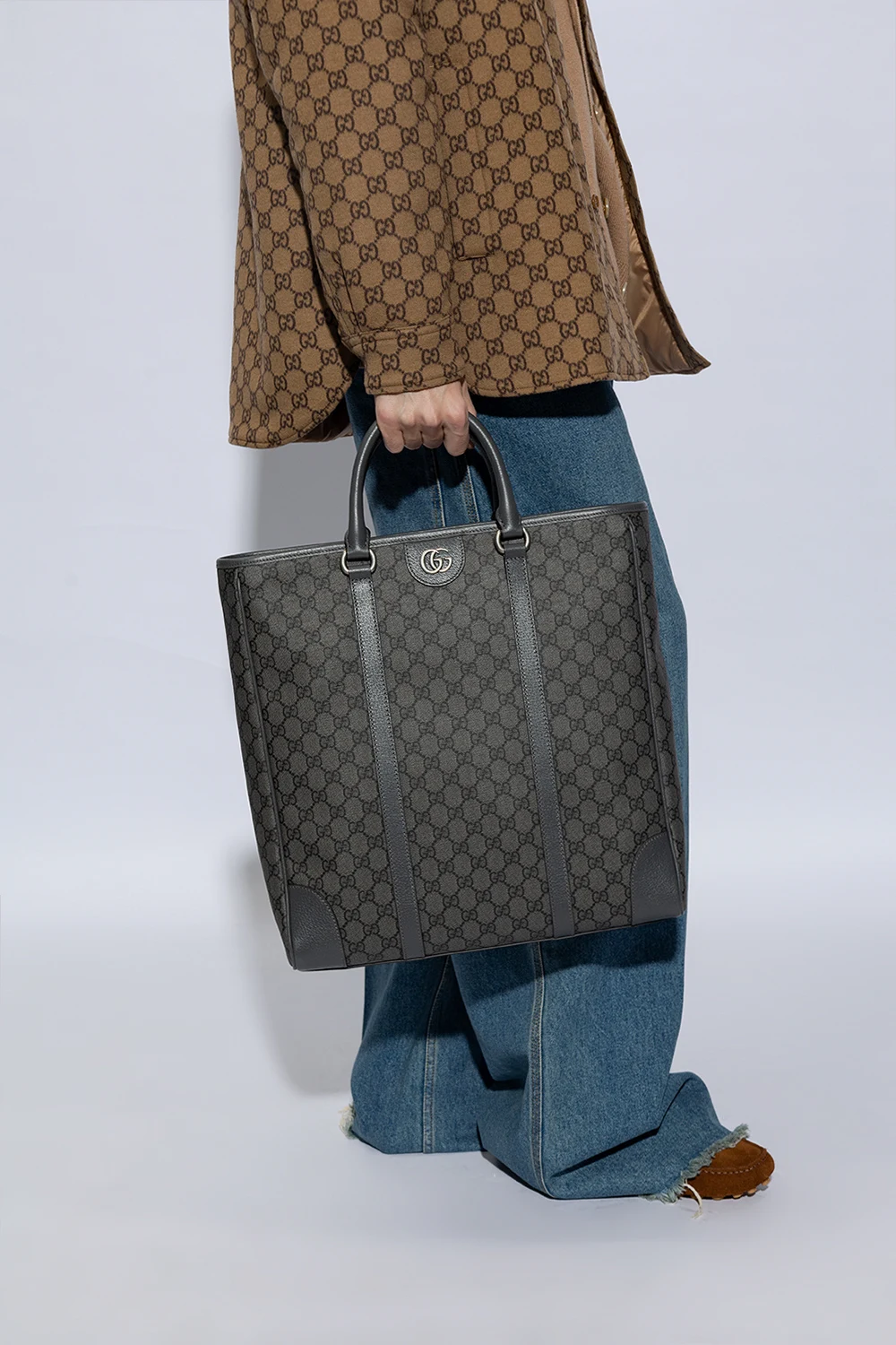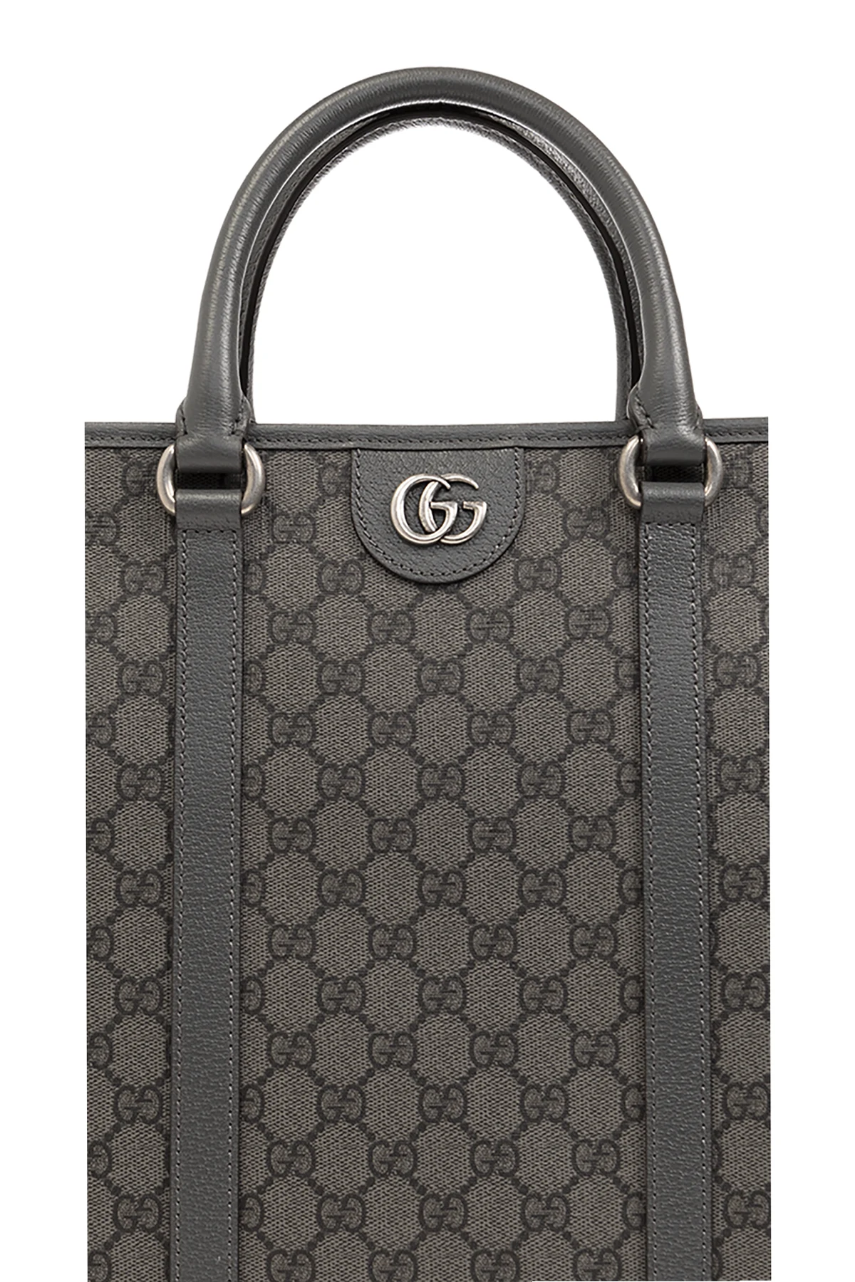 Ciemnoszara torba typu ‘shopper’, model ‘Ophidia Medium’ Gucci. Wykonana z charakterystycznego dla marki płótna ‘GG Supreme’ i wykończona skórą cielęcą. Zamykana na zamek. Z przodu metalowa aplikacja w kształcie logo ‘Double G’. Dwie półokrągłe rączki i odpinany, regulowany pas na ramię. Wewnątrz komora z dwiema kieszeniami: wsuwaną oraz zamykaną na zamek. Metalowe wykończenie w kolorze srebrnym.