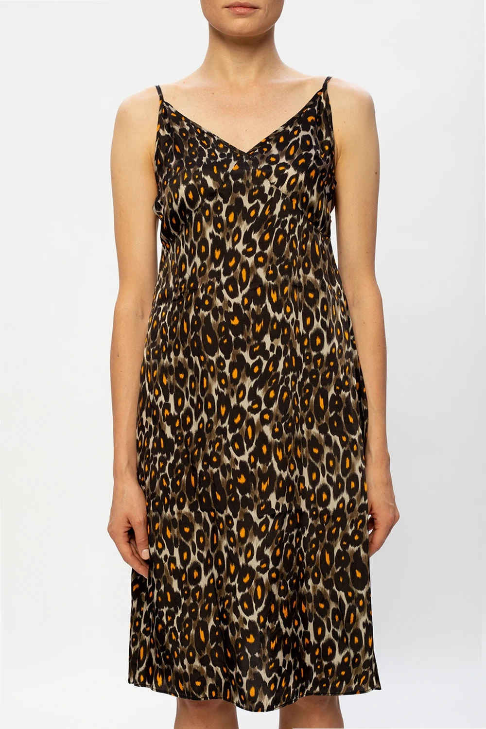 Kolorowa sukienka na ramiączkach z wiązaniami R13. Ozdobiona wzorem w cętki. Dekolt w serek.