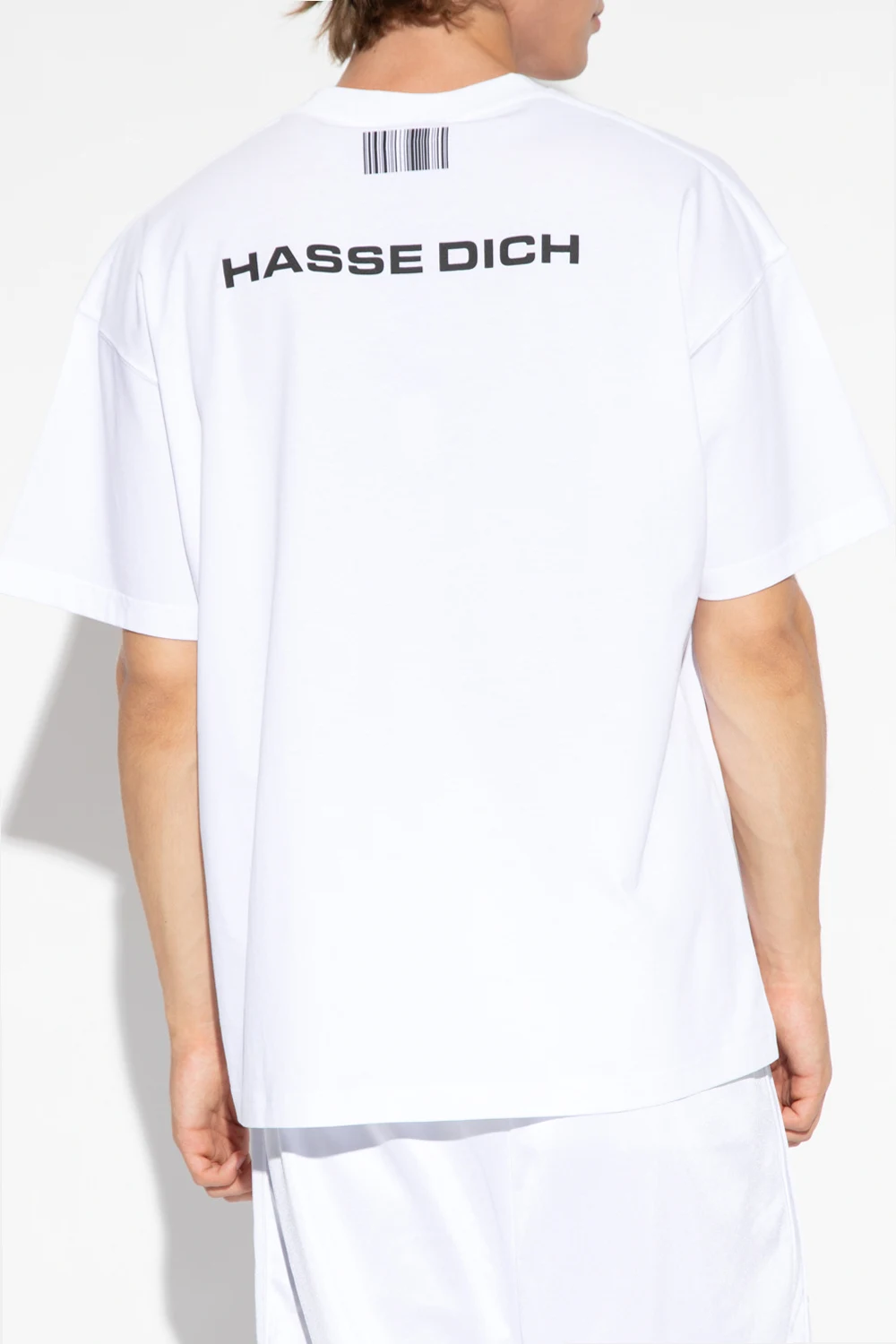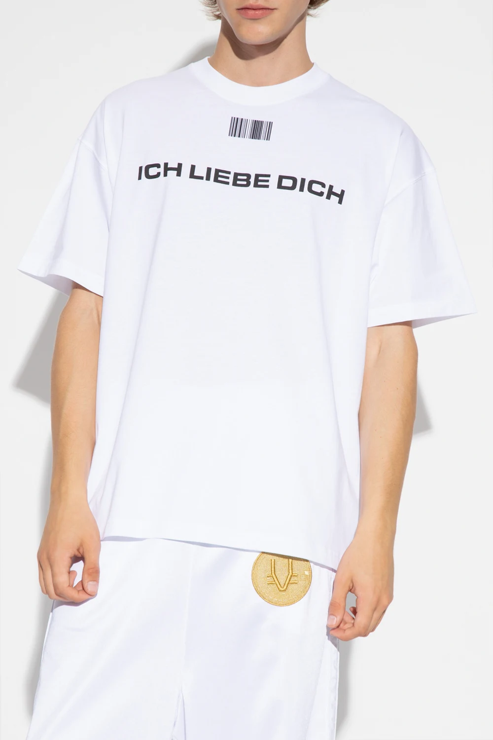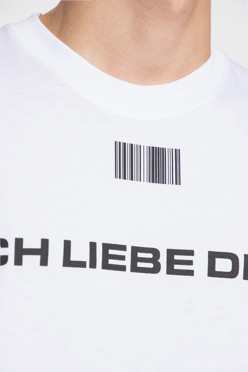 Biały, bawełniany t-shirt VTMNTS. Ozdobiony czarnym nadrukiem z charakterystycznym motywem kodu kreskowego oraz napisem ‘ICH LIEBIE DICH’ i ‘HASSE DICH’. Okrągły dekolt wykończony ściągaczem. Krótkie rękawy.