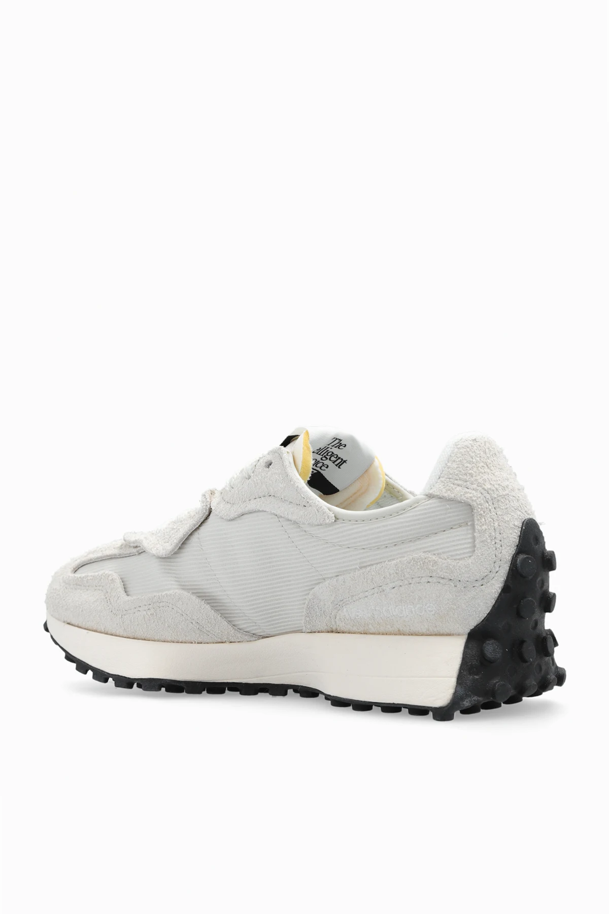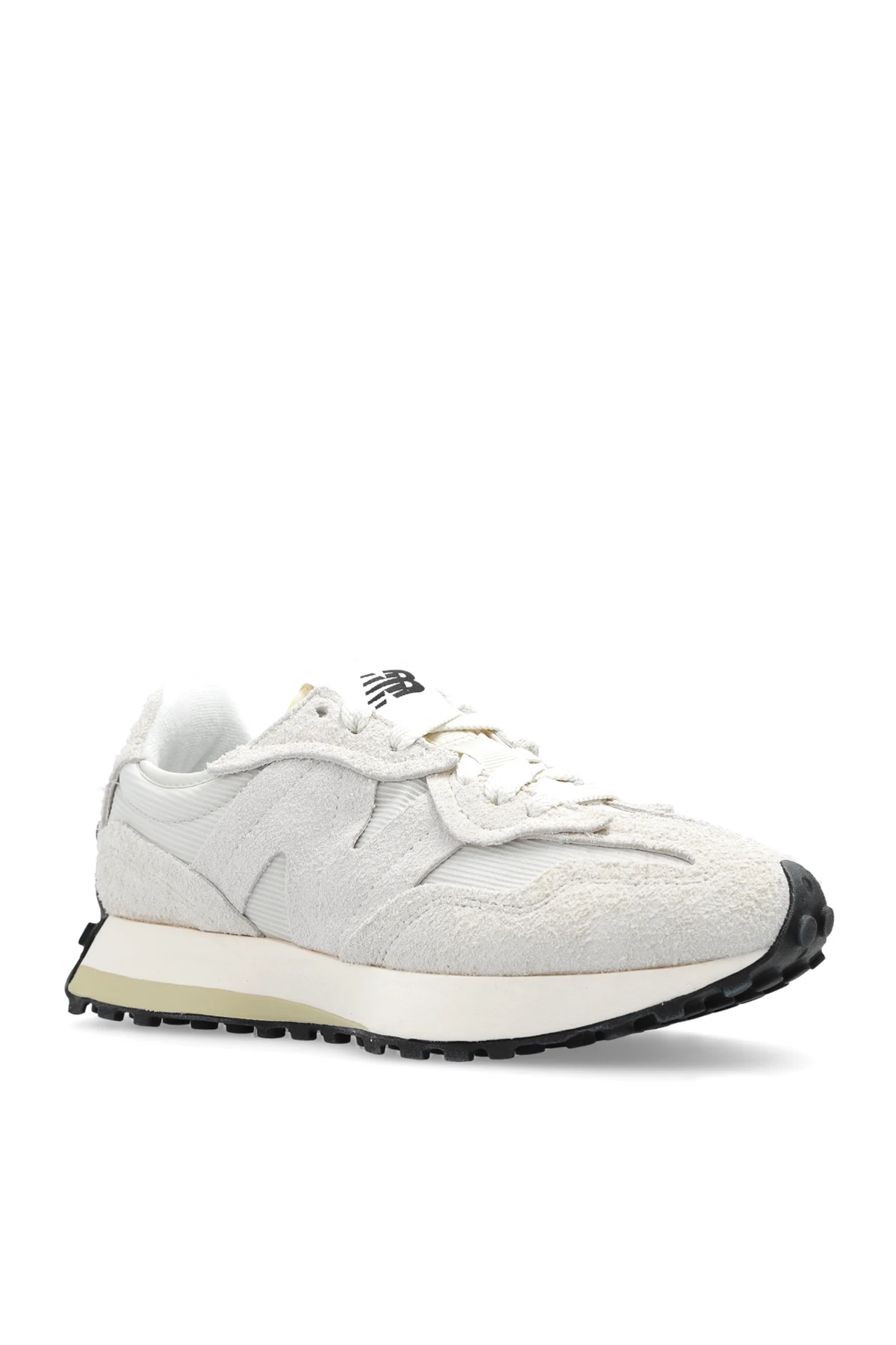 Kremowe, sznurowane buty sportowe, model ‘U327WCG’ New Balance. Wykonane z zamszu, siatki oraz materiałów syntetycznych. Ozdobione logo. Dobrze zamortyzowana podeszwa środkowa z miękkiej pianki EVA. Czarno-kremowa, gumowa podeszwa.