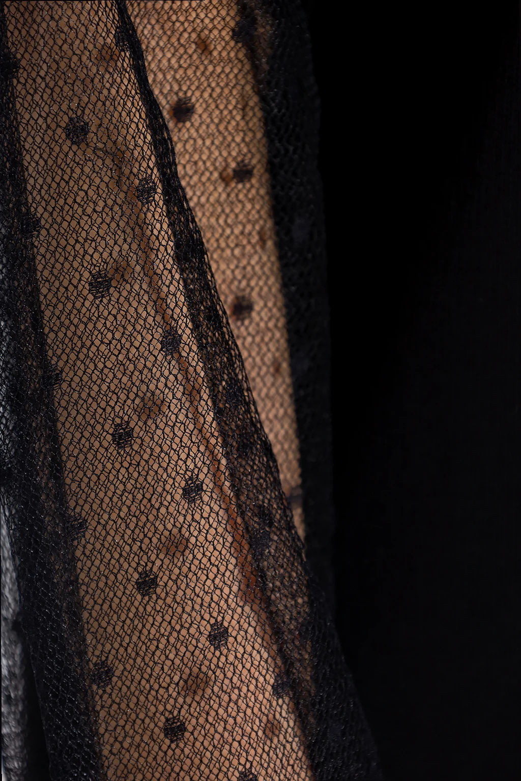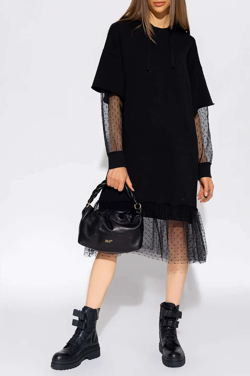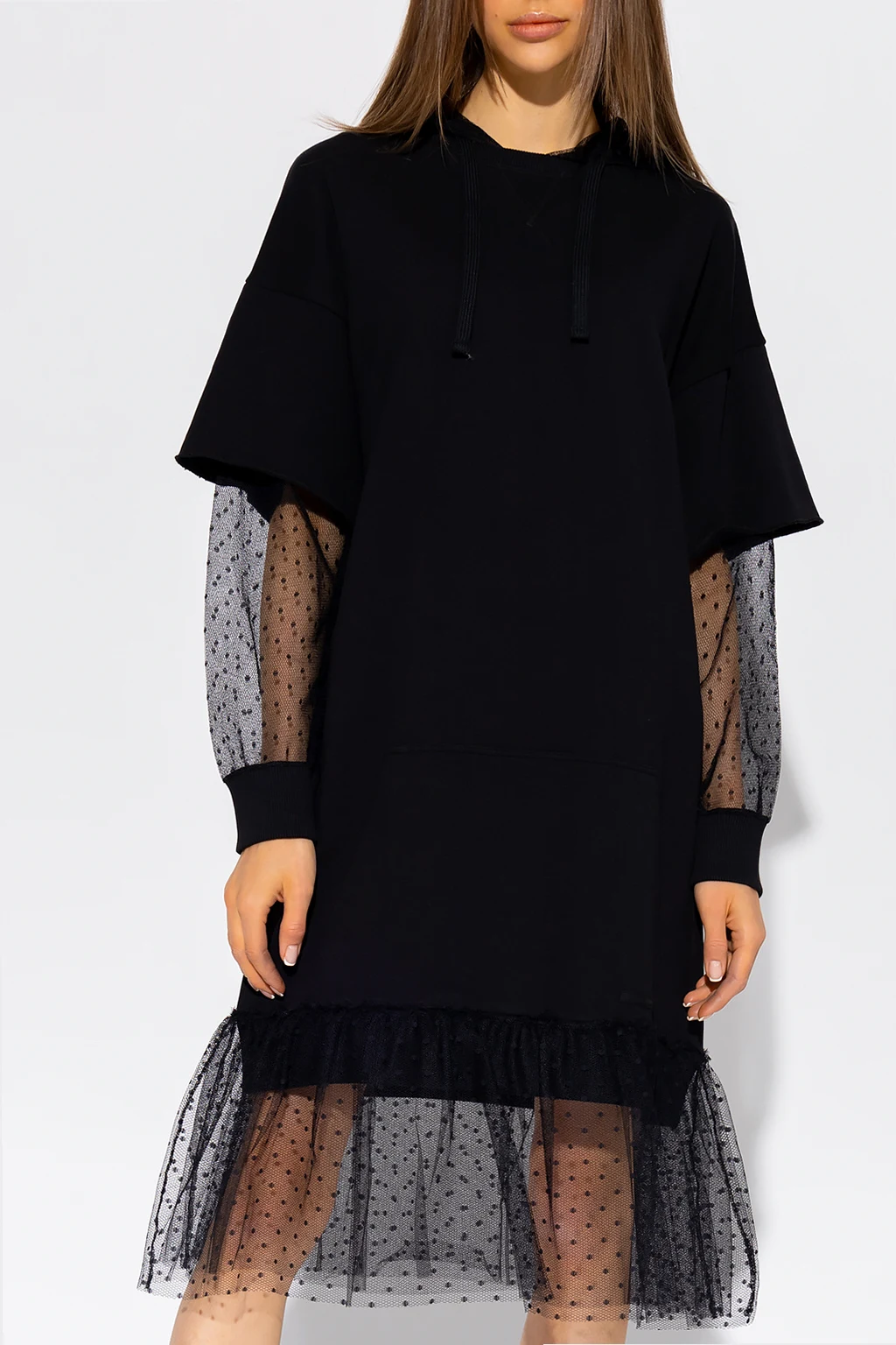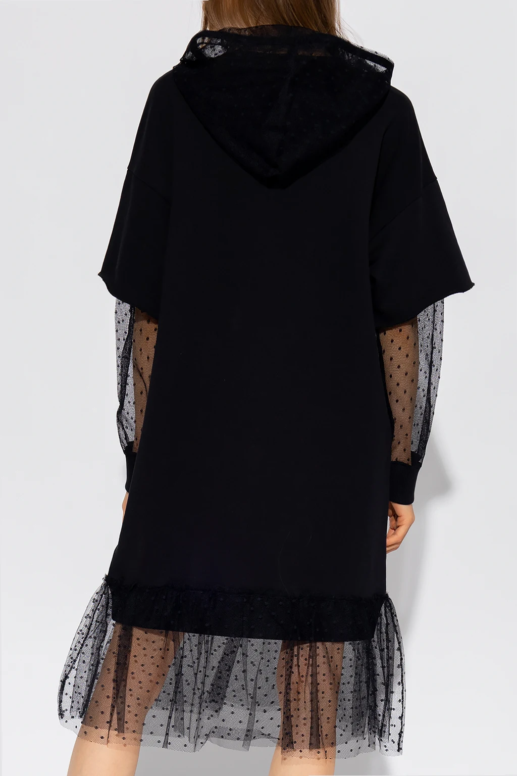 Czarna sukienka o kroju długiej bluzy Red Valentino. Wykonana z bawełny. Kaptur ściągany trokami. Z przodu wsuwana kieszeń. Dekoracyjne wstawki z tiulu ozdobionego charakterystycznym dla marki wzorem ‘Point d’Esprit’. Długie rękawy i dół zakończone ściągaczem.
