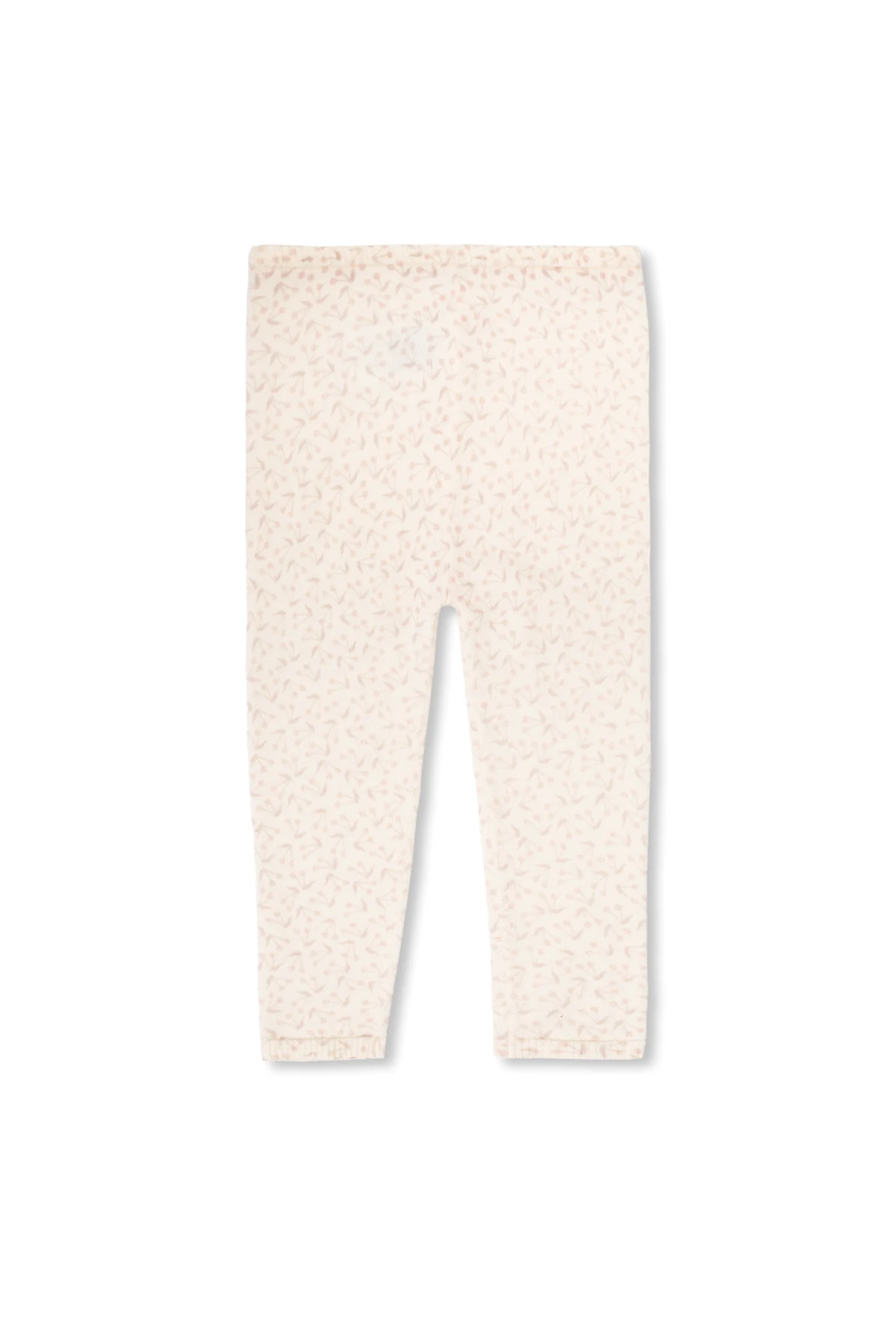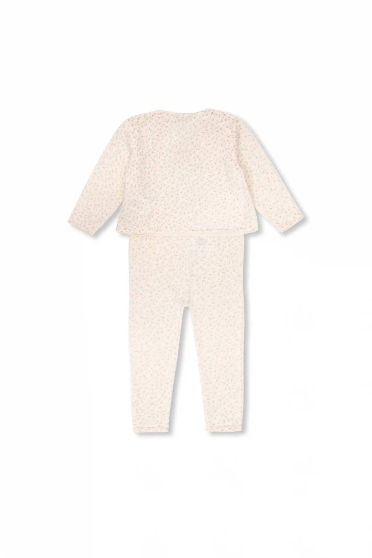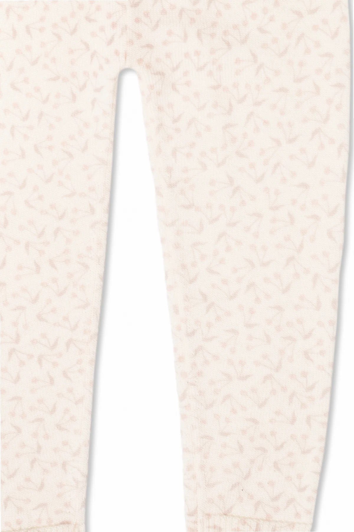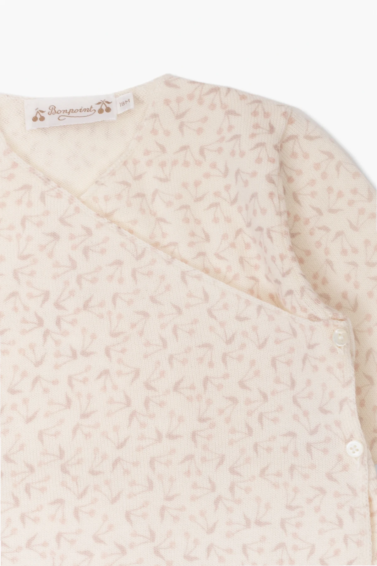 Kremowy komplet: sweter i spodnie, model ‘Adile’ Bonpoint. Wykonany z wełny. Ozdobiony wzorem z charakterystycznym motywem wiśni. Sweter z kopertowym zapięciem. Dekolt w serek. Długie rękawy. Spodnie z wszytym ściągaczem w pasie i przy długich nogawkach.
