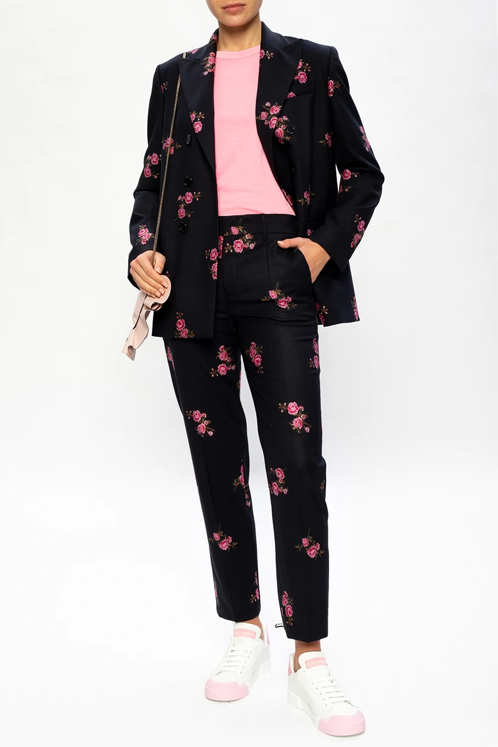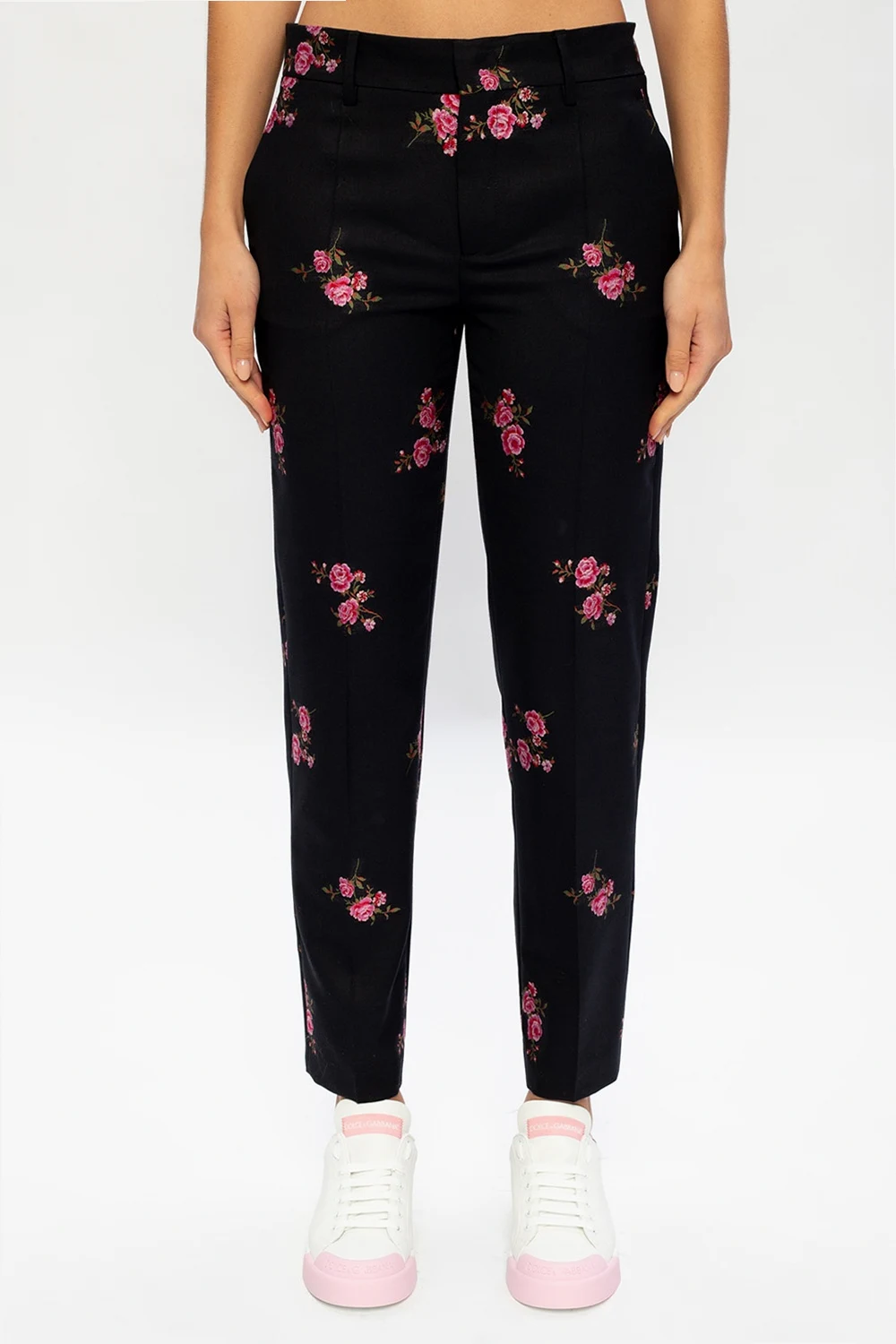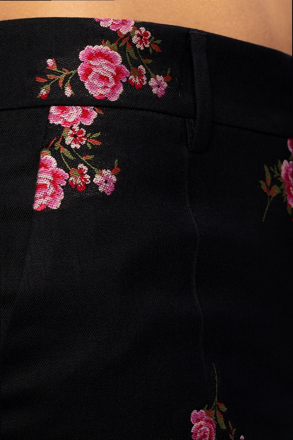 Czarne, wełniane spodnie Red Valentino. Zapinane na zamek, zaczep i guzik. Ozdobione kolorowo wyszytym wzorem z motywem kwiatowym. Zwężane nogawki. Z przodu i z tyłu dwie kieszenie.