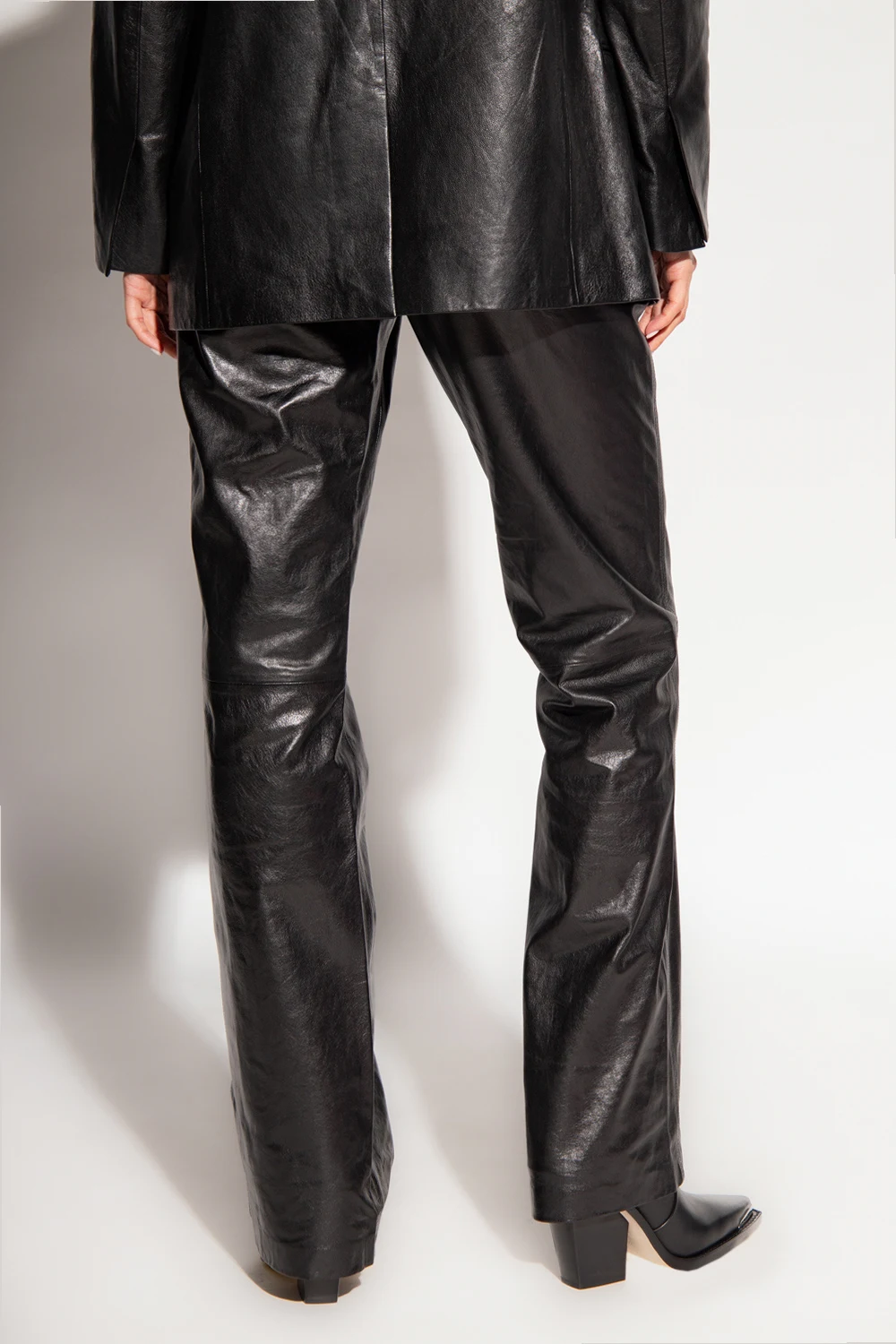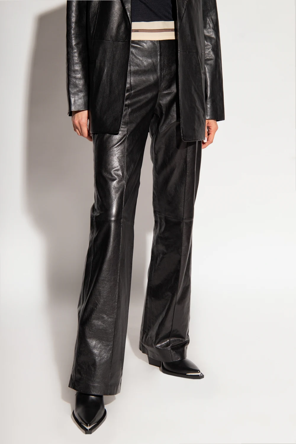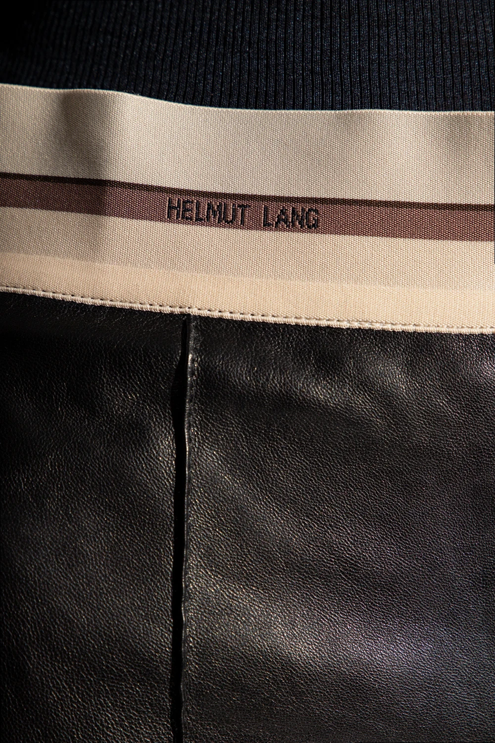 Czarne spodnie Helmut Lang. Wykonane z owczej skóry. Z boku zapięcie na zamek. W pasie wszyta beżowo-brązowa guma ozdobiona logo. Cztery wsuwane kieszenie. Długie nogawki, lekko rozszerzane ku dołowi.