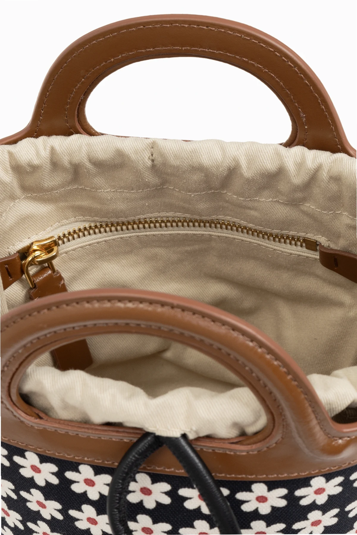 Wnętrze, wyłożone jasnym materiałem, kryje w sobie praktyczną kieszeń zamykaną na zamek, co zwiększa jej funkcjonalność. Dodatkowo, torbę można swobodnie ściągać trokami, co pozwala na dostosowanie jej rozmiaru do potrzeb użytkownika. Subtelne logo projektanta zaznaczone na wzorze kwiatowym świadczy o autentyczności i wyjątkowości tego dodatku.