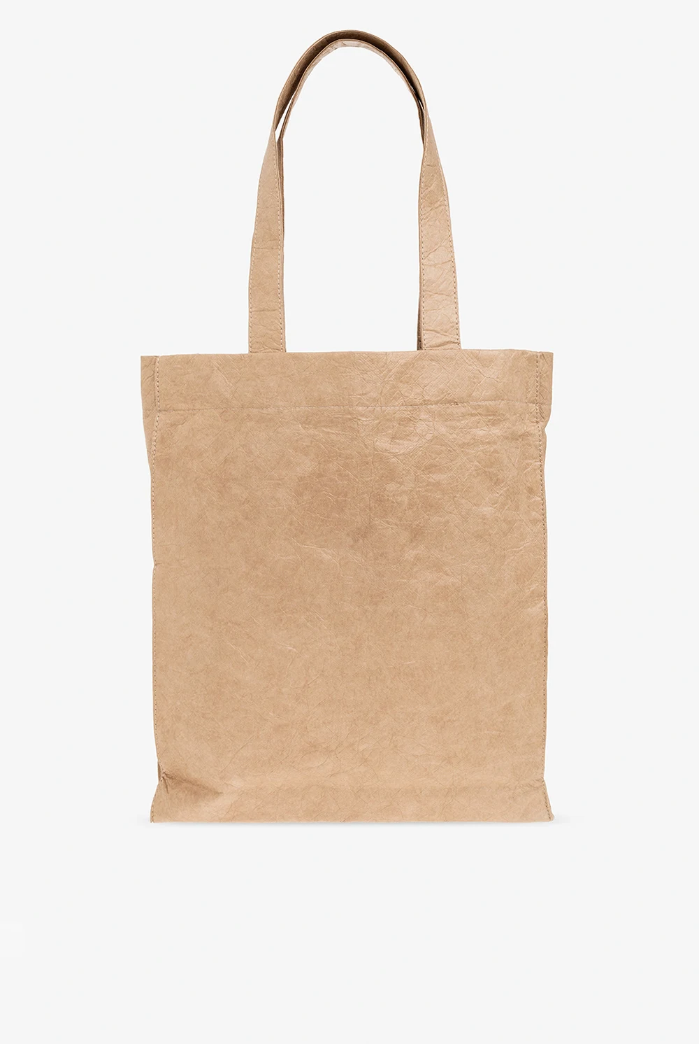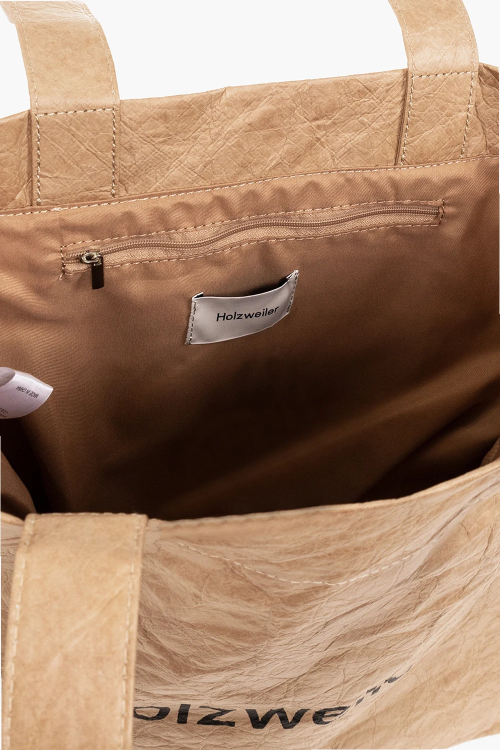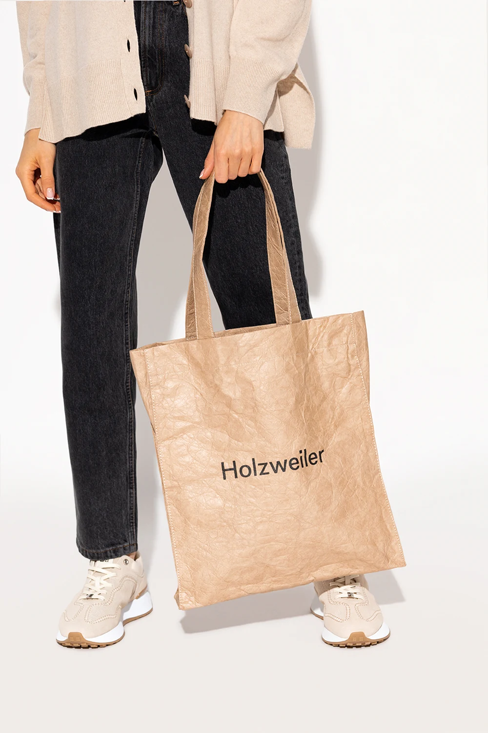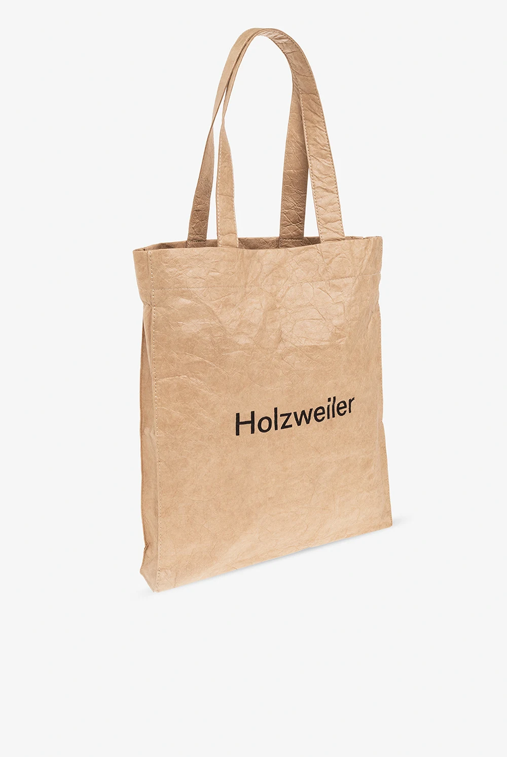 Beżowa torba typu ‘shopper’, model ‘Shelter’ Holzweiler. Wykonana z materiału imitującego fakturę papieru. Ozdobiona nadrukowanym logo w kolorze czarnym. Dwie półokrągłe rączki. Wewnątrz komora i kieszeń zamykana na zamek.