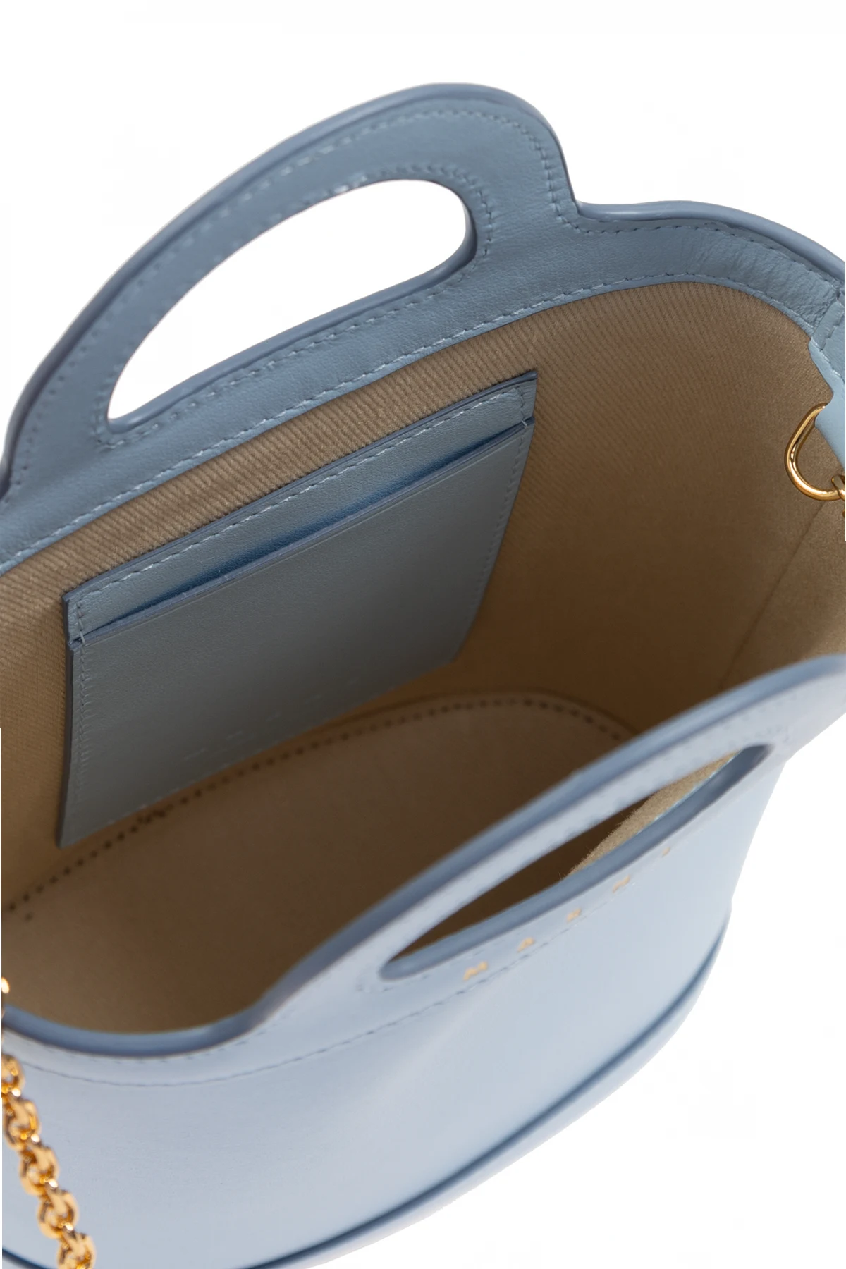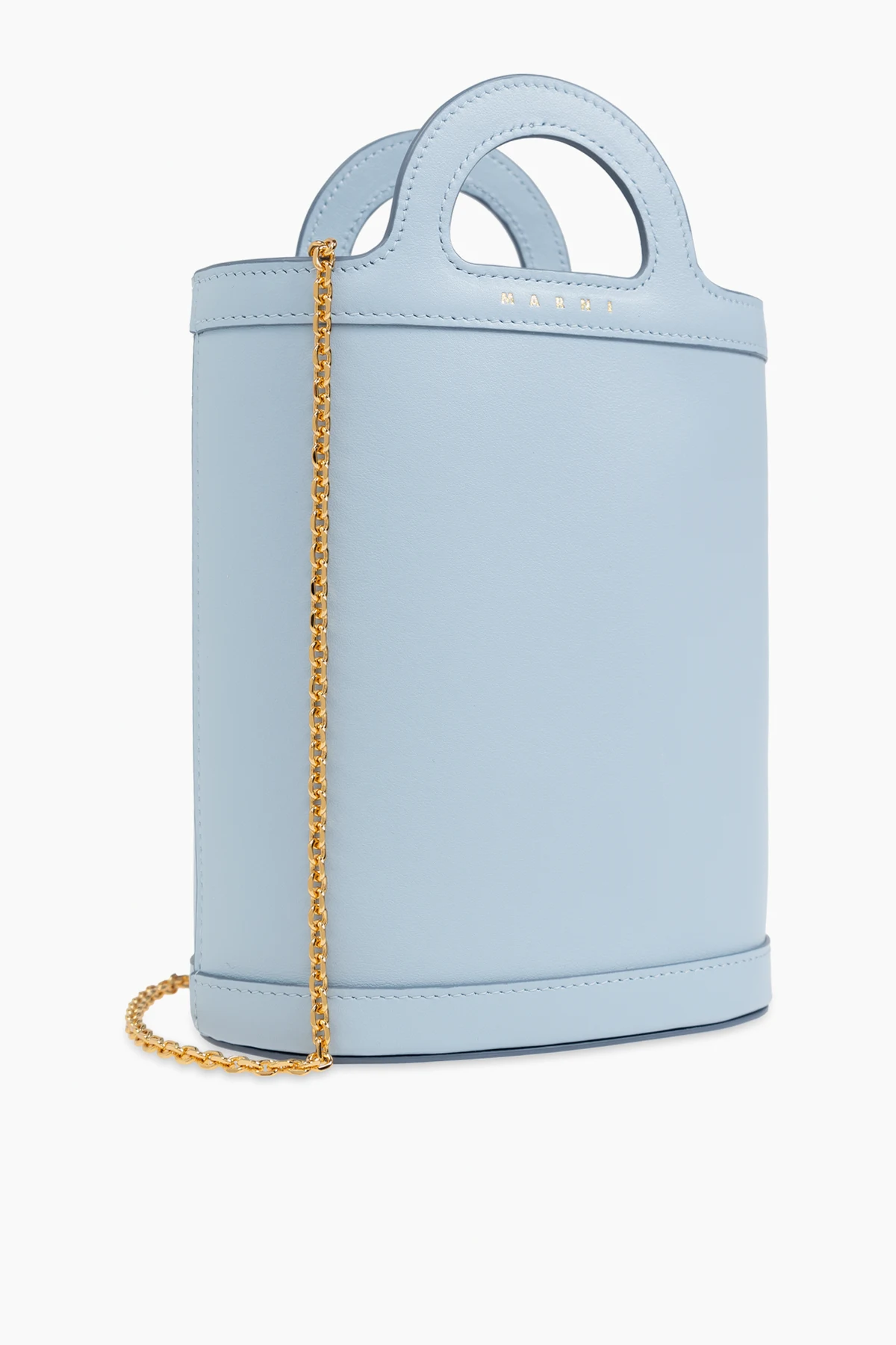 Torebka na ramię "Tropicalia Nano" od renomowanej marki MARNI to kwintesencja elegancji i funkcjonalności. Cylindryczny kształt z zaokrąglonymi krawędziami oraz wyprofilowane uchwyty w kształcie półkola nadają jej wyrafinowanego charakteru. Wykonana z najwyższej jakości jasnoniebieskiej skóry, torba zachwyca minimalistycznym designem, który podkreślają luksusowe detale.