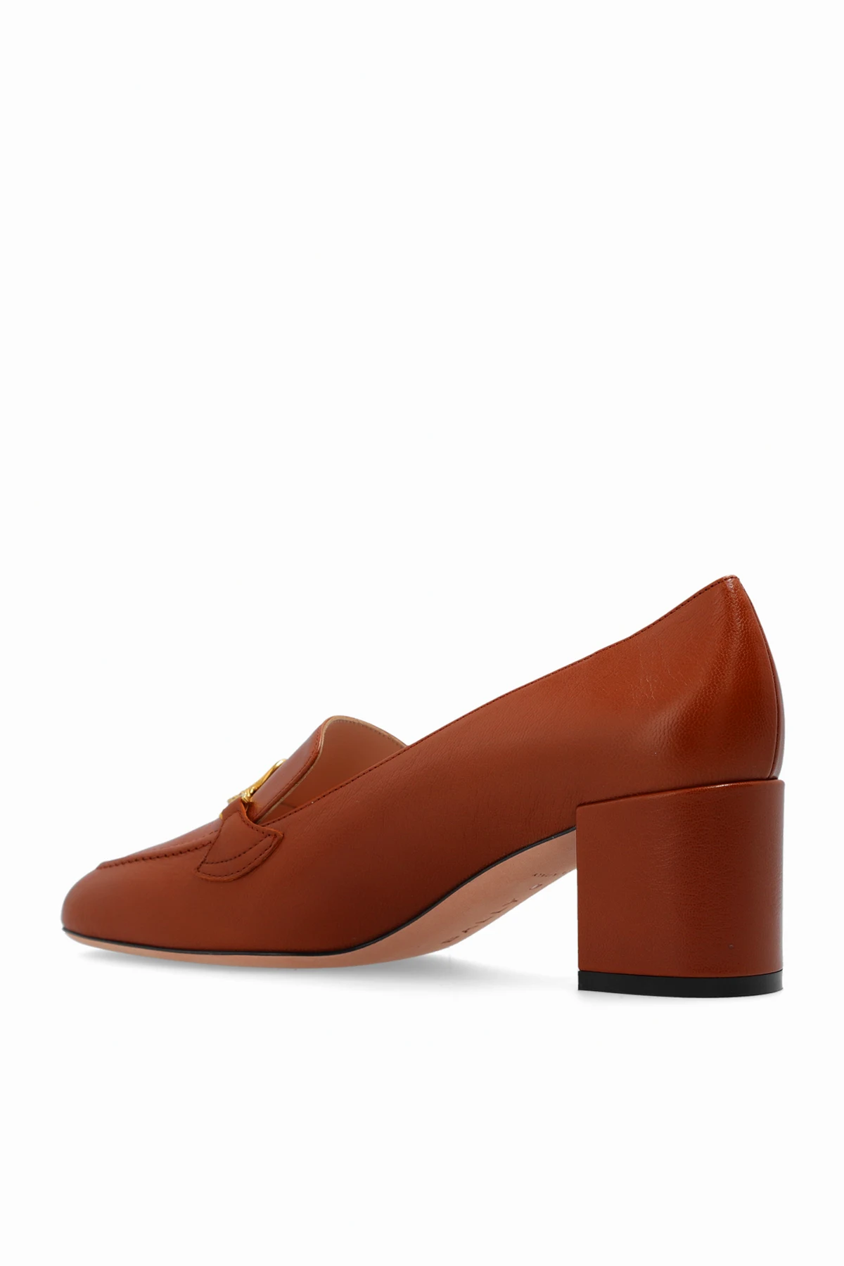Brązowe, wsuwane buty na obcasie, model ‘Obrien’ Bally. Wykonane ze skóry. Z przodu metalowa aplikacja w kształcie logo w kolorze złotym. Różowa, skórzana podeszwa.
