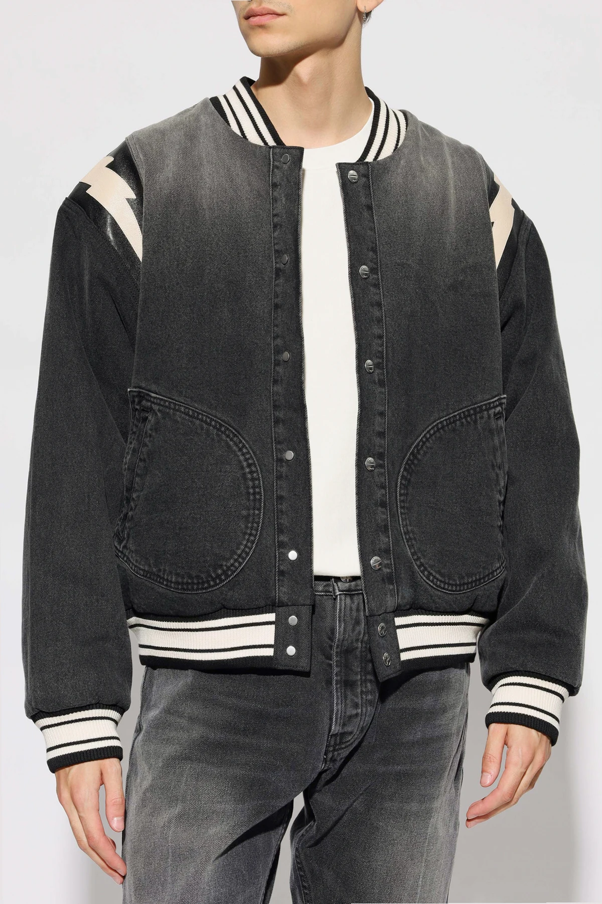 Detale, takie jak aplikacje w kształcie błyskawic na ramionach oraz prążkowane wykończenia w biało-czarne paski na dole kurtki, mankietach i kołnierzu, nadają jej sportowego, ale jednocześnie eleganckiego charakteru. Na plecach znajduje się wypukły napis " RHUDE ", który dodaje kurtce unikalnego stylu.