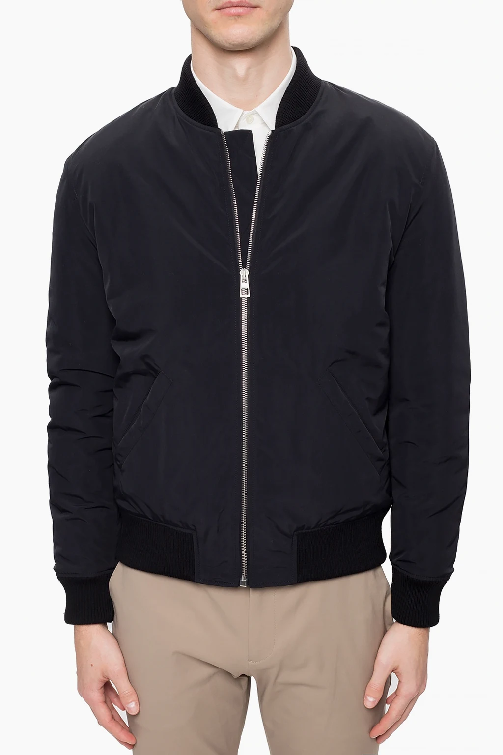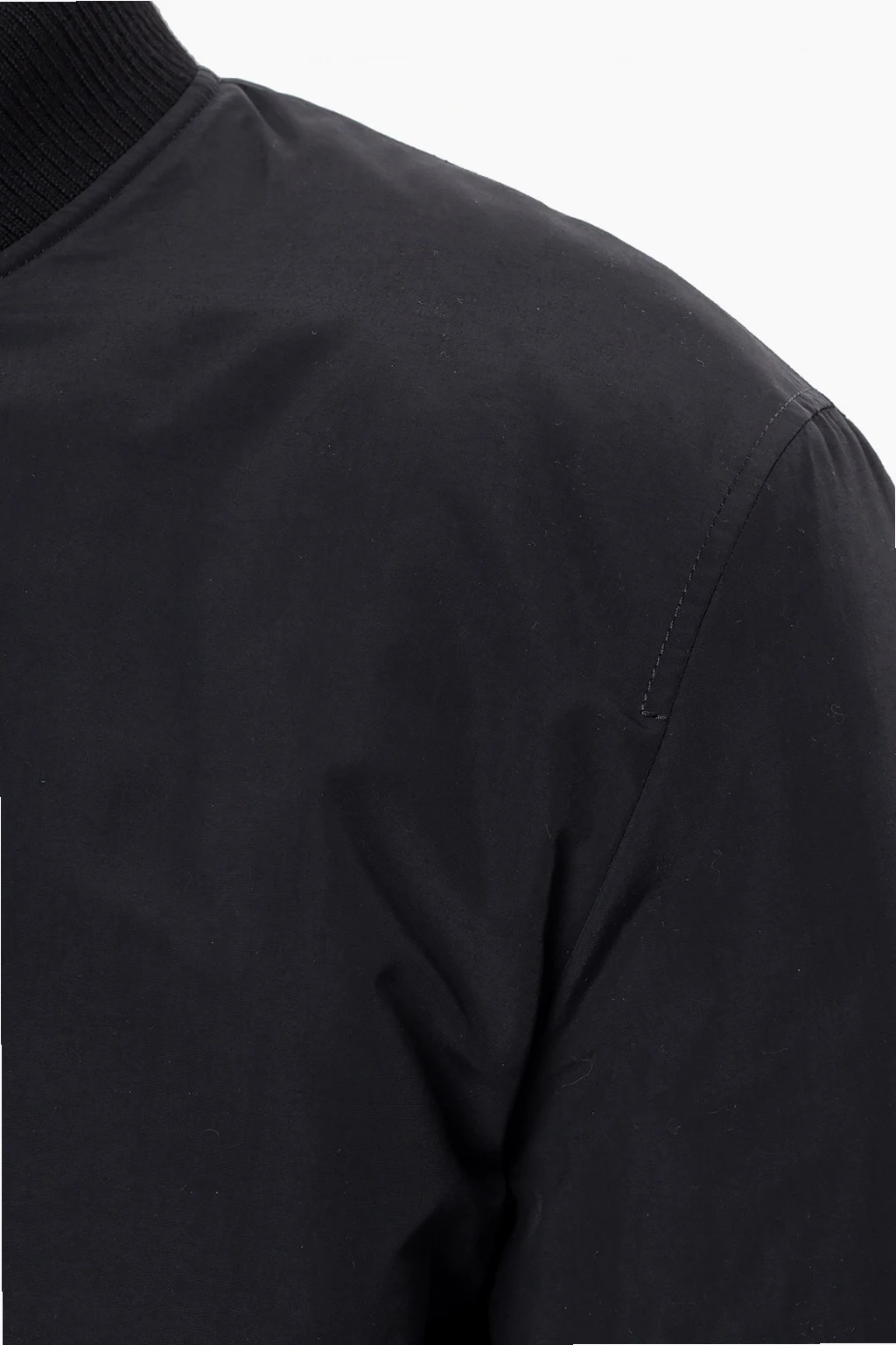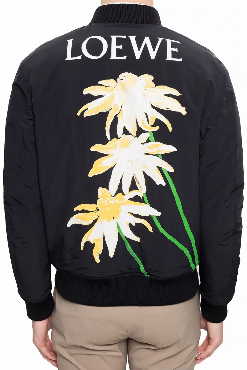 Czarna kurtka typu ‘bomber’ Loewe. Zapinana na zamek. Z przodu dwie kieszenie. Z tyłu kolorowy nadruk z logo. Kołnierz, długie rękawy i dół kurtki zakończone ściągaczem.