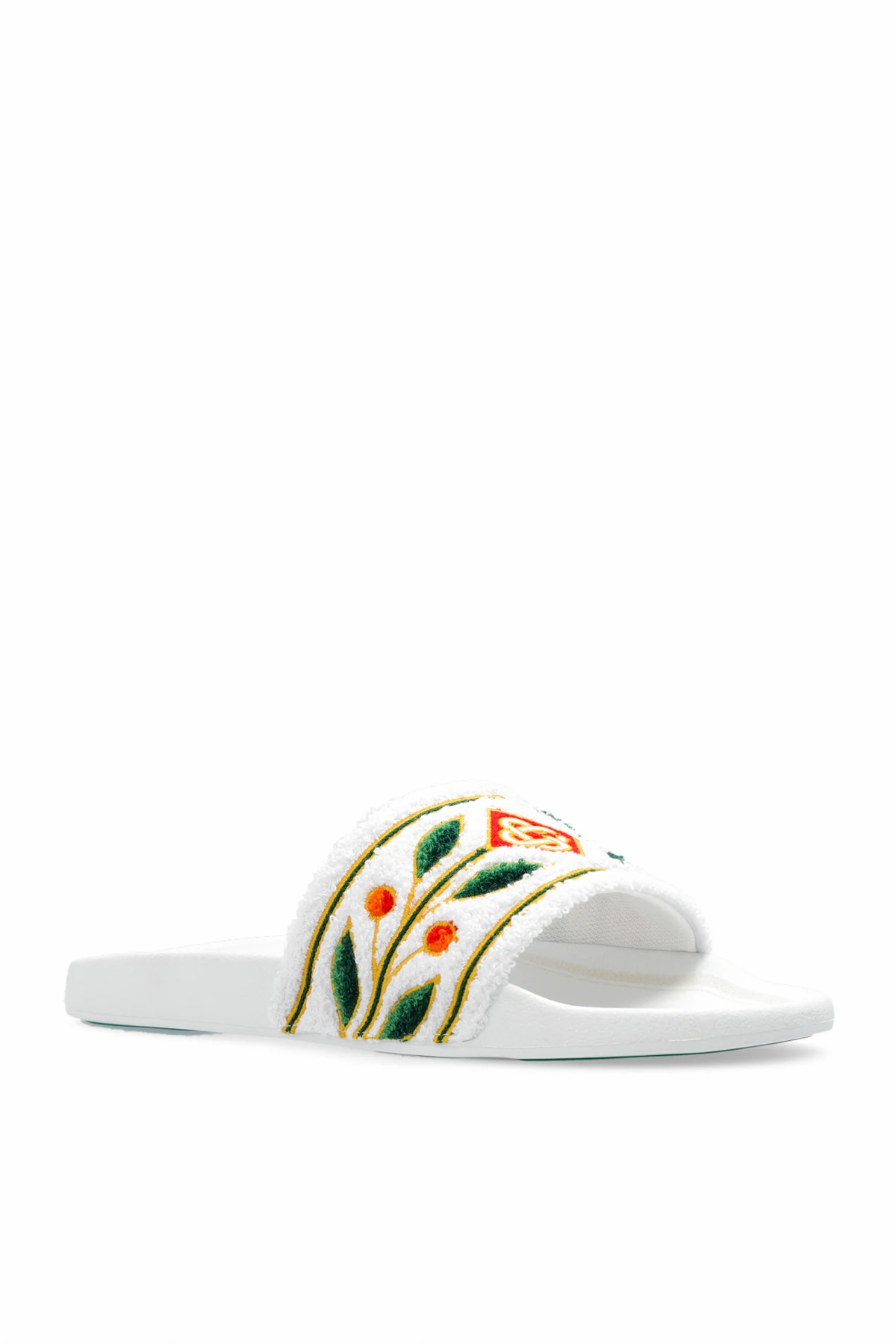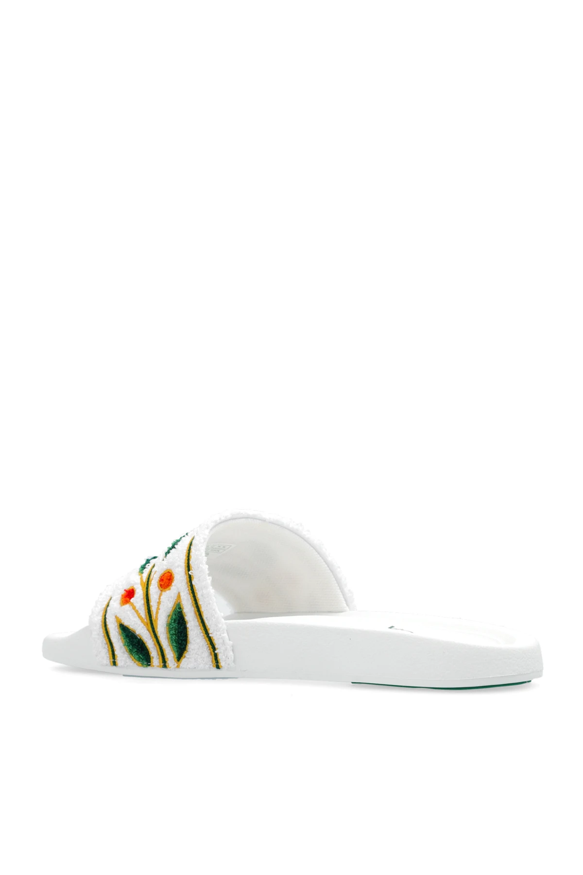Białe klapki Casablanca. Wykonane z materiału typu ‘frotte’. Ozdobione kolorowym, wyszytym wzorem z motywem liści laurowych. Biało-zielona, gumowa podeszwa.