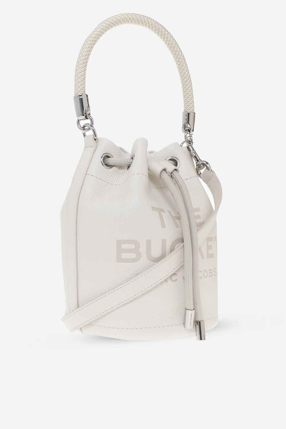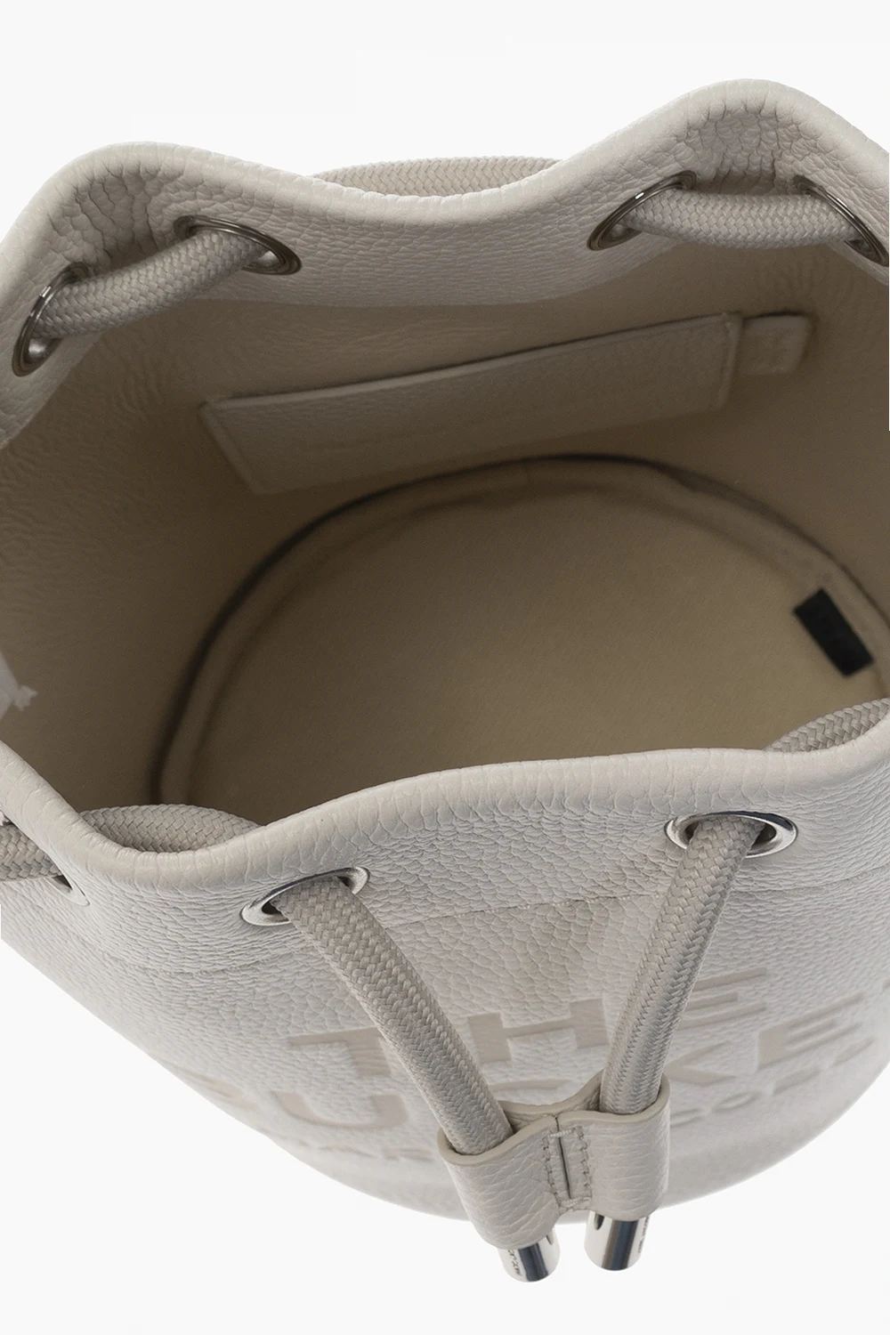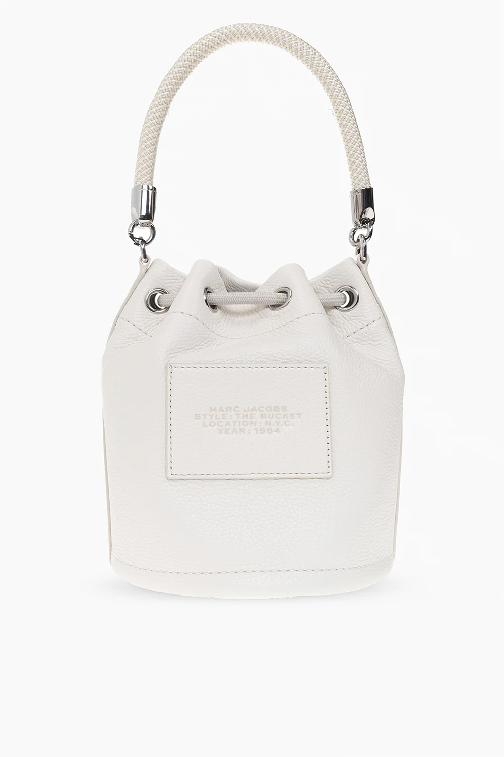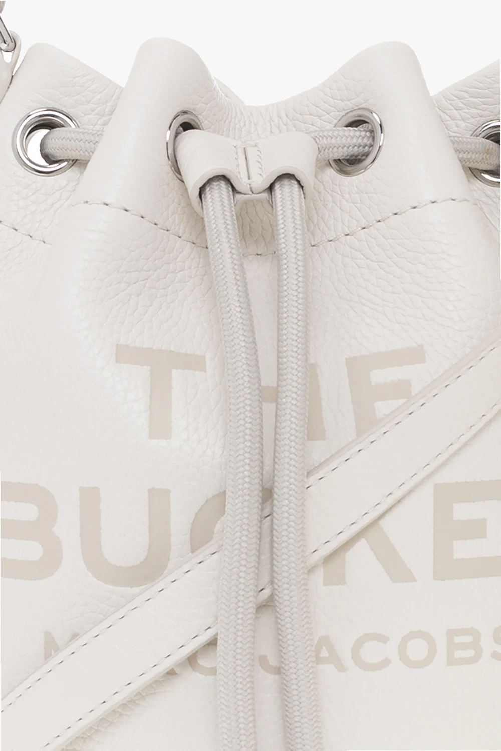 Kremowa torba na ramię, model ‘The Bucket’ Marc Jacobs. Wykonana ze skóry o ziarnistej fakturze. Ściągana trokami. Z przodu wytłoczone logo. Z tyłu naszywka. Kremowo-biała, pleciona rączka oraz odpinany pas na ramię z możliwością regulacji długości. Wewnątrz komora z miejscem na kartę. Metalowe wykończenie w kolorze srebrnym.