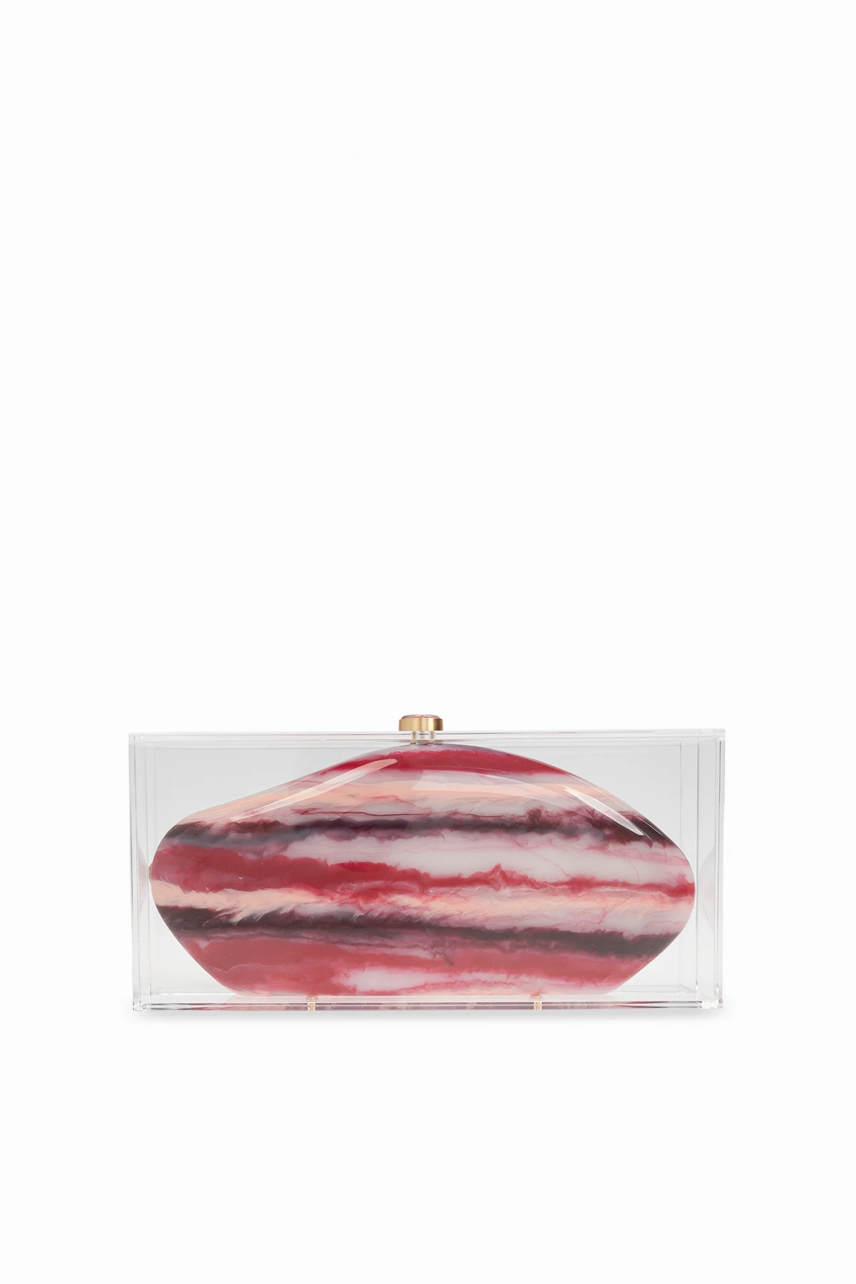 Kształt i Wzór: Kopertówka Annika posiada owalny, zaokrąglony kształt, a jej dominujący wzór to poziome, faliste pasy w różnych odcieniach różu, czerwieni, beżu i czerni, tworzące efekt marmurkowy. To idealny wybór na eleganckie wyjścia i formalne okazje.