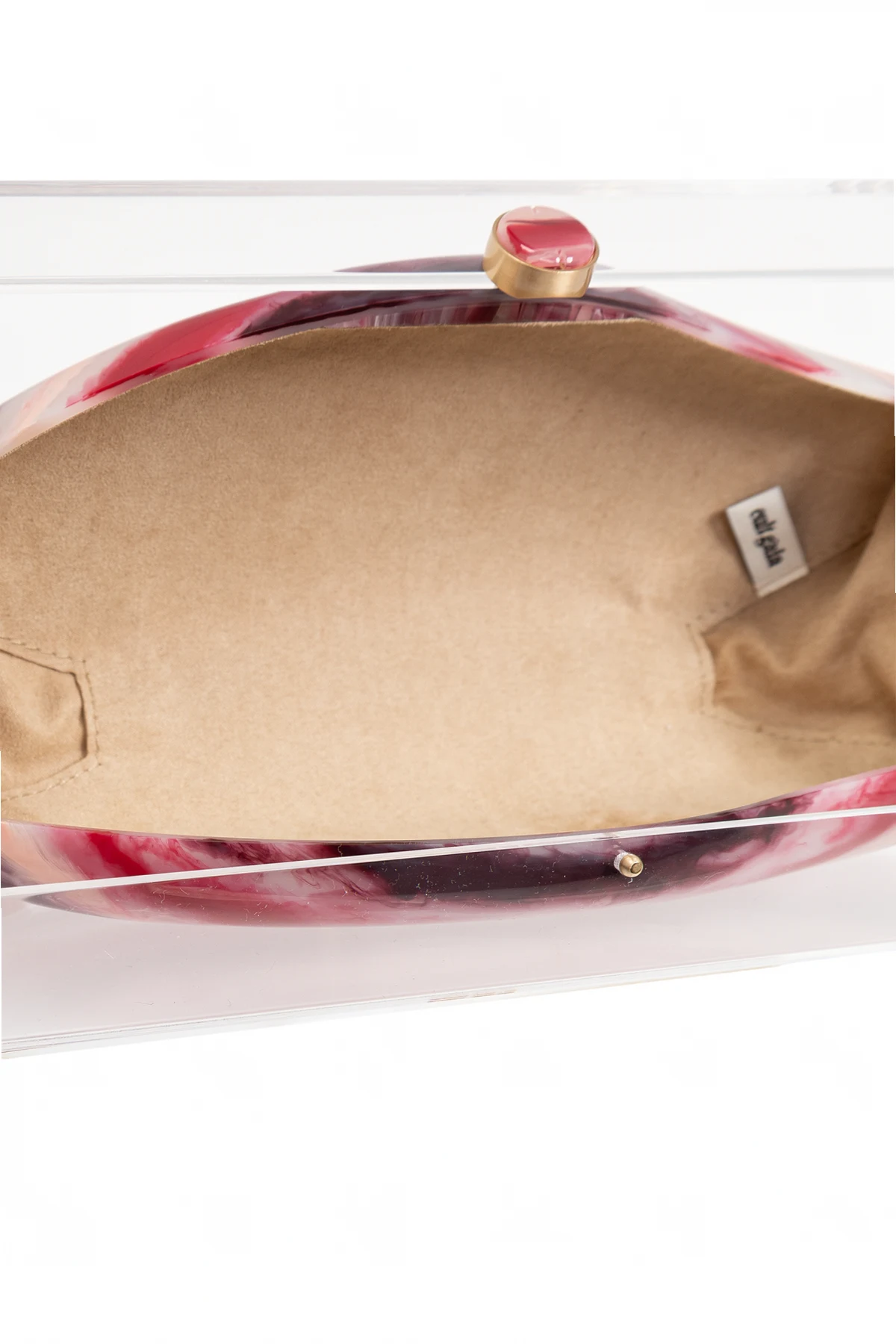 Materiał: Zewnętrzna część kopertówki wykonana jest z połyskującego materiału, prawdopodobnie z akrylu lub żywicy, co nadaje jej luksusowy wygląd. Kopertówka jest osadzona w przezroczystej, akrylowej obudowie, co dodaje jej nowoczesności i elegancji. Wnętrze kopertówki wyłożone jest materiałem w kolorze beżowym, co podkreśla jej ekskluzywny charakter.