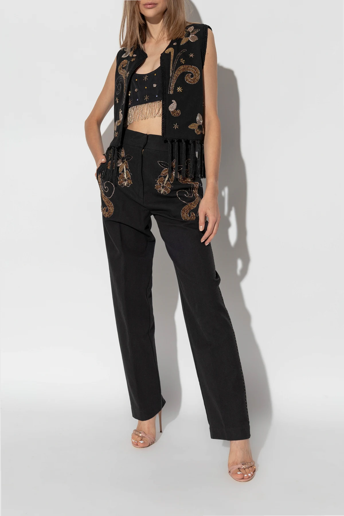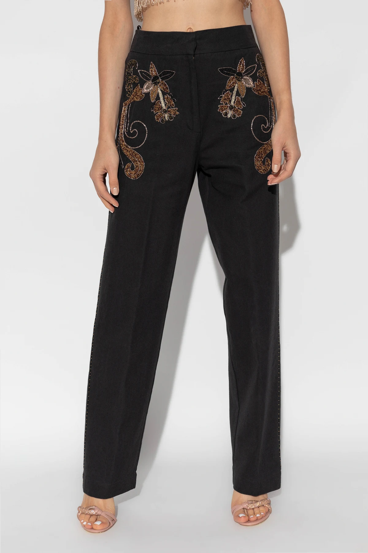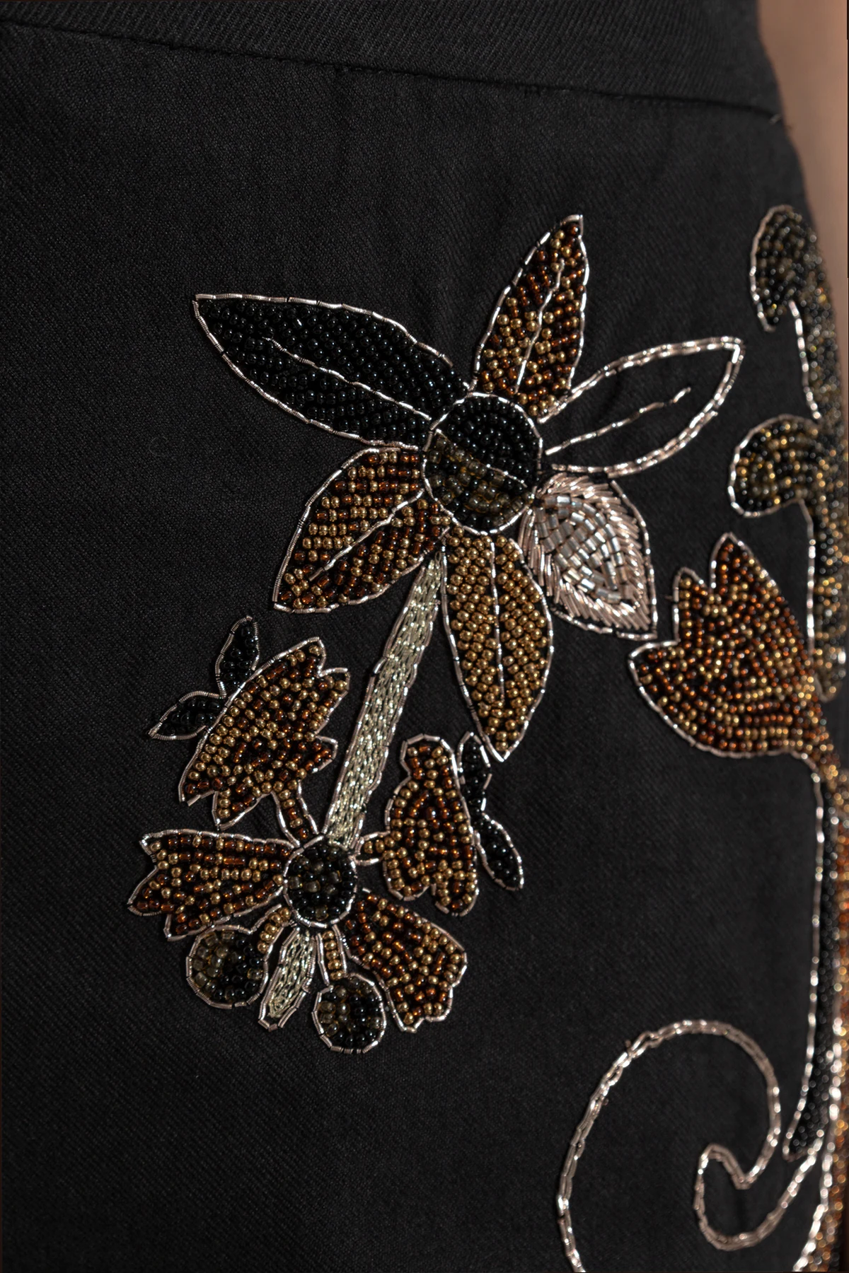 Wyróżniającym elementem spodni są połyskujące aplikacje w postaci kwiatowych motywów, wykonane z drobnych koralików w odcieniach brązu, złota i srebra. Te subtelne zdobienia sprawiają, że spodnie idealnie nadają się zarówno na co dzień, jak i na bardziej formalne okazje.