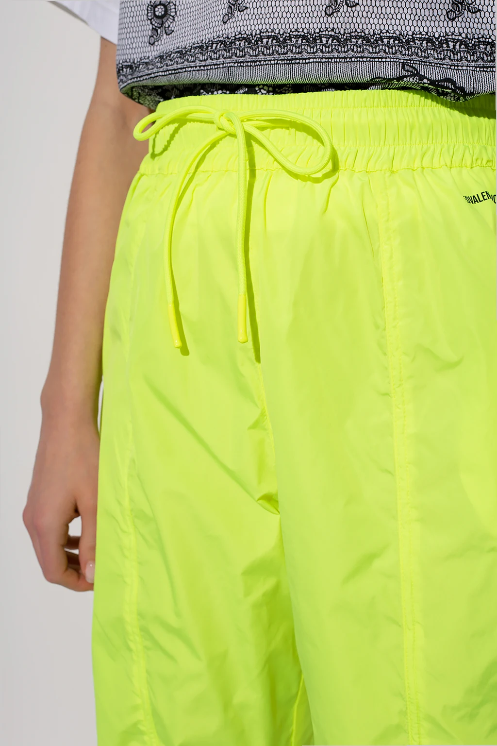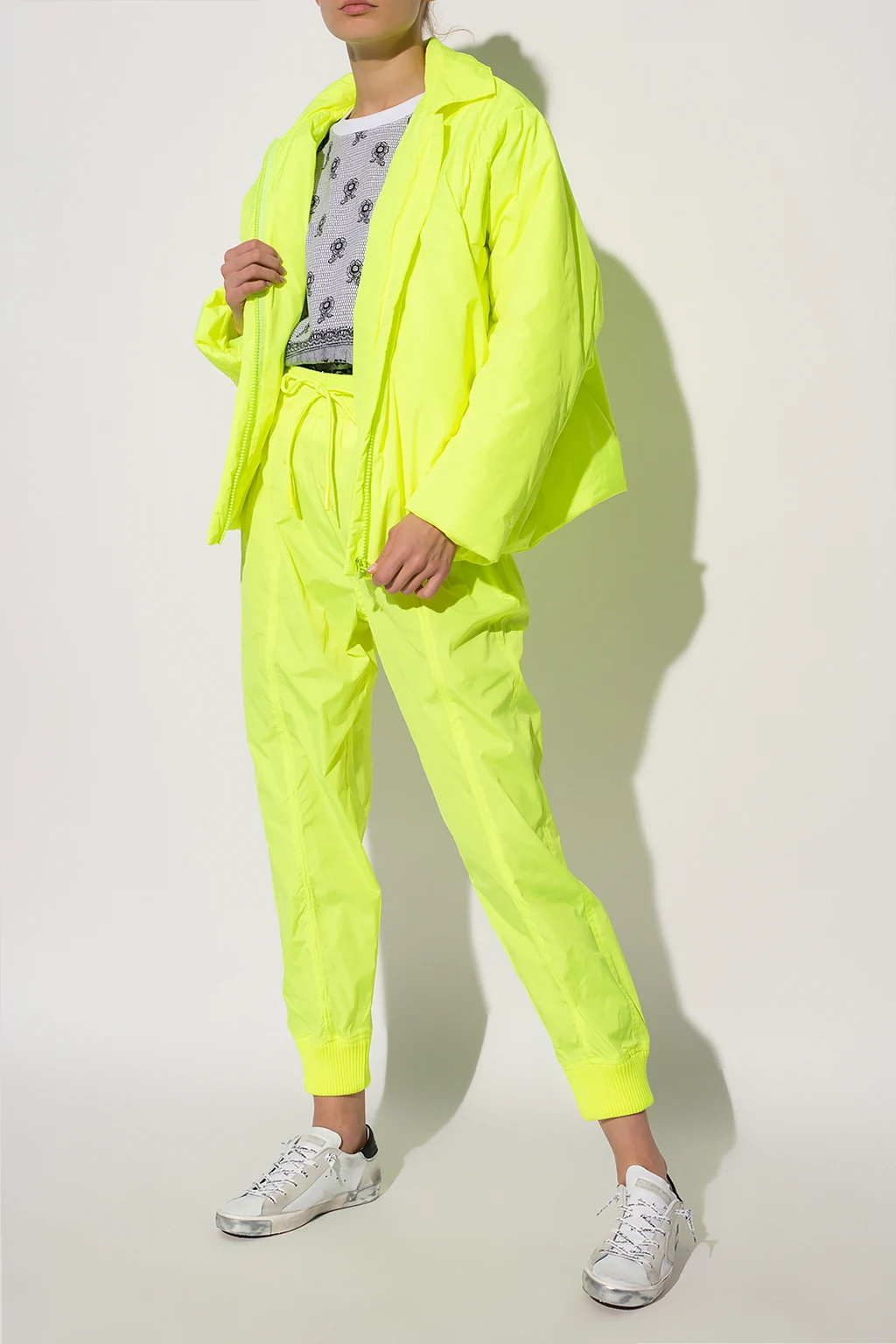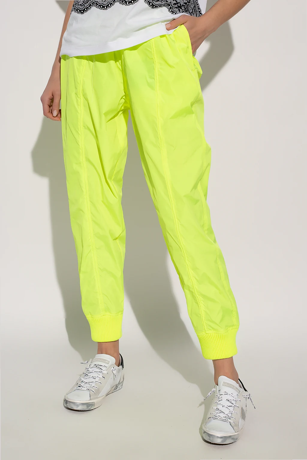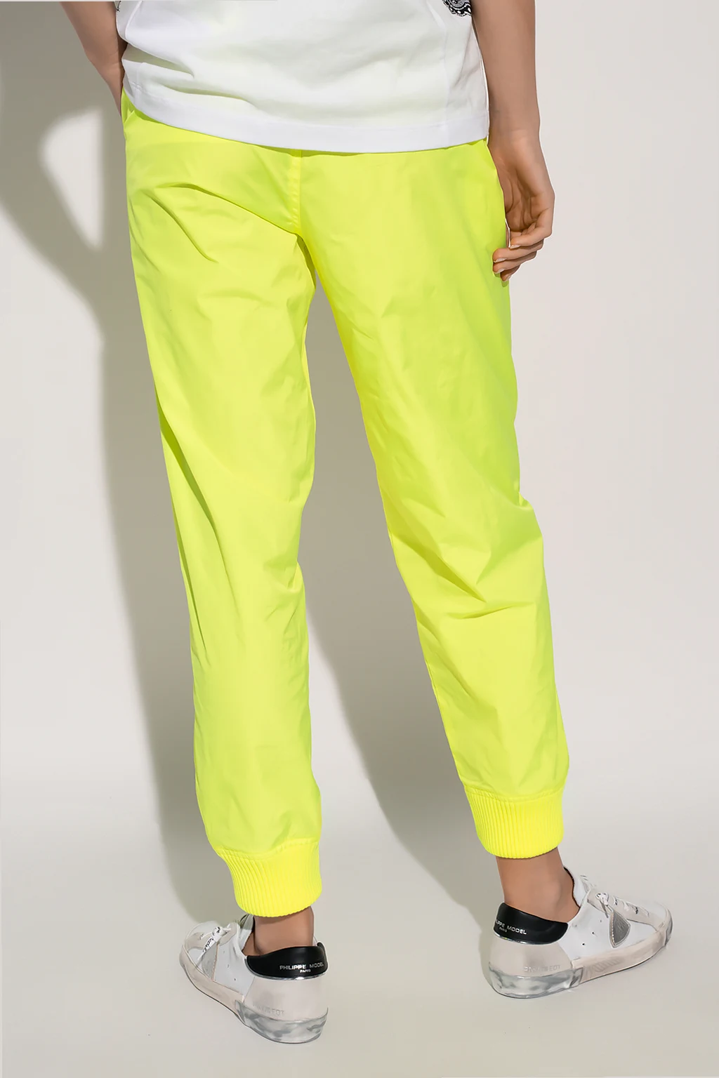 Neonowe spodnie w kolorze żółtym Red Valentino. W pasie wszyta guma ściągana trokami. Ozdobione wzorem z logo w kolorze czarnym. Cztery wsuwane kieszenie. Długie nogawki zakończone ściągaczem.