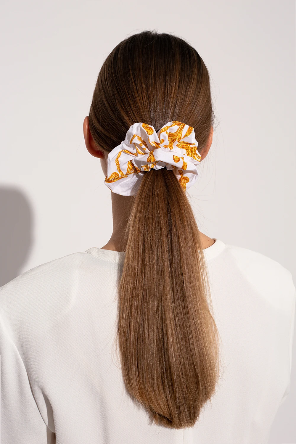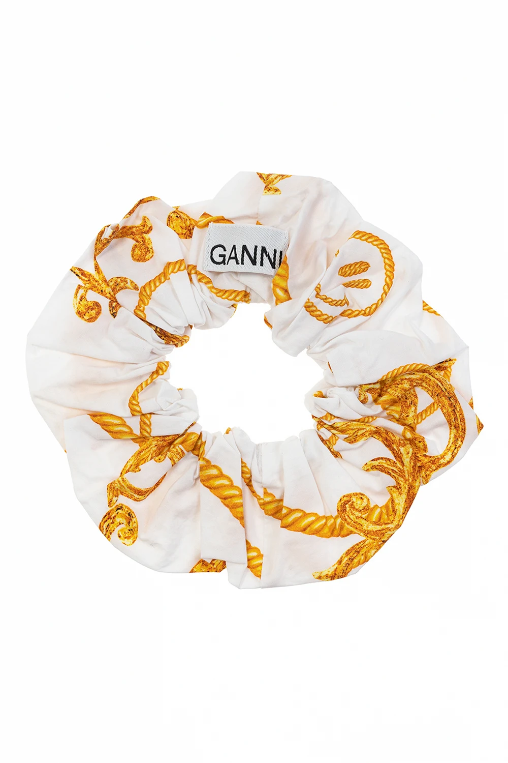 Biała gumka do włosów Ganni. Wykonana z organicznej bawełny. Ozdobiona wzorem z logo w kolorze żółto-pomarańczowym.