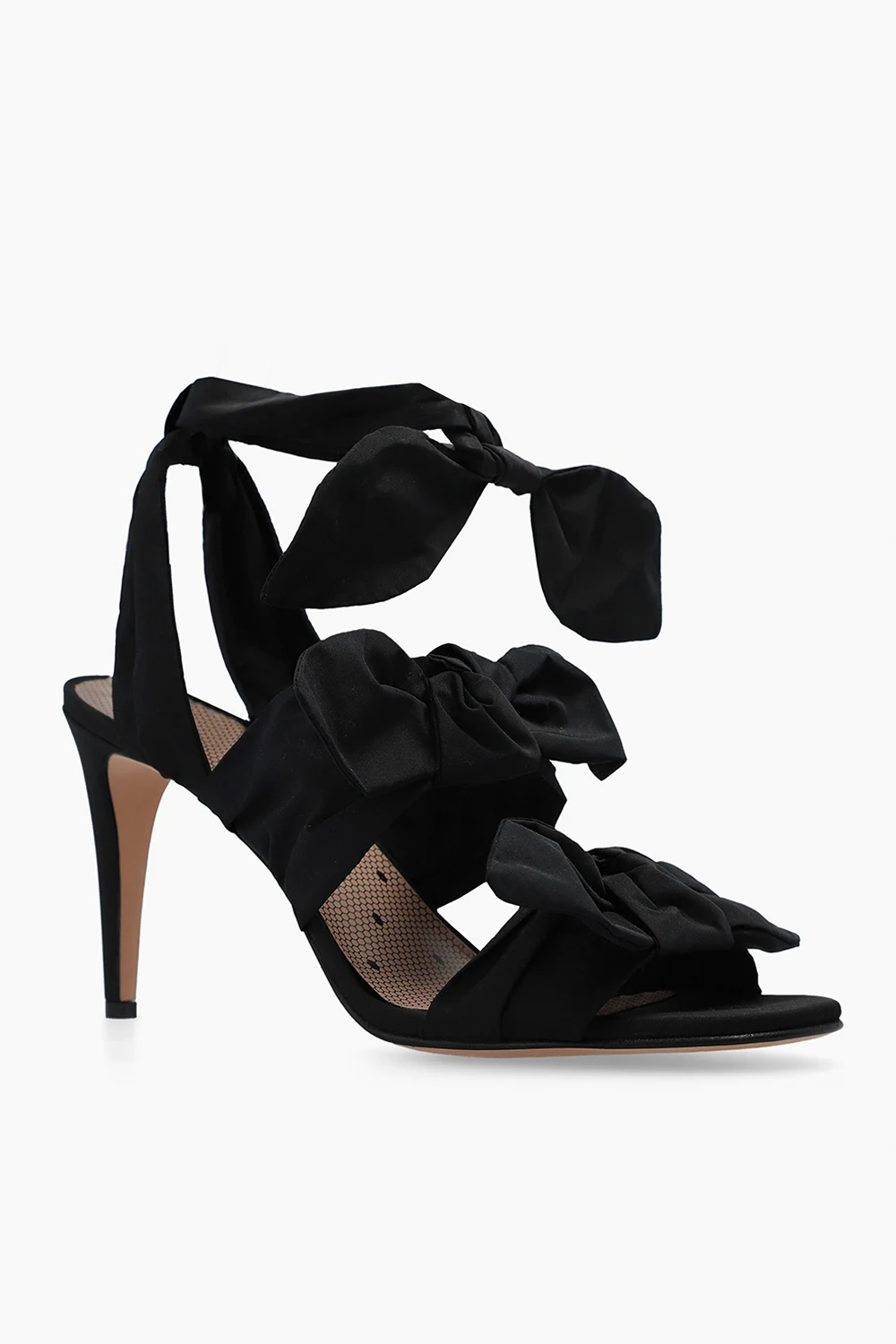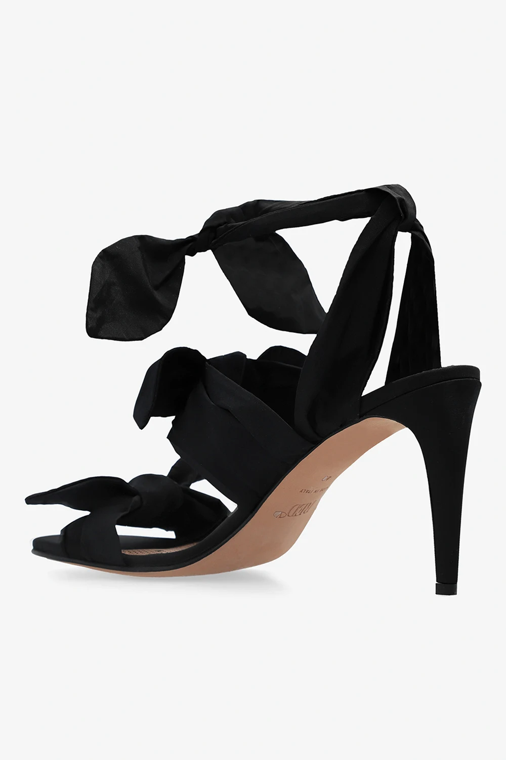 Czarne sandały na obcasie Red Valentino. Wykonane z materiału. Wiązane wokół kostki. Dekoracyjne kokardy. Beżowa, skórzana podeszwa.
