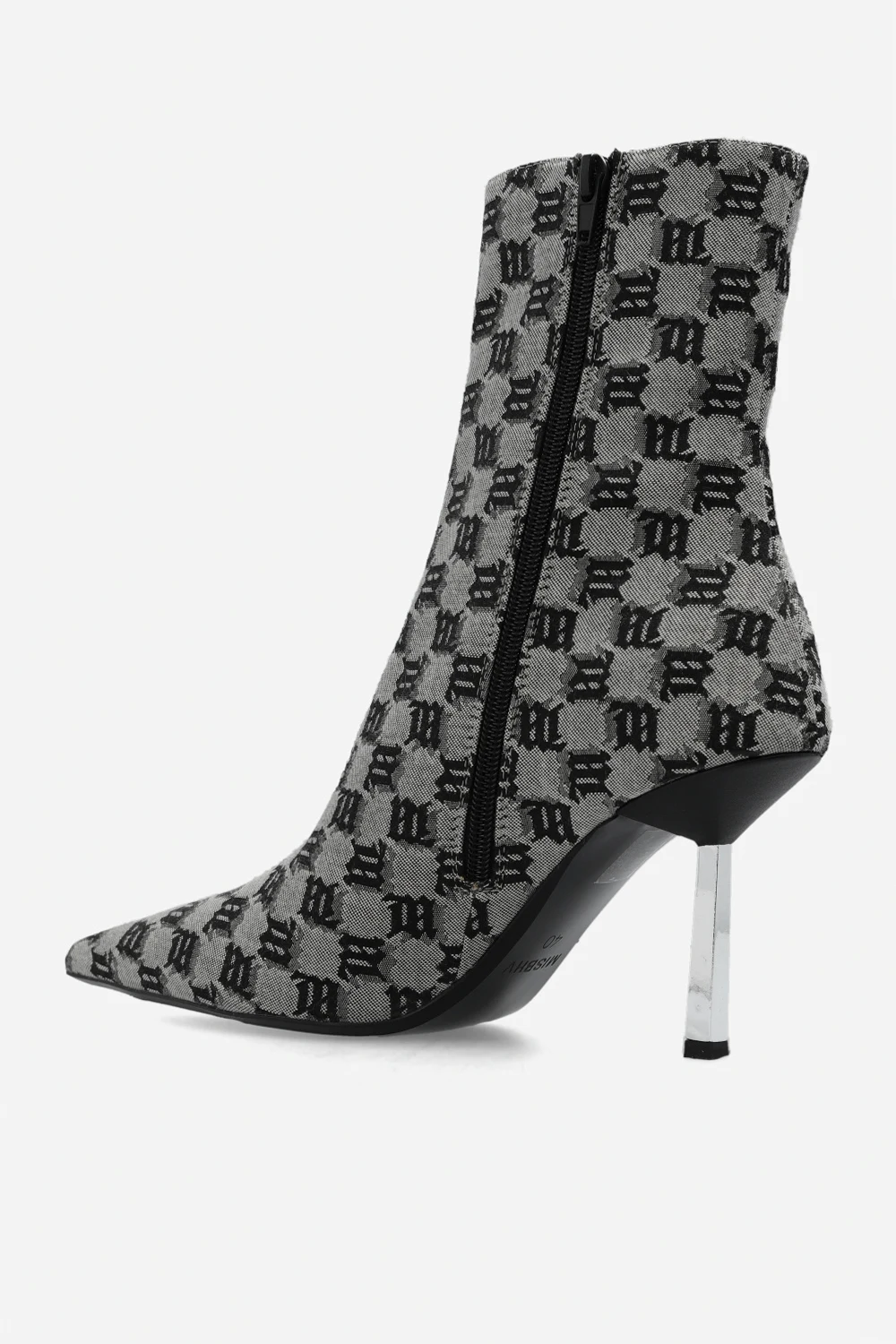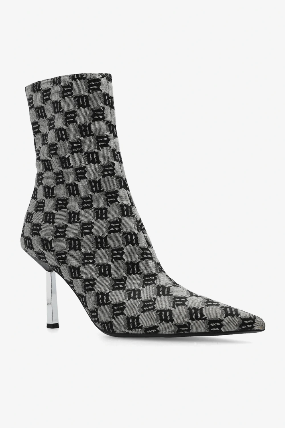 Kremowo-czarne botki na obcasie, model ‘Sasha’ MISBHV. Wykonane z materiału i skóry. Zapięcie na zamek. Nosek w szpic. Ozdobione wzorem z monogramem. Dekoracyjny obcas. Czarna, gumowa podeszwa.