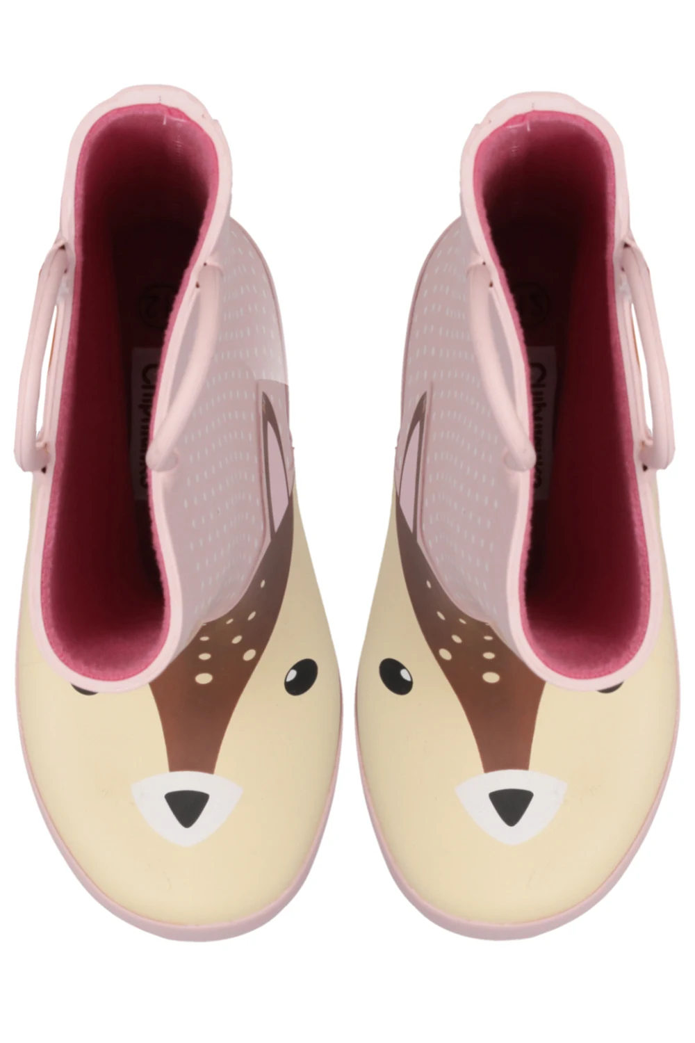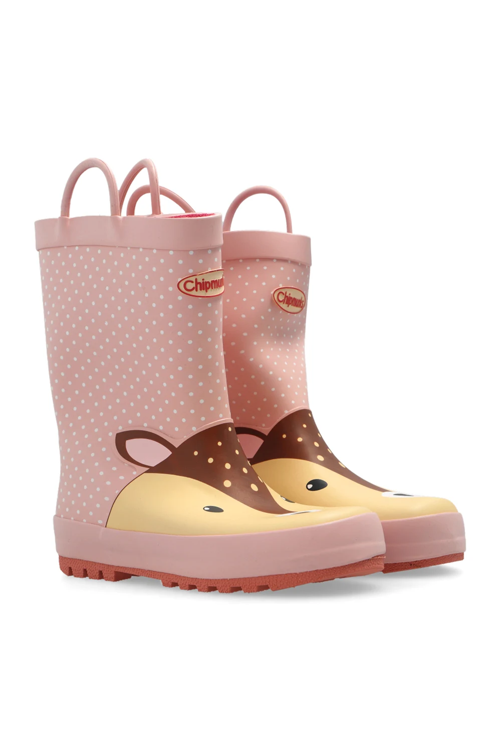 Różowo-beżowo-brązowe, wodoodporne kalosze, model ‘Dillon Doe’ Chipmunks. Ozdobione wzorem z motywem zwierzęcym oraz wypukłym logo. Dwie półokrągłe rączki ułatwiające wsuwanie. Tekstylne wnętrze. Różowa, gumowa podeszwa.