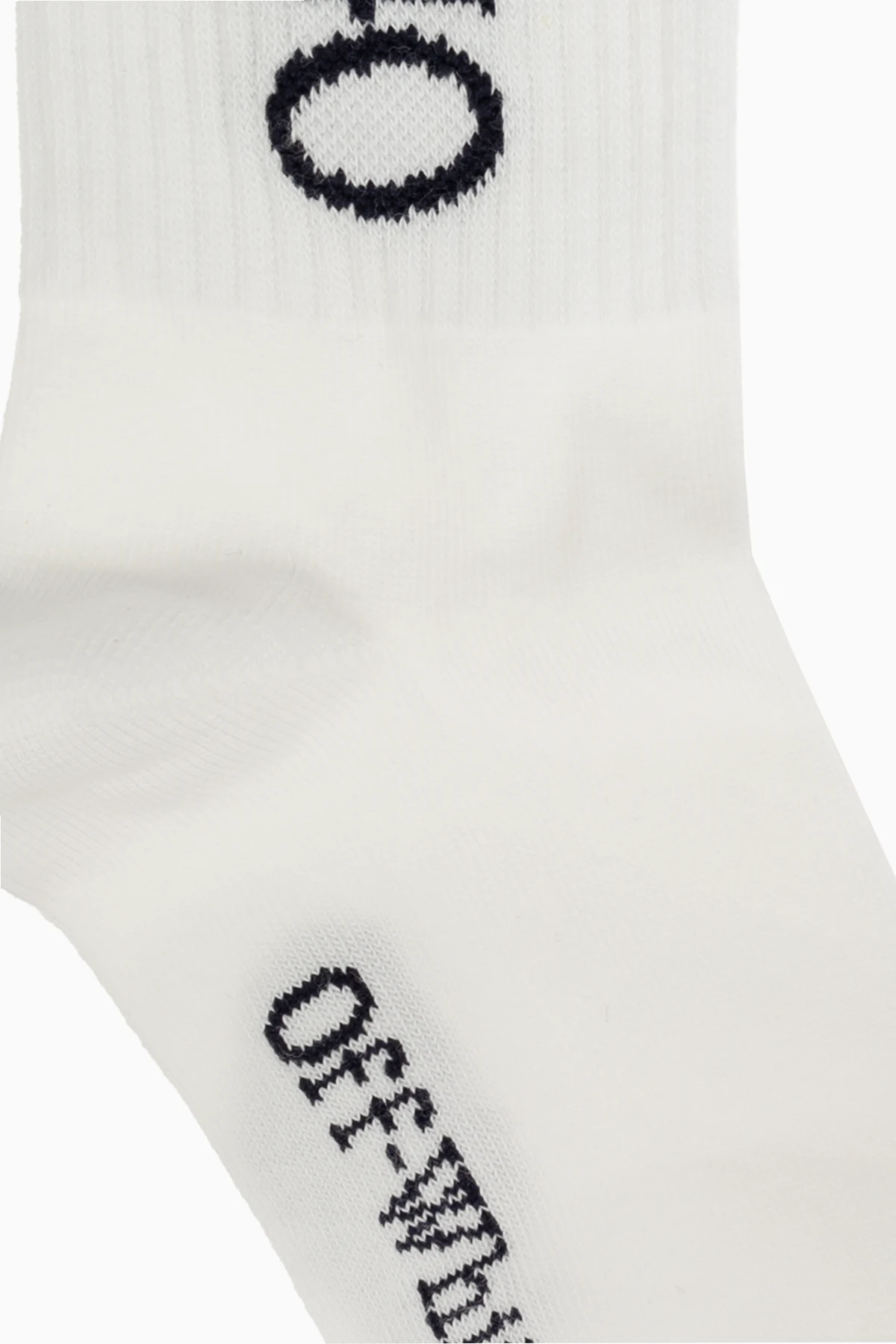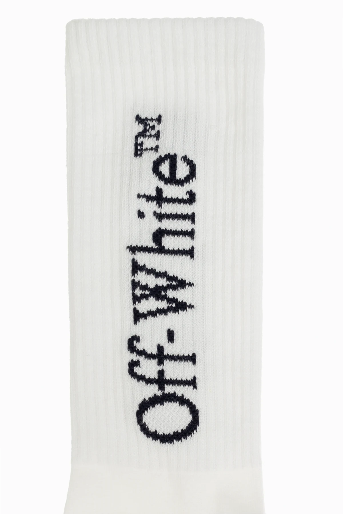 Charakterystyczny, pionowy napis "Off-White" zdobi zewnętrzną stronę każdej skarpety oraz dolną część w okolicach palców, co podkreśla ich unikatowość i ekskluzywność. Napis na cholewce posiada również zastrzeżony znak towarowy "™", co stanowi o oryginalności produktu.