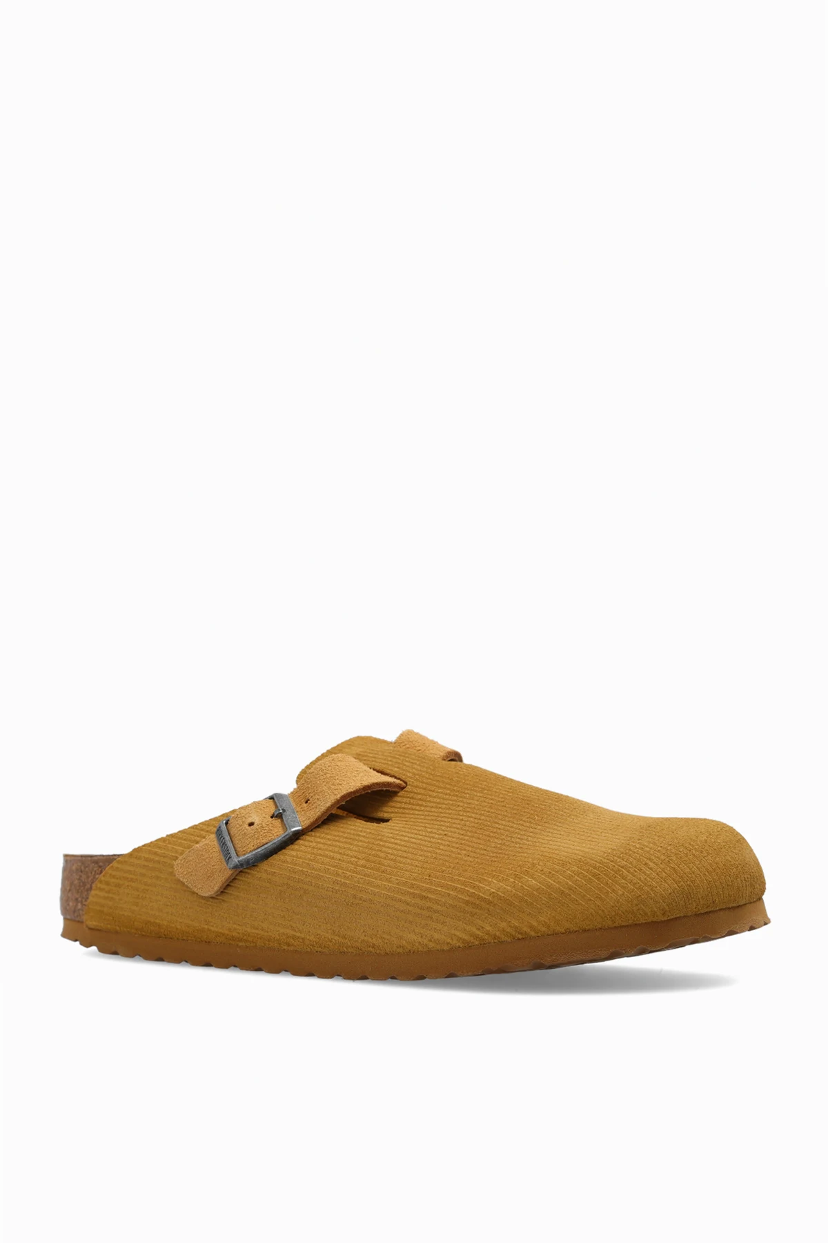 Jasnobrązowe klapki, model ‘Boston BS’ Birkenstock. Wykonane z prążkowanego zamszu. Cholewka o zwężanej szerokości. Z przodu pasek z klamrą z wytłoczonym logo. Brązowa podeszwa wykonana z naturalnego korka oraz pianki EVA.