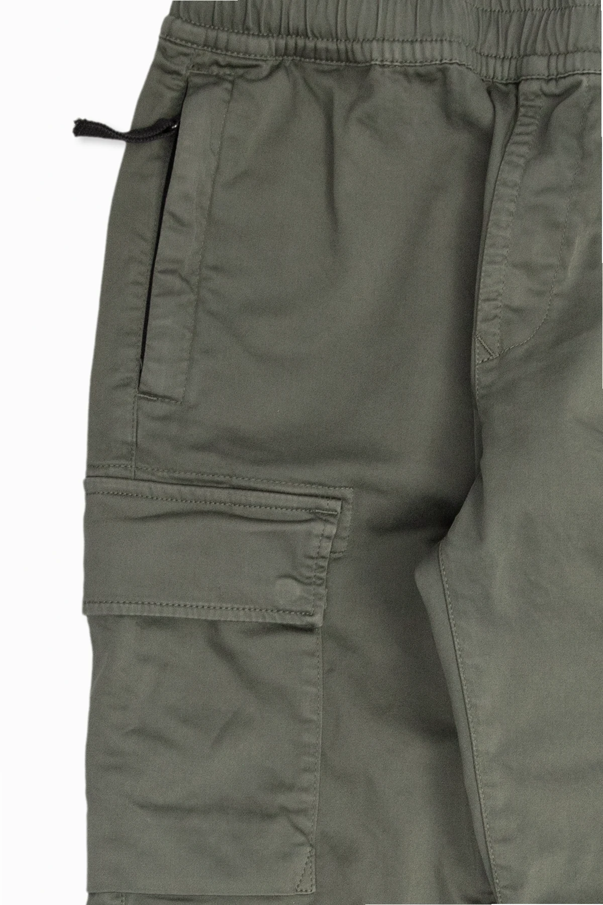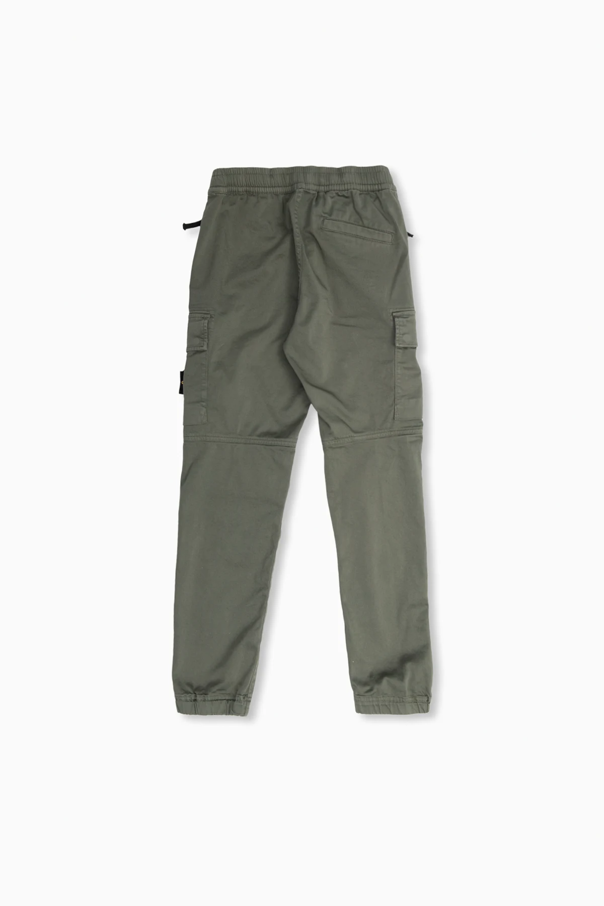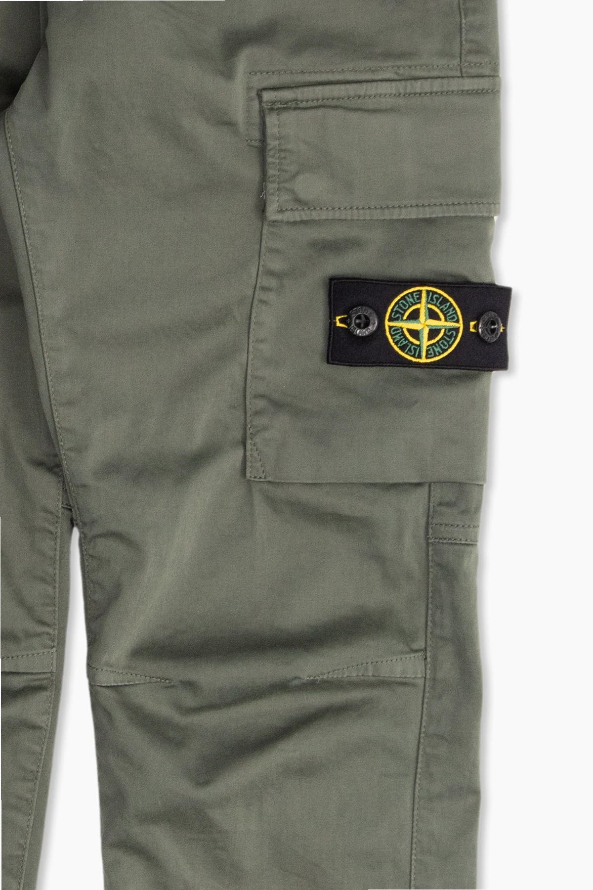 Zielone spodnie Stone Island Kids. Wykonane z bawełny. W pasie wszyta guma ściągana trokami. Liczne kieszenie. Ozdobione naszywką z logo. Nogawki zakończone ściągaczem.