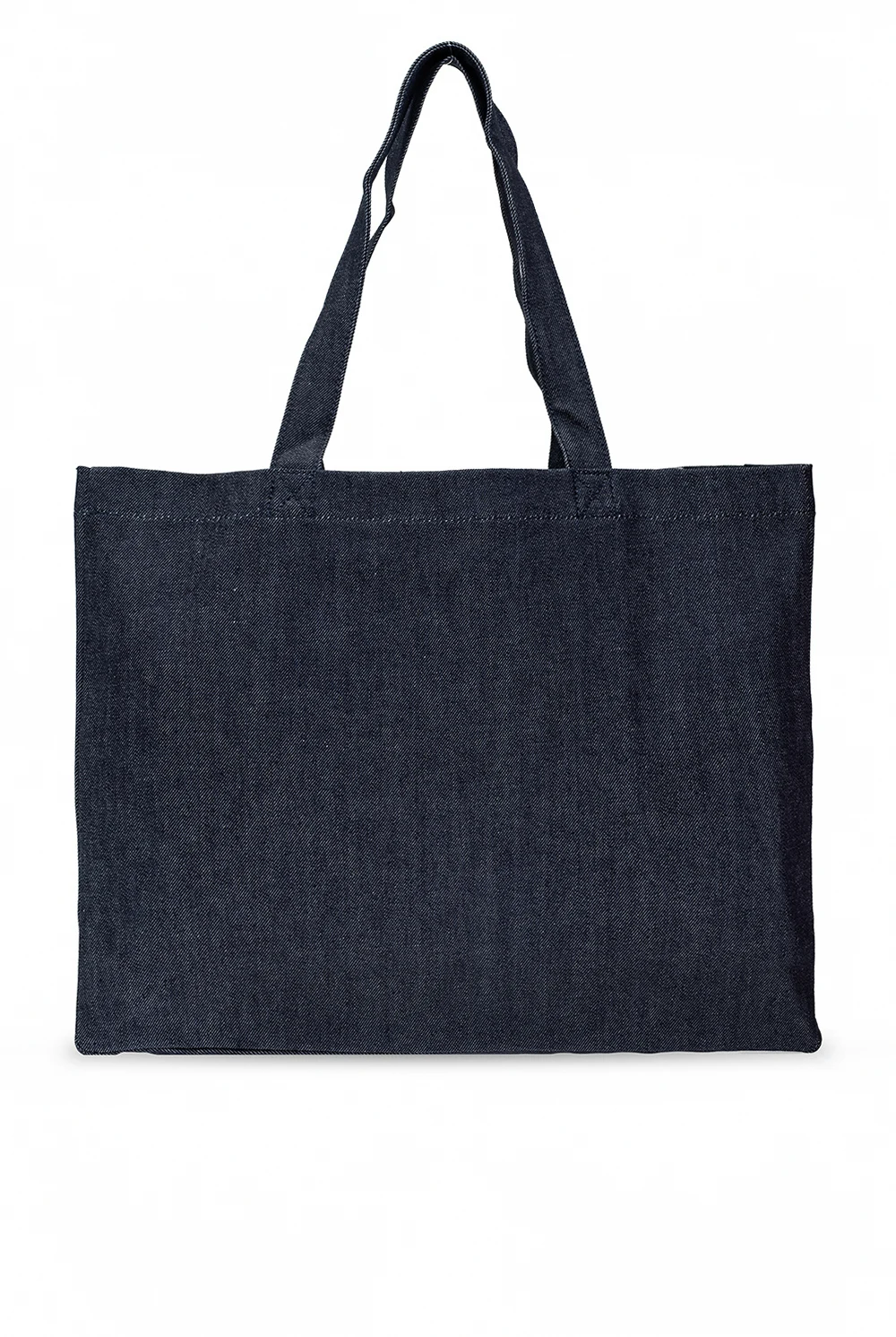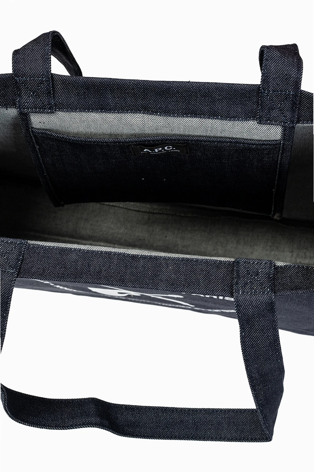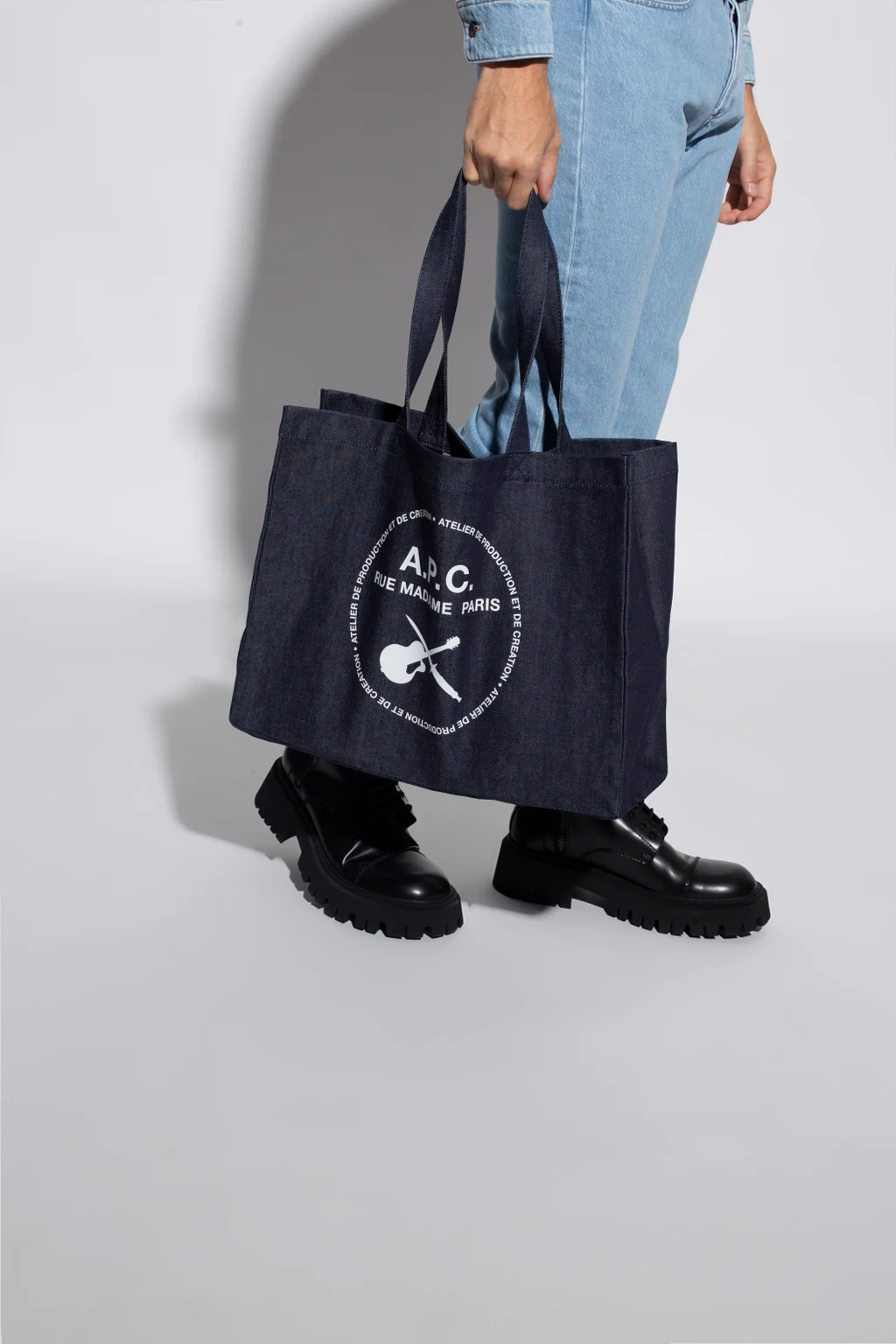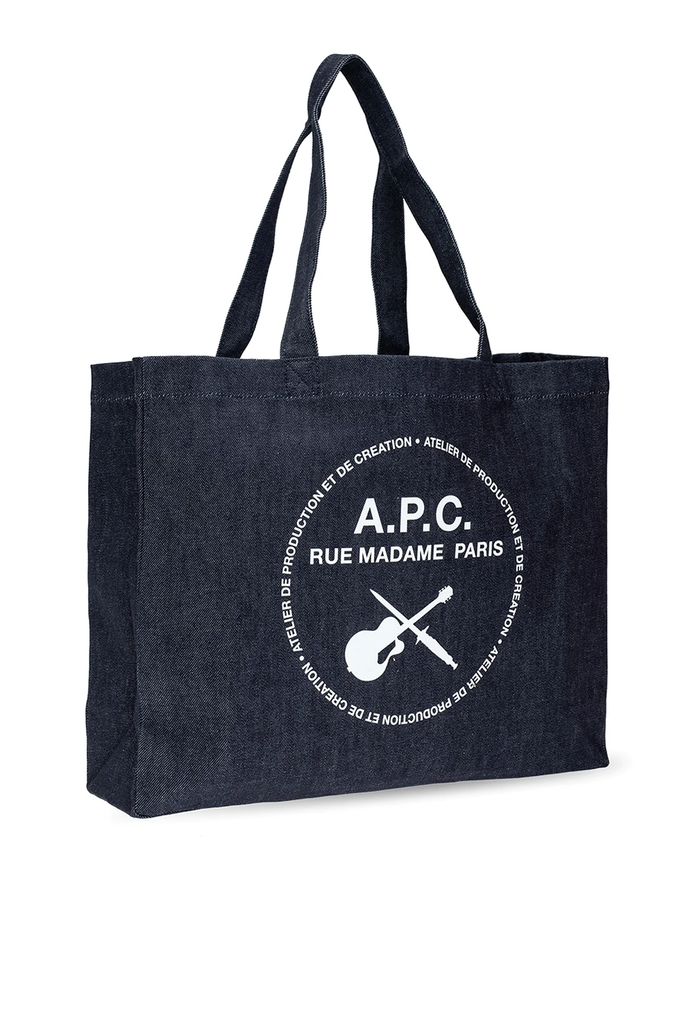 Granatowa torba typu ‘shopper’ A.P.C. Z przodu ozdobiona białym nadrukiem z logo. Dwie półokrągłe rączki. Wewnątrz komora i wsuwana kieszeń.