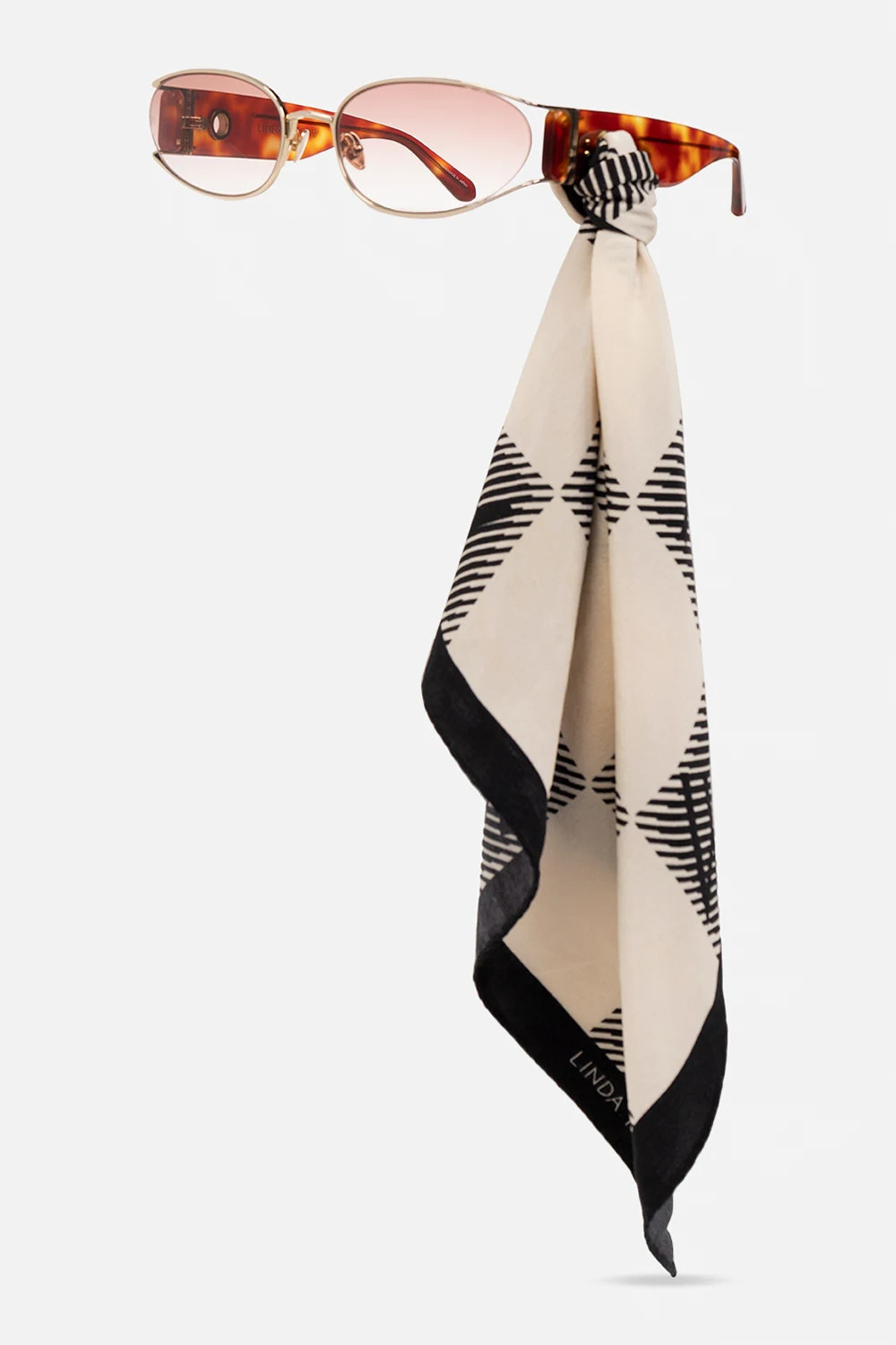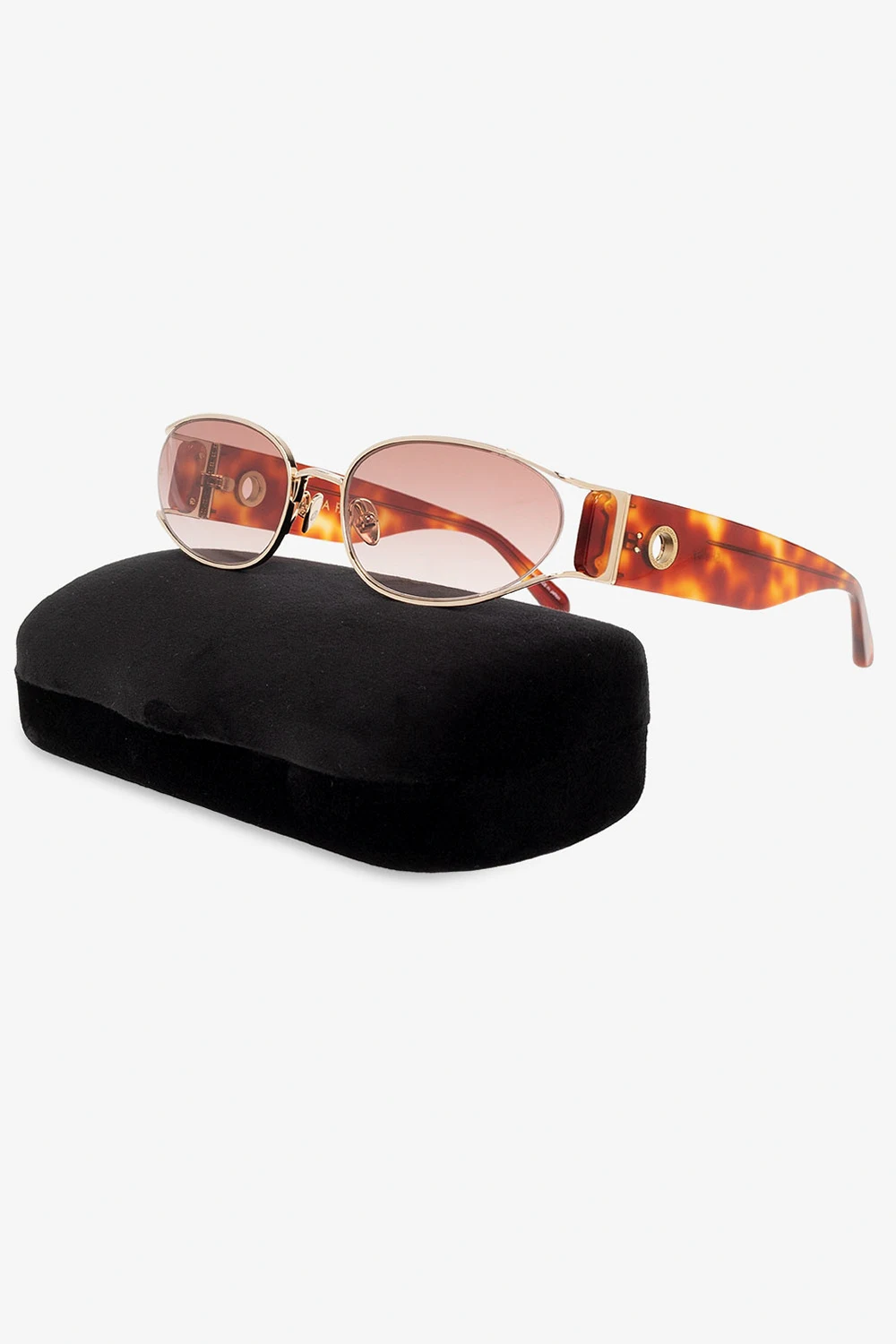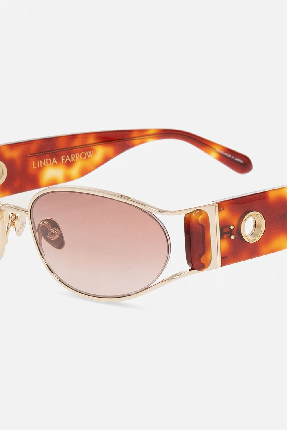 Okulary przeciwsłoneczne w kolorze brązowo-złotym, model ‘Shelby’ Linda Farrow. Oprawki w kształcie kociego oka z tytanową, pozłacaną 18-karatowym złotem ramą, pojedynczym mostkiem i regulowanymi noskami ozdobionymi wygrawerowanym monogramem. Szylkretowe, szerokie zauszniki z charakterystycznym dla marki oczkiem z logo. Różowe, gradientowe soczewki ze 100% ochroną przeciw promieniom UV. Dołączone etui. Ręcznie wykonane w Japonii.