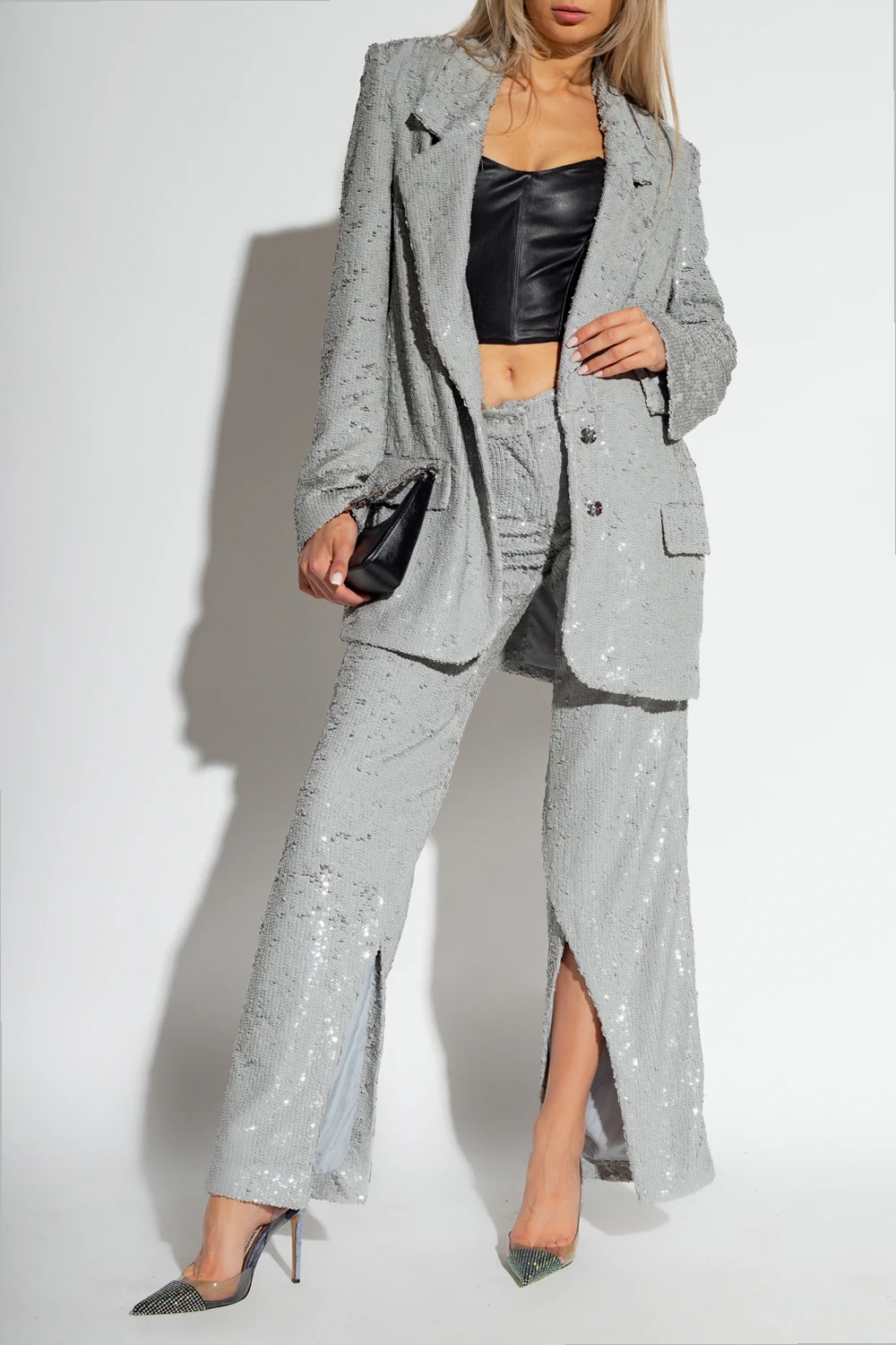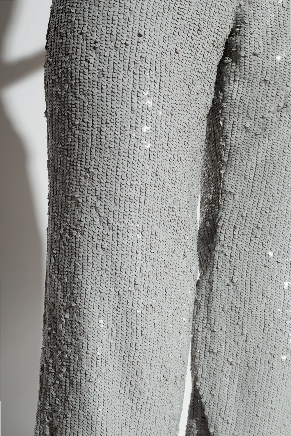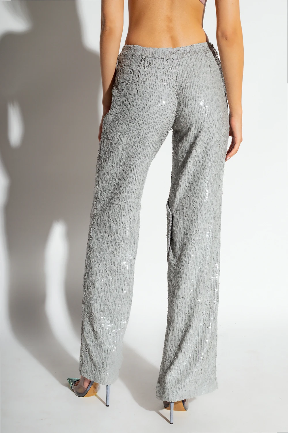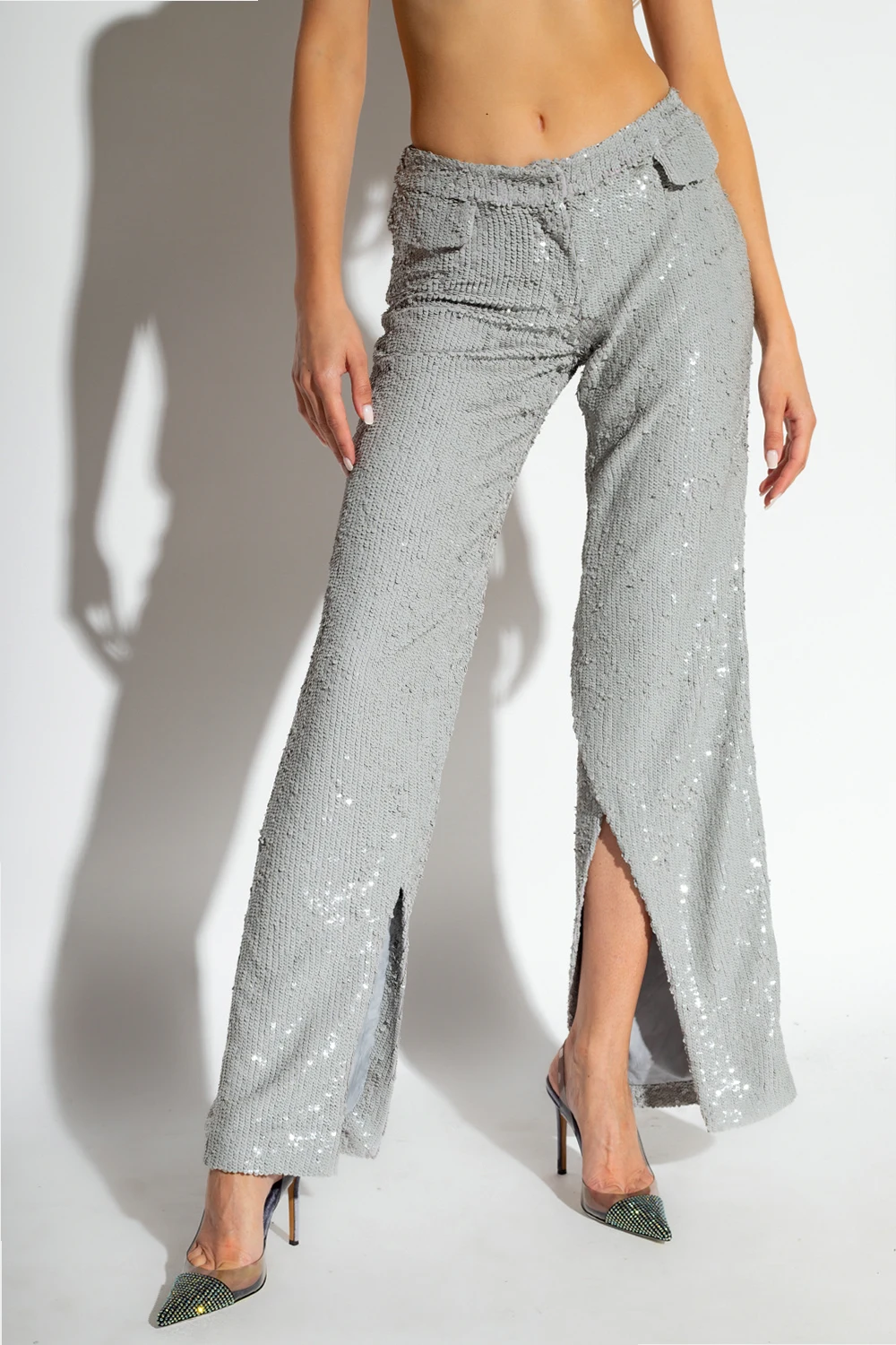 Szare spodnie, model ‘Eljas’ The Mannei. Wykonane z materiału całkowicie pokrytego połyskującymi cekinami. Zapinane na zaczep, zatrzask i zamek. Z przodu dwie dekoracyjne patki. Długie, rozszerzane nogawki z rozcięciem po bokach.