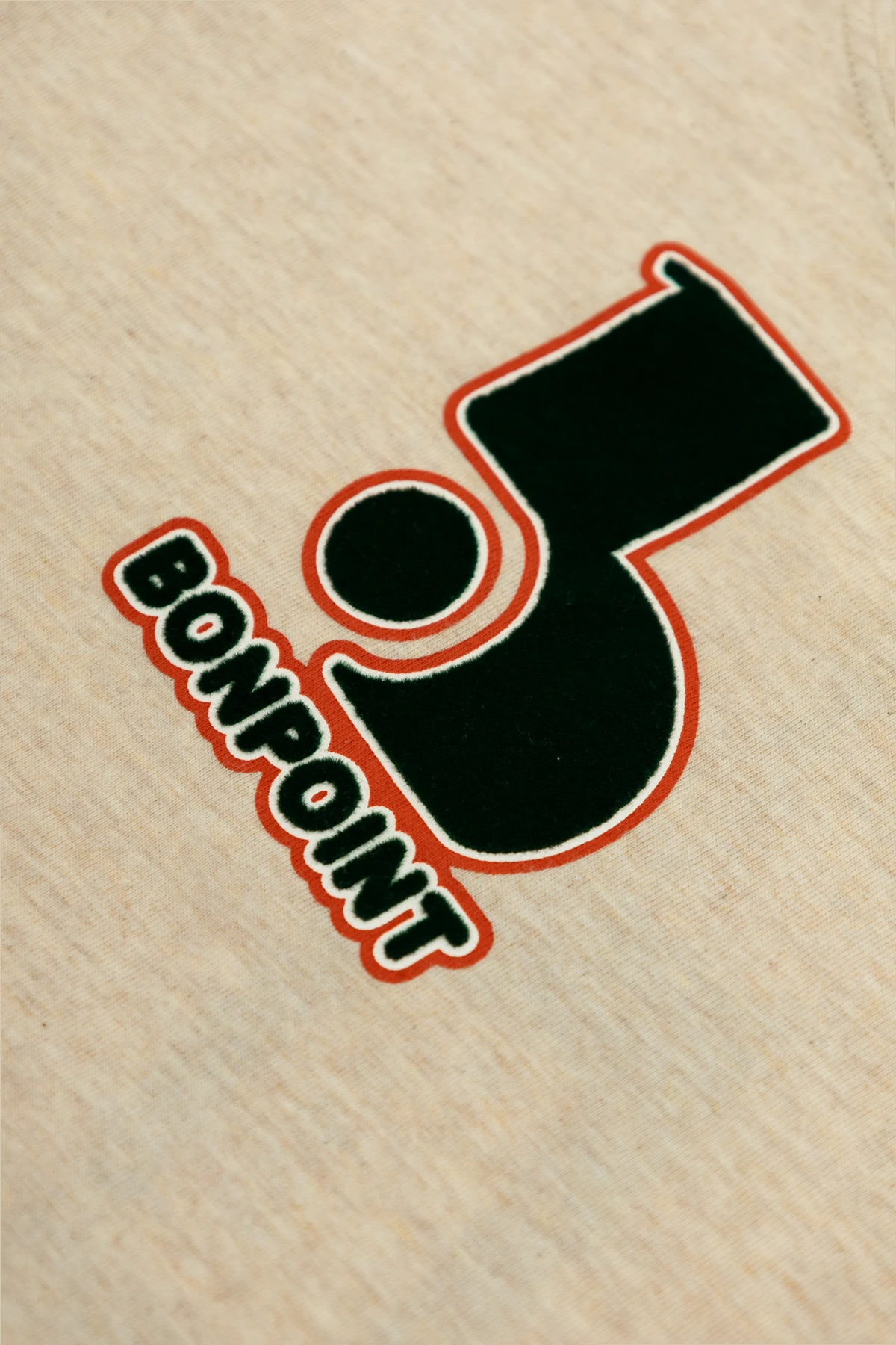 Dominującym kolorem tego modelu jest elegancki jasnobeżowy, który doskonale współgra z dużym logo marki Bonpoint na przodzie. Logo, w kolorze czarnym z czerwonym konturem, stanowi centralny punkt dekoracyjny, a pod nim znajduje się napis "BONPOINT" w tym samym kolorze.