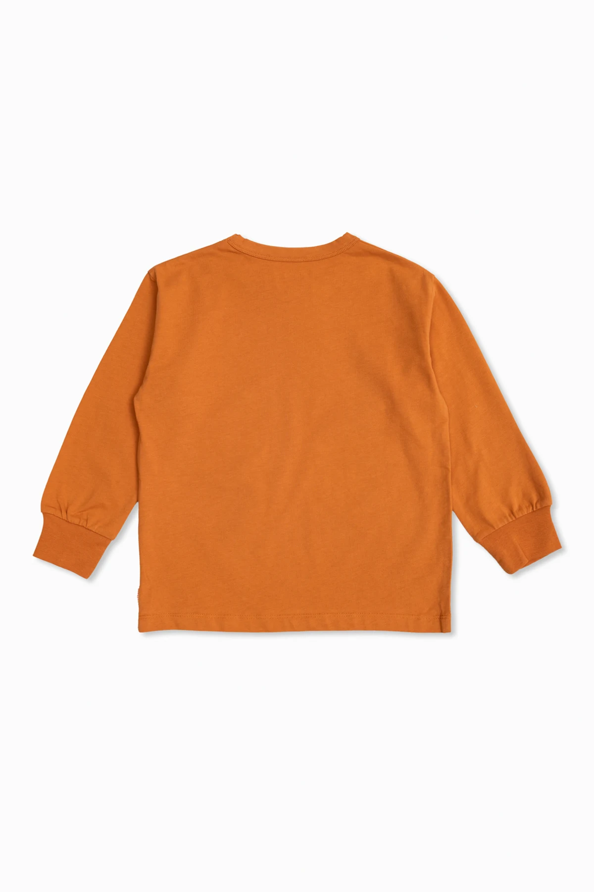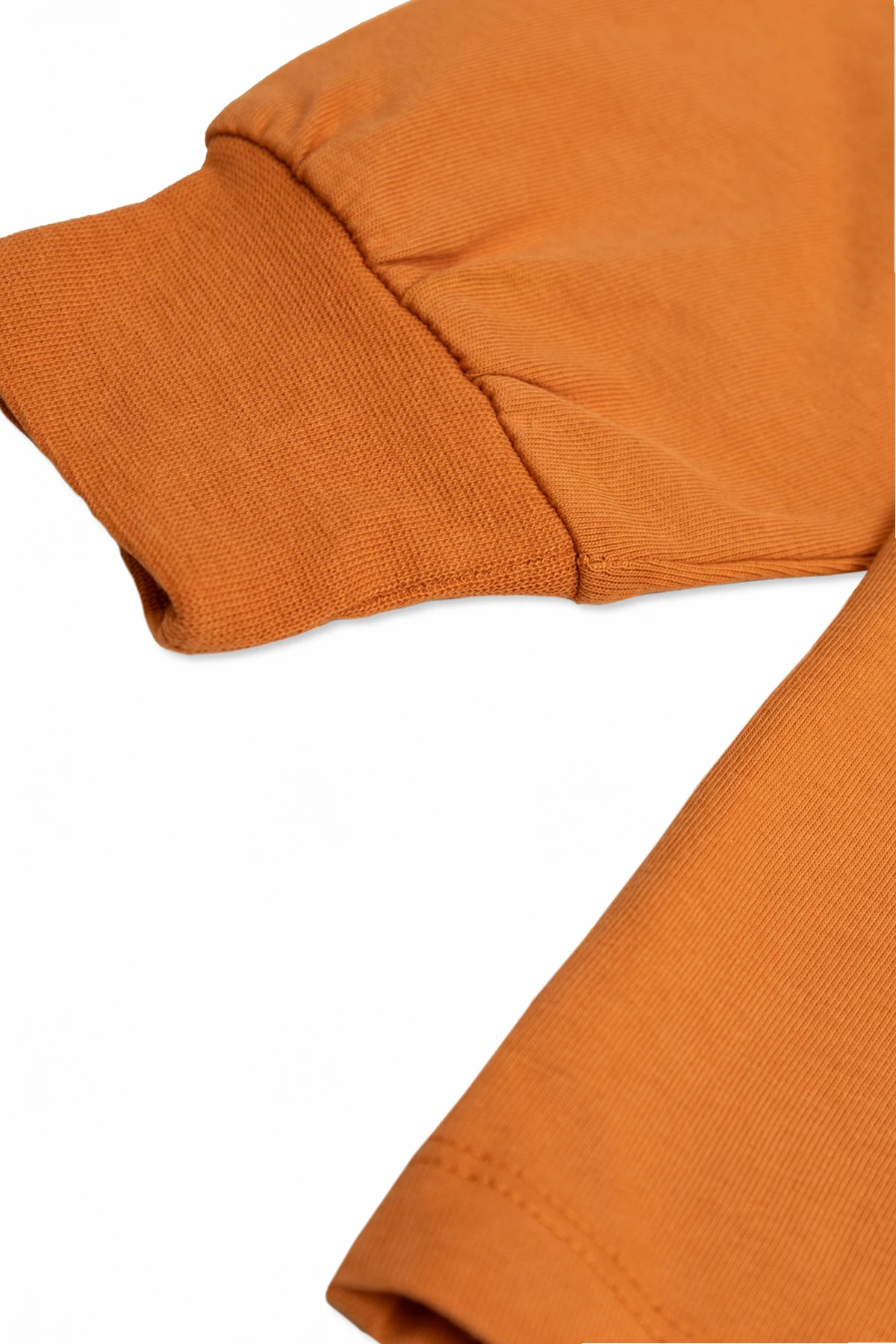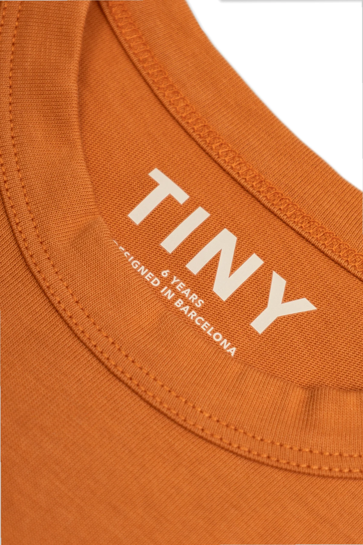 T-shirt z nadrukiem to wyjątkowa koszulka dziecięca z długim rękawem, która wprowadza do garderoby Twojego dziecka odrobinę elegancji i zabawy. Przód koszulki zdobi uroczy nadruk przedstawiający dwa psy w kapeluszach i muszkach, trzymające niebieską piłkę, nad którymi widnieje napis "TINY". Całość wykonana jest z jednolitego, pomarańczowego materiału, który jest miękki i wygodny, najprawdopodobniej bawełniany.