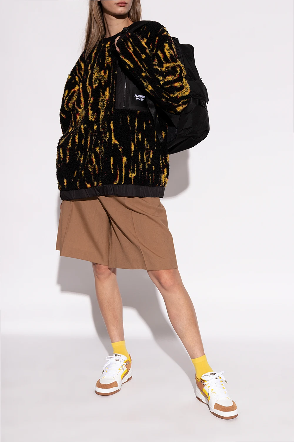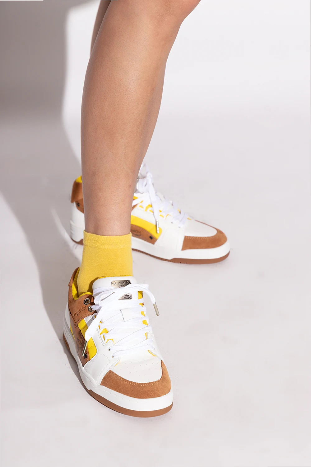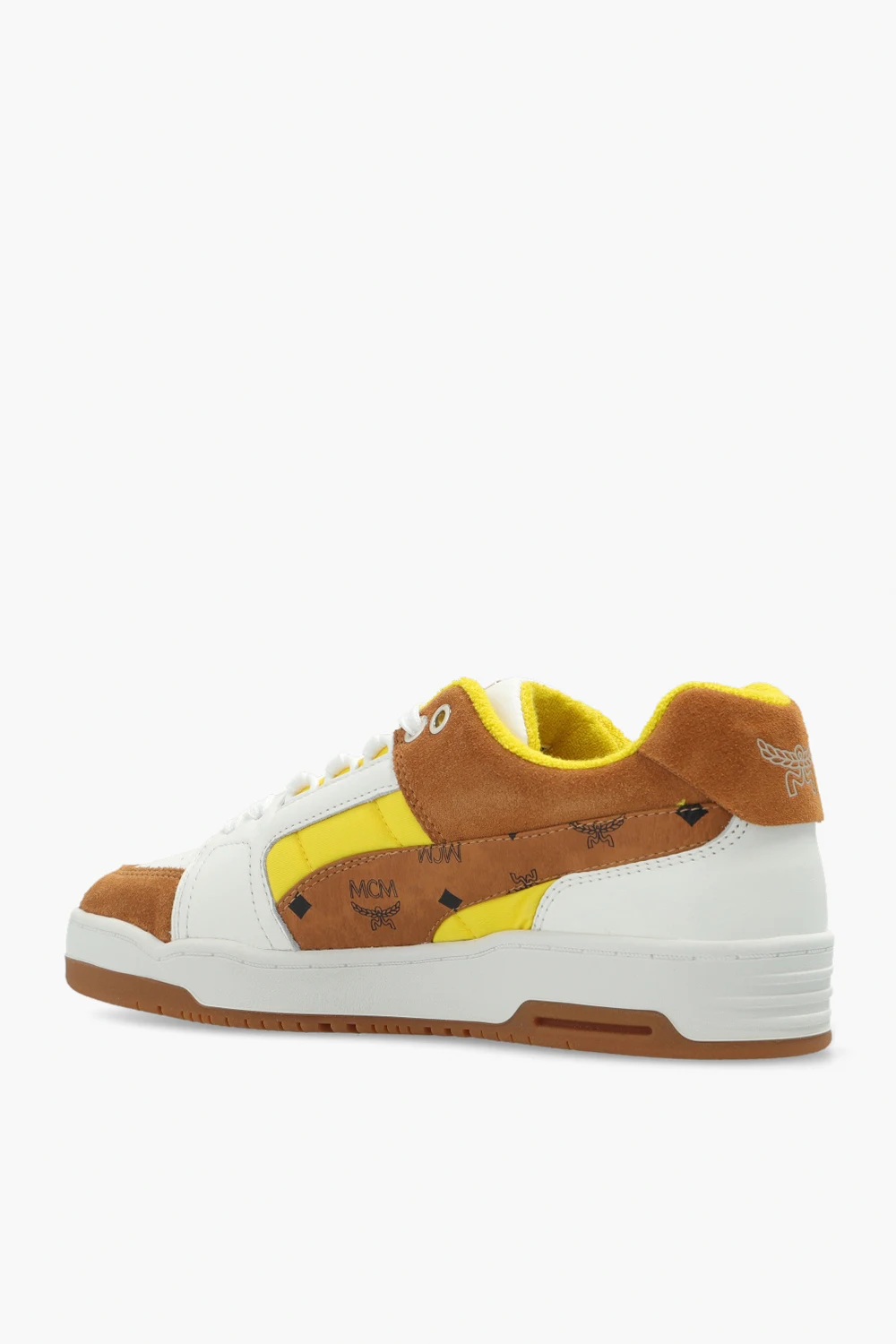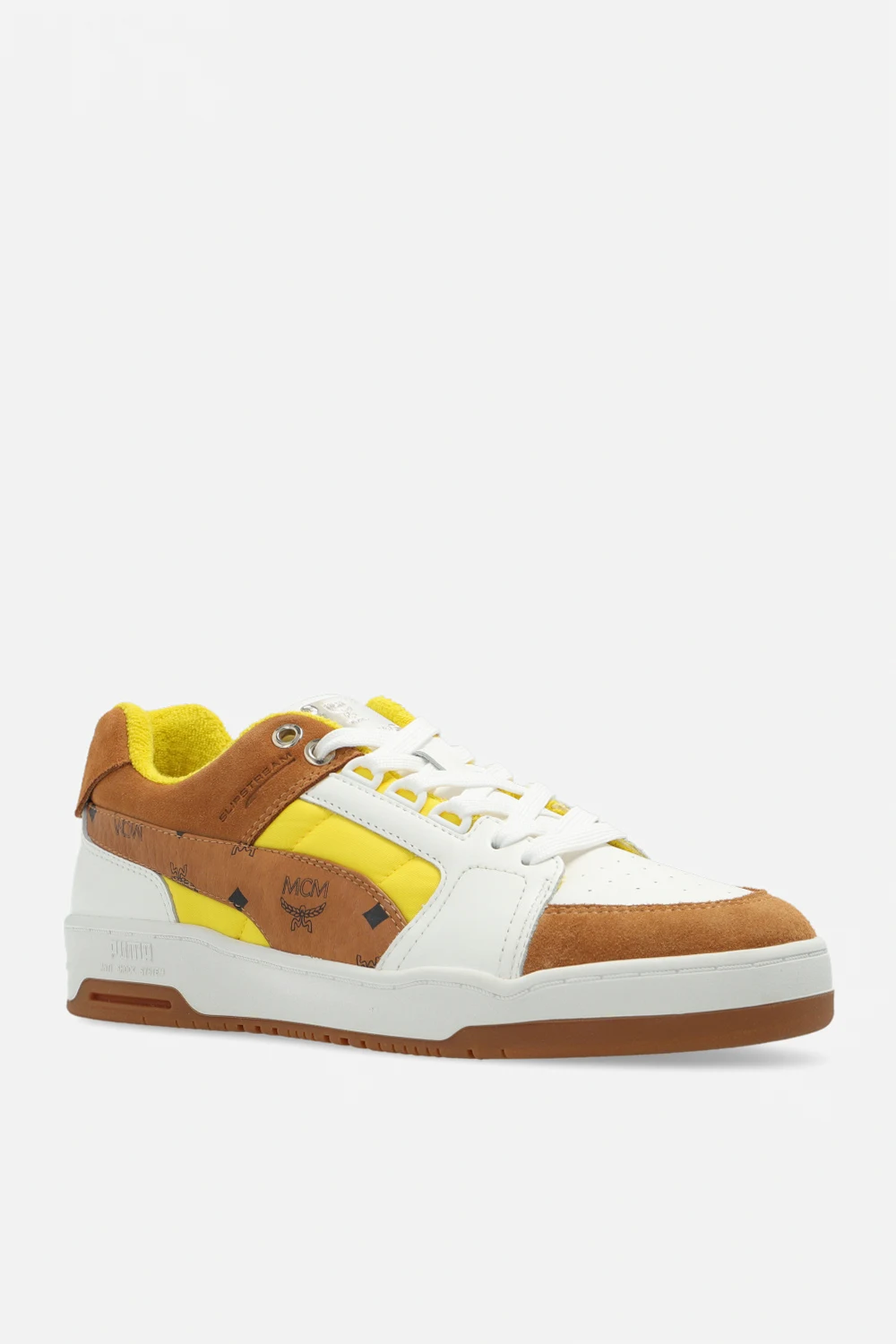 Biało-brązowo-żółte, sznurowane buty sportowe, model ‘Slipstream Lo’ Puma x MCM. Wykonane ze skóry i wykończone zamszem oraz techniczną, pikowaną tkaniną. Na języku metalowa aplikacja z wygrawerowanym logo w kolorze srebrnym. Profil ozdobiony brązową wstawką z charakterystycznego dla marki MCM płótna ‘Visetos’ z nadrukowanym logo w kolorze czarnym. Perforowany przód. Zapiętek ozdobiony nadrukowanym logo w kolorze srebrnym. Wyściółka z żółtego materiału typu ‘frotte’. Biało-brązowa, gumowa podeszwa wyposażona w system ‘ANTISHOCK’.