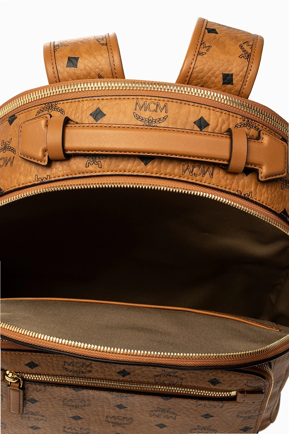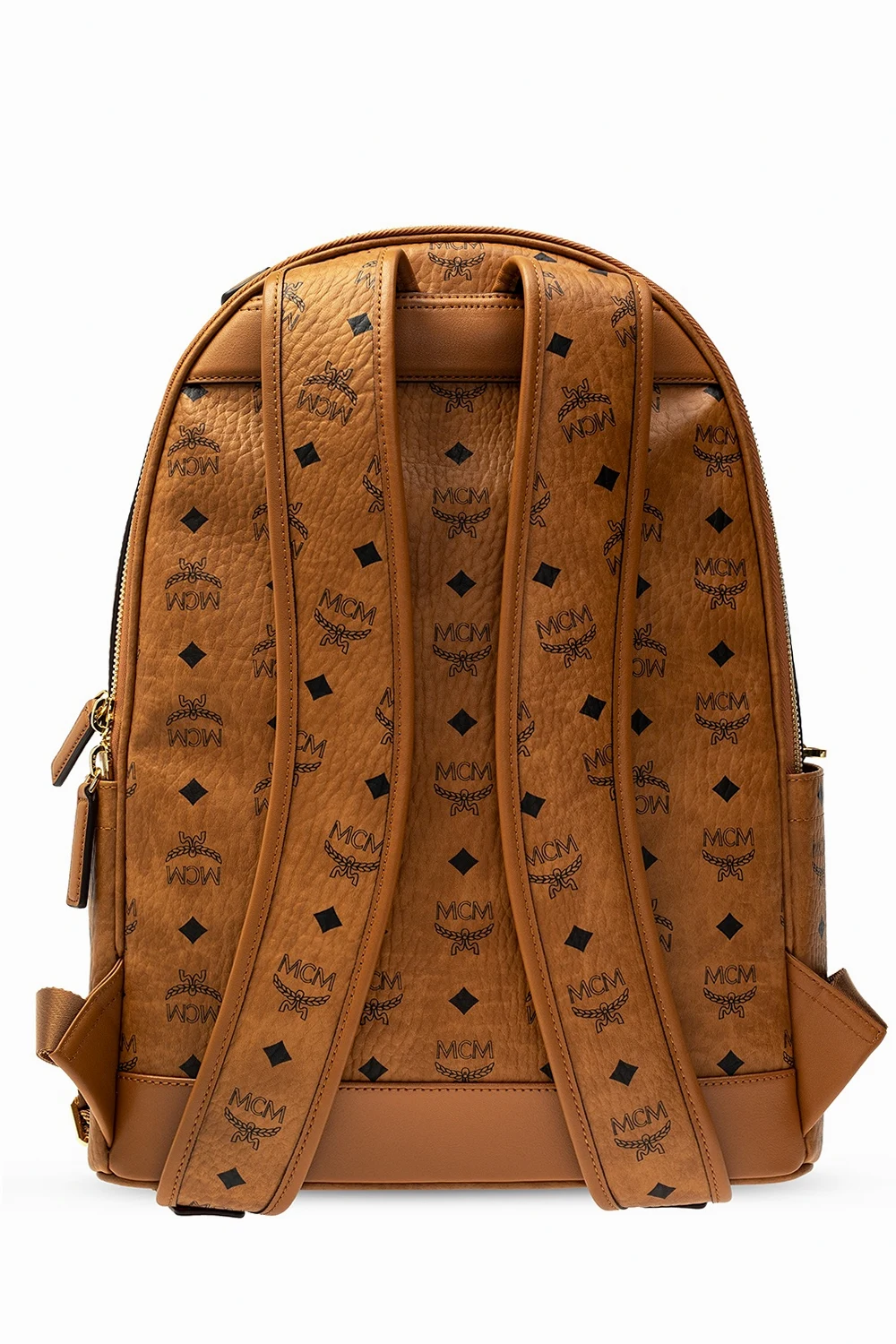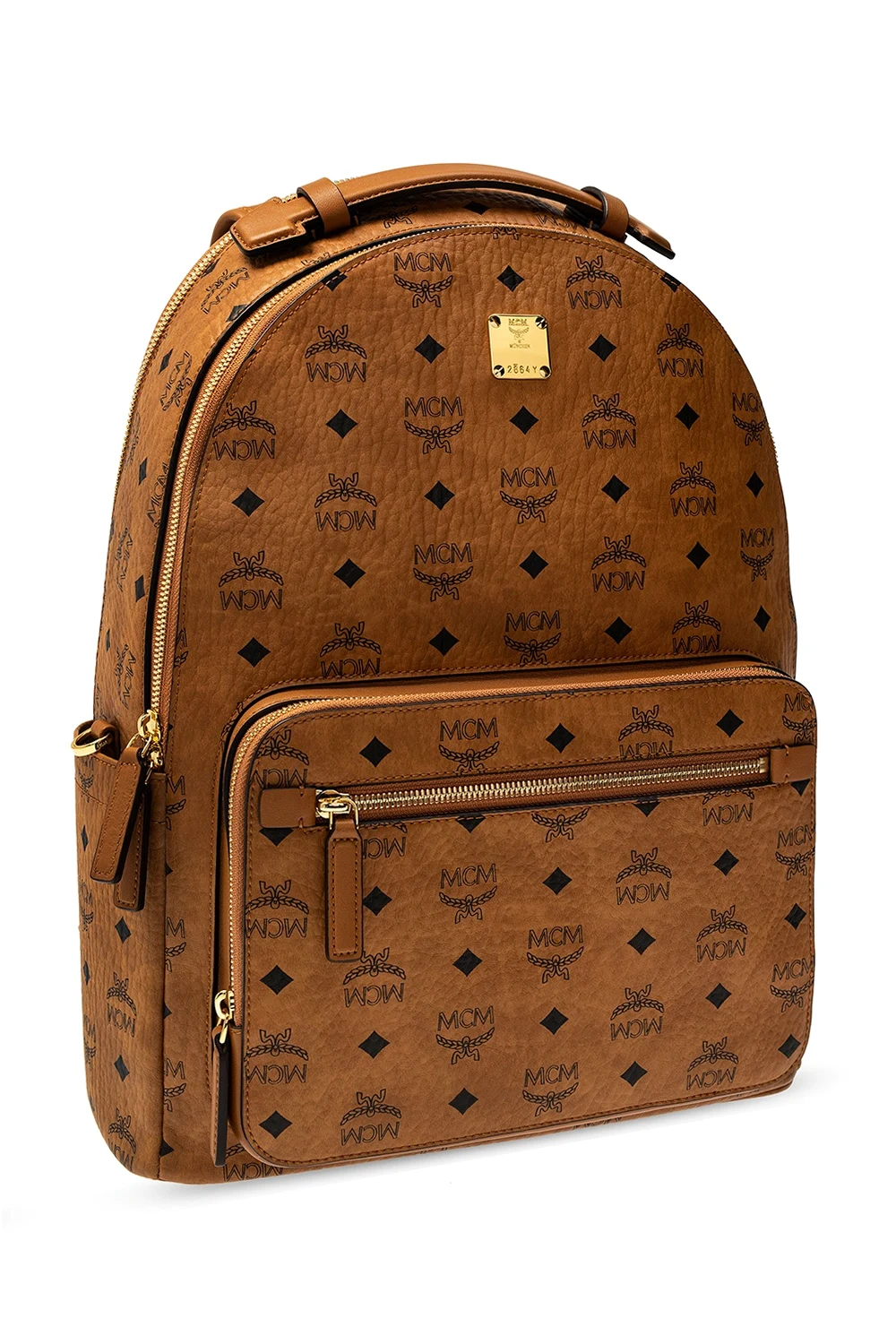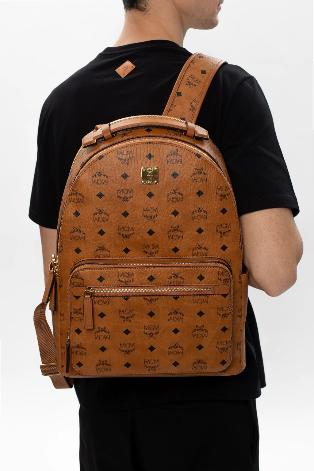 Brązowy plecak MCM. Wykonany z płótna ‘Visetos’. Ozdobiony nadrukowanym wzorem w kolorze czarnym oraz aplikacją z logo. Zamykany na zamek. Szelki z możliwością regulacji długości. Z przodu dwie kieszenie zamykane na zamek i z boku dwie wsuwane. Wewnątrz dwie komory. Jedna wsuwana kieszeń oraz dwie przegrody. Metalowe wykończenie w kolorze złotym.
