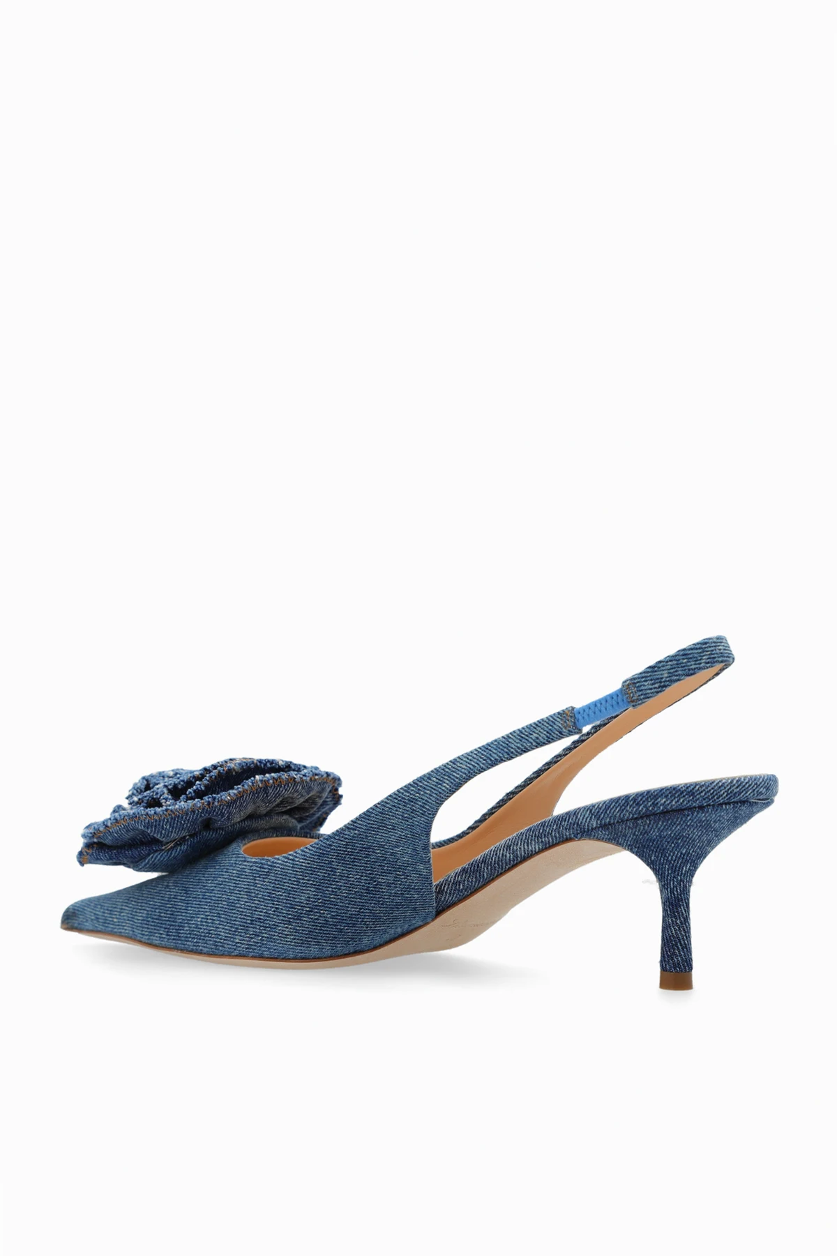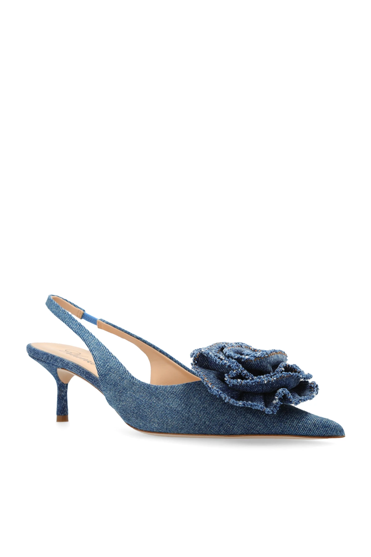 Niebieskie, jeansowe buty na obcasie, model ‘Tea’ Blumarine. Z tyłu zapinane na regulowany pasek. Nosek w szpic ozdobiony aplikacją w kształcie róży. Beżowa, skórzana podeszwa.