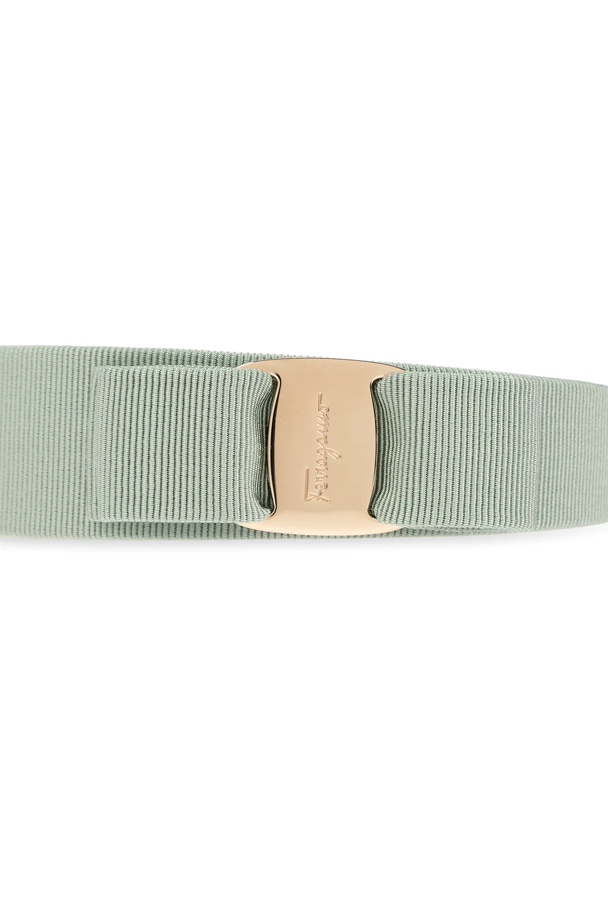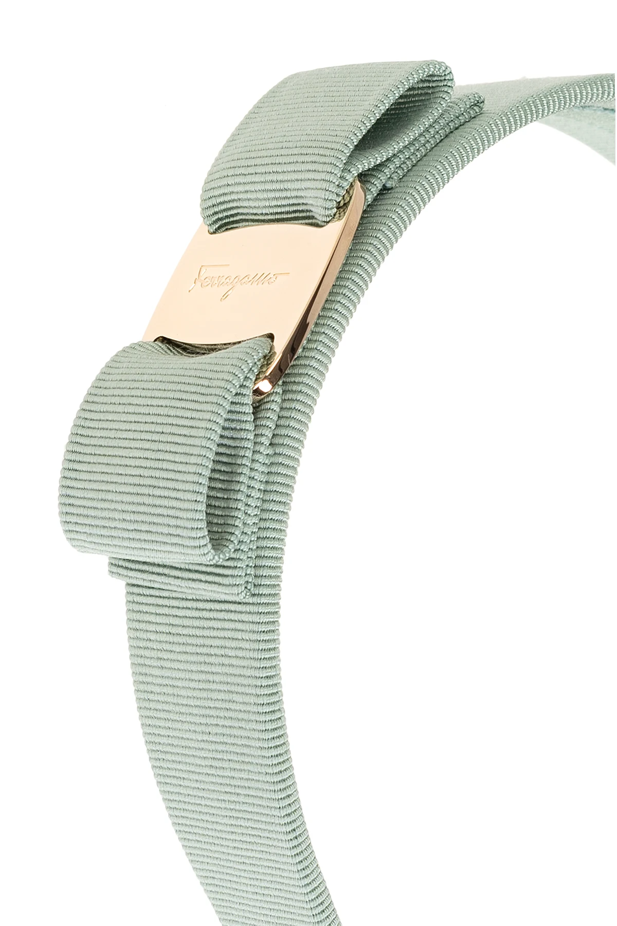Jasnozielona opaska na głowę FERRAGAMO. Wykonana z prążkowanego materiału. Ozdobiona dekoracyjną kokardą z mosiężną aplikacją w kolorze złotym z wygrawerowanym logo.