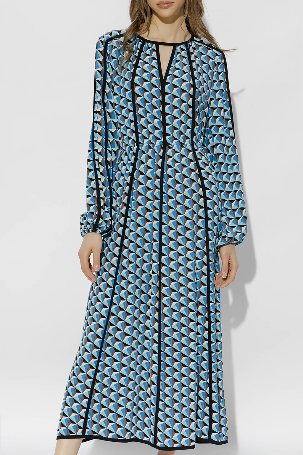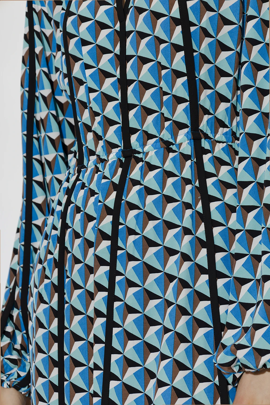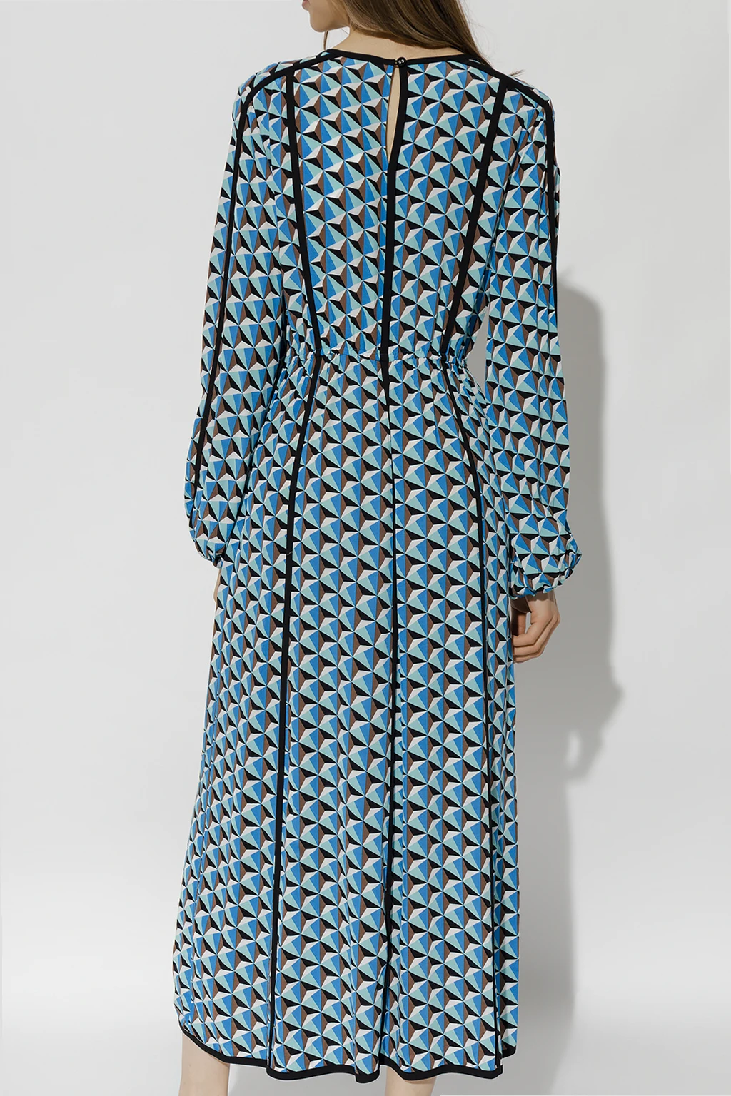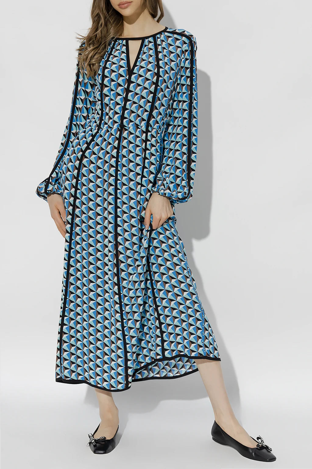 Kolorowa sukienka, model ‘Scott’ Diane Von Furstenberg. Z tyłu wycięcie zapinane na guzik. W talii wszyty ściągacz. Ozdobiona wzorem z motywem geometrycznym. Okrągły dekolt z wycięciem w szpic. Długie, bufiaste rękawy zakończone ściągaczem. Dwie wsuwane kieszenie. Rozszerzany dół. Dekoracyjne wykończenie lamówkami w kolorze czarnym.