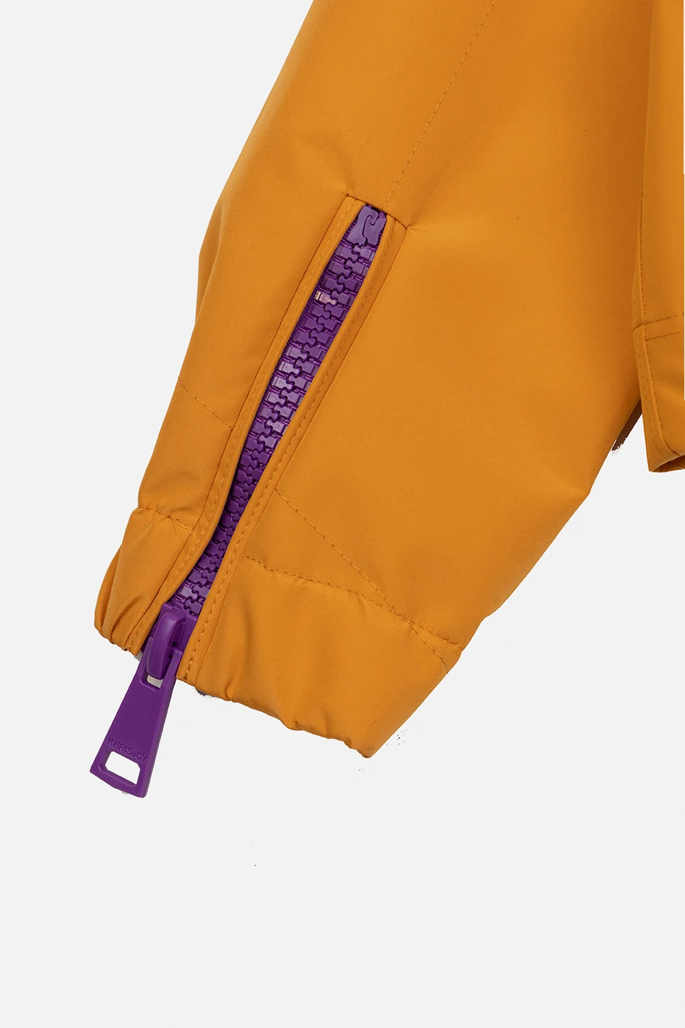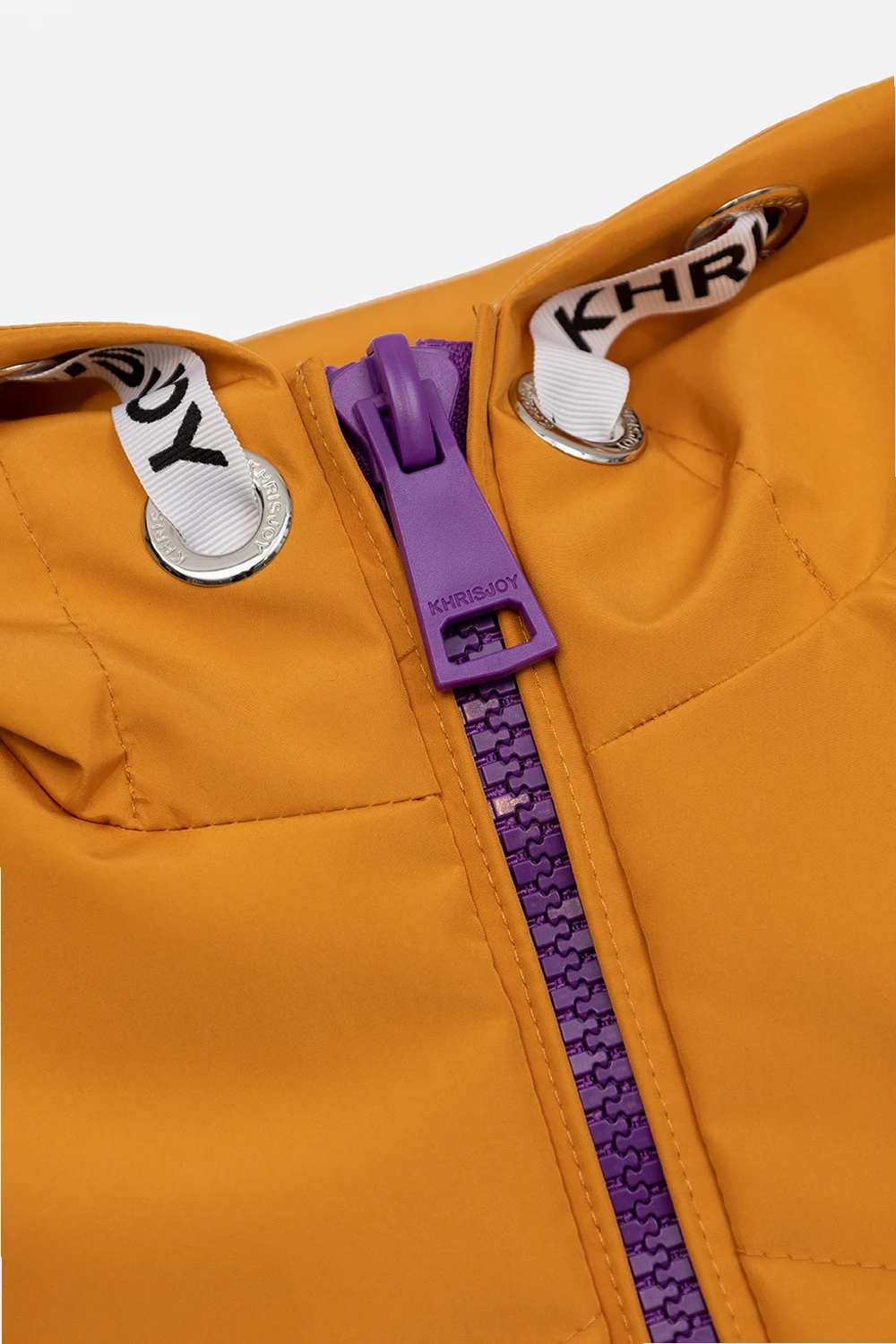 Pomarańczowa, krótka kurtka wiatrówka Khrisjoy Kids. Przód i rękawy z zapięciem na zamek. Kaptur i dół ściągane trokami. Dwie wsuwane kieszenie.