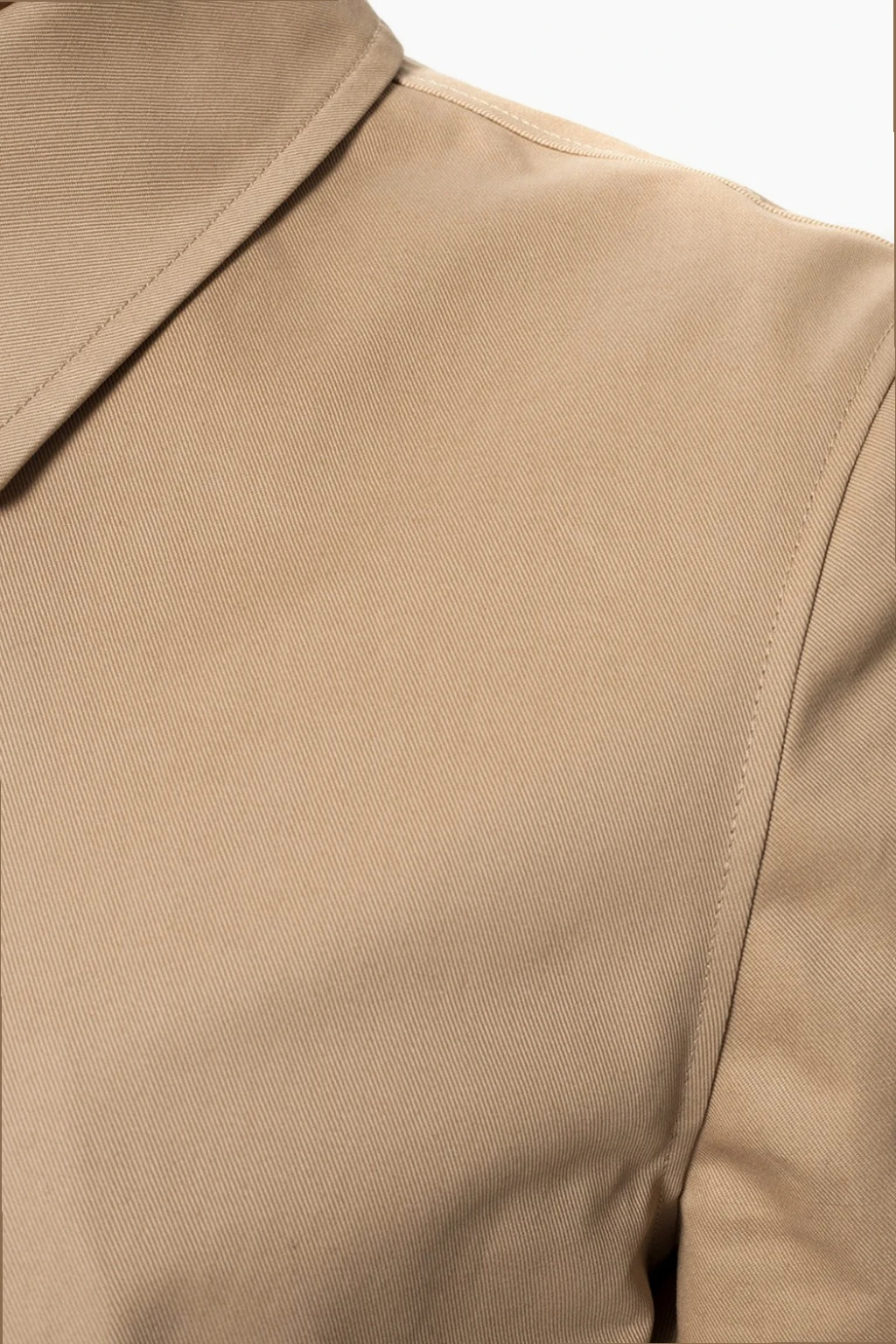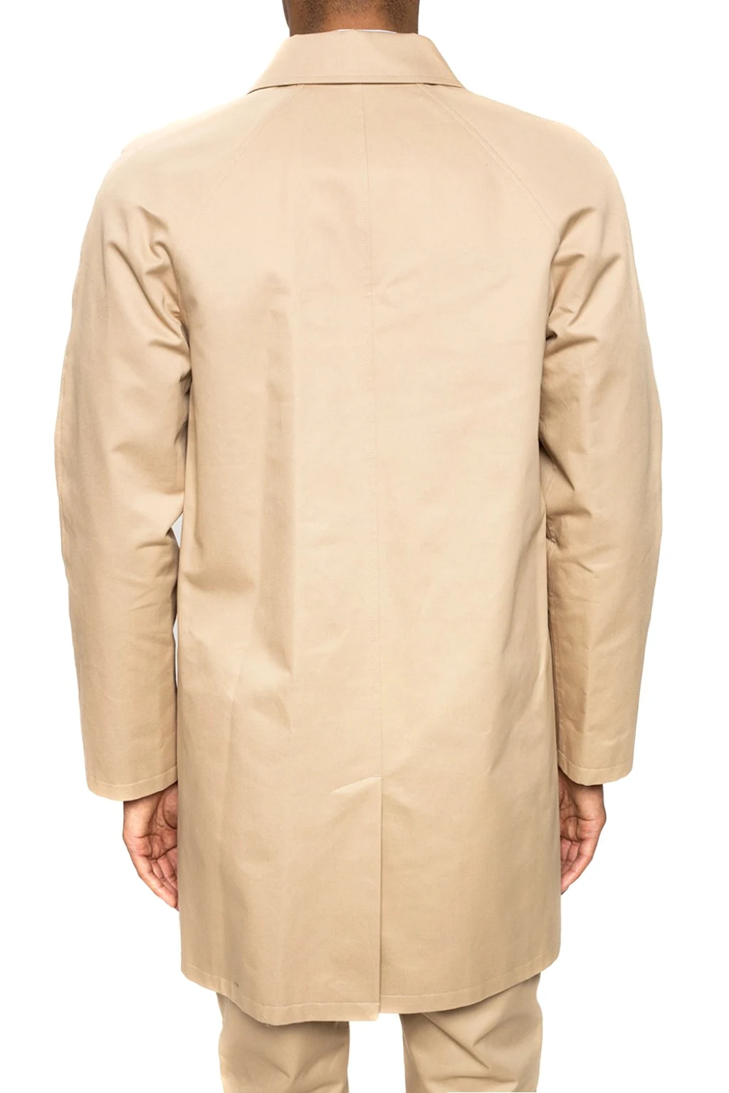 Beżowy, bawełniany trencz z pojedynczym rozcięciem A.P.C. Zapinany na guzki z krytą plisą. Z przodu dwie kieszenie. Długie rękawy.