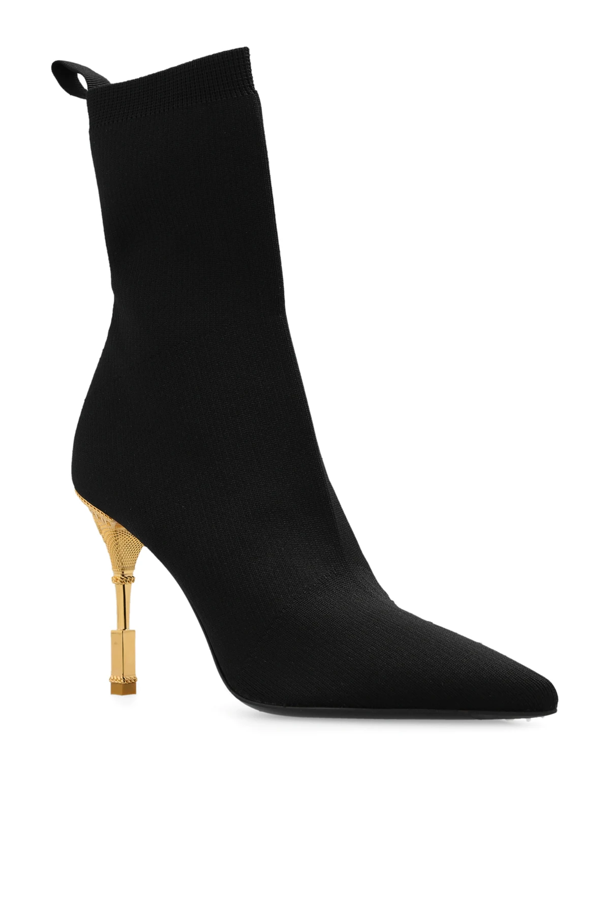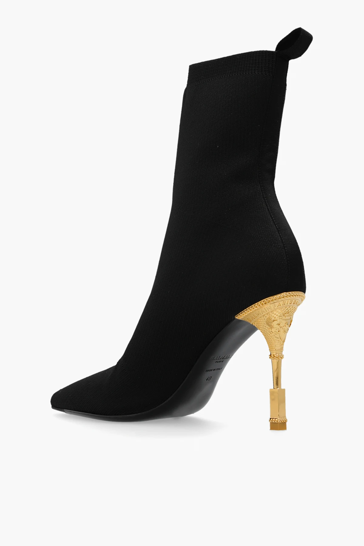 Czarne, wsuwane botki na obcasie ze skarpetą, model ‘Moneta’ Balmain. Wykonane z elastycznego materiału. Nosek w szpic. Dekoracyjny obcas w kolorze złotym z wygrawerowanym wzorem i logo. Czarna, skórzana podeszwa.